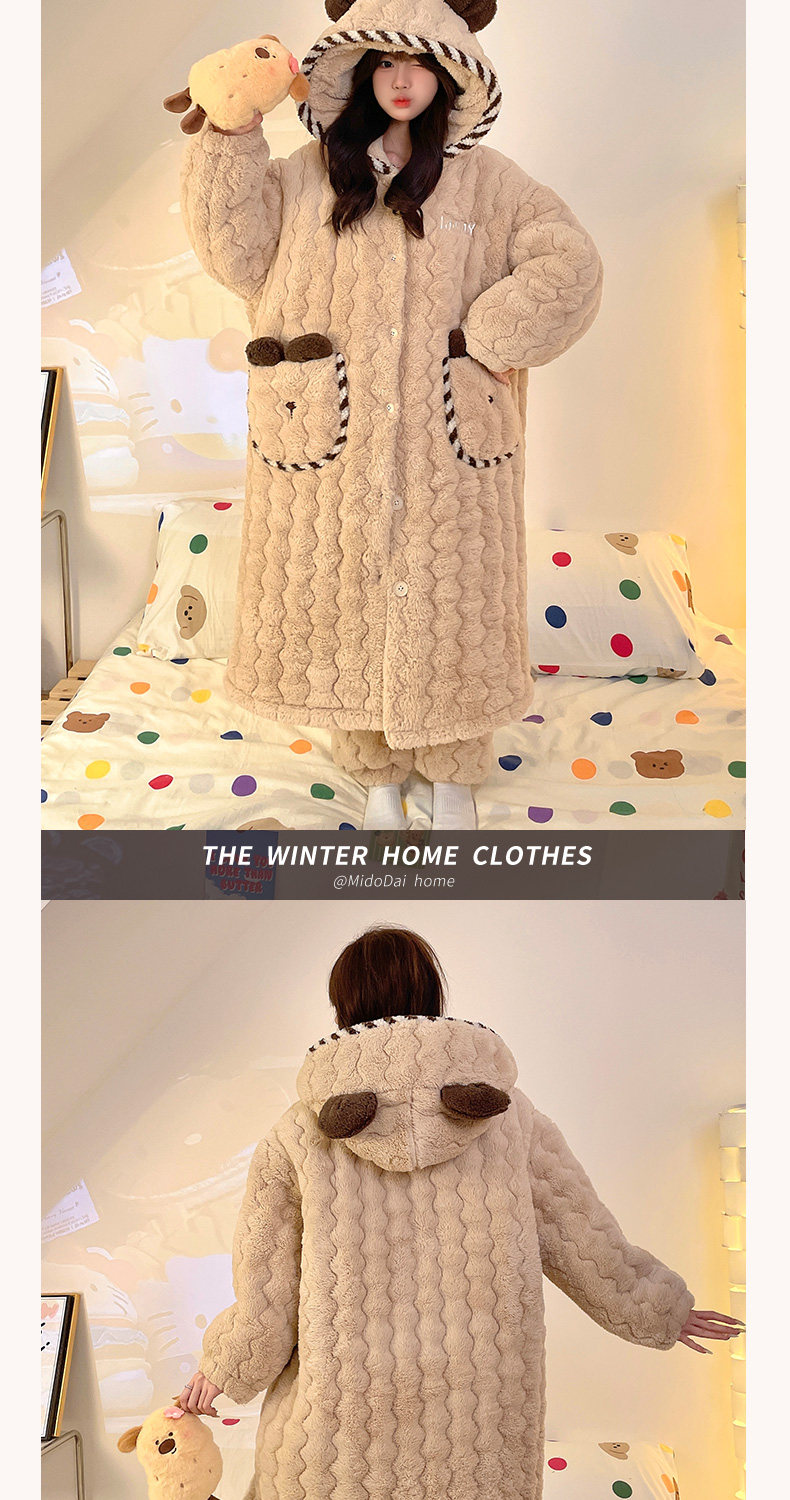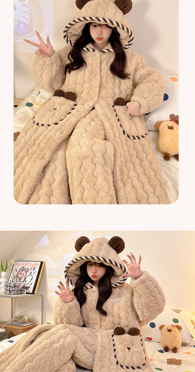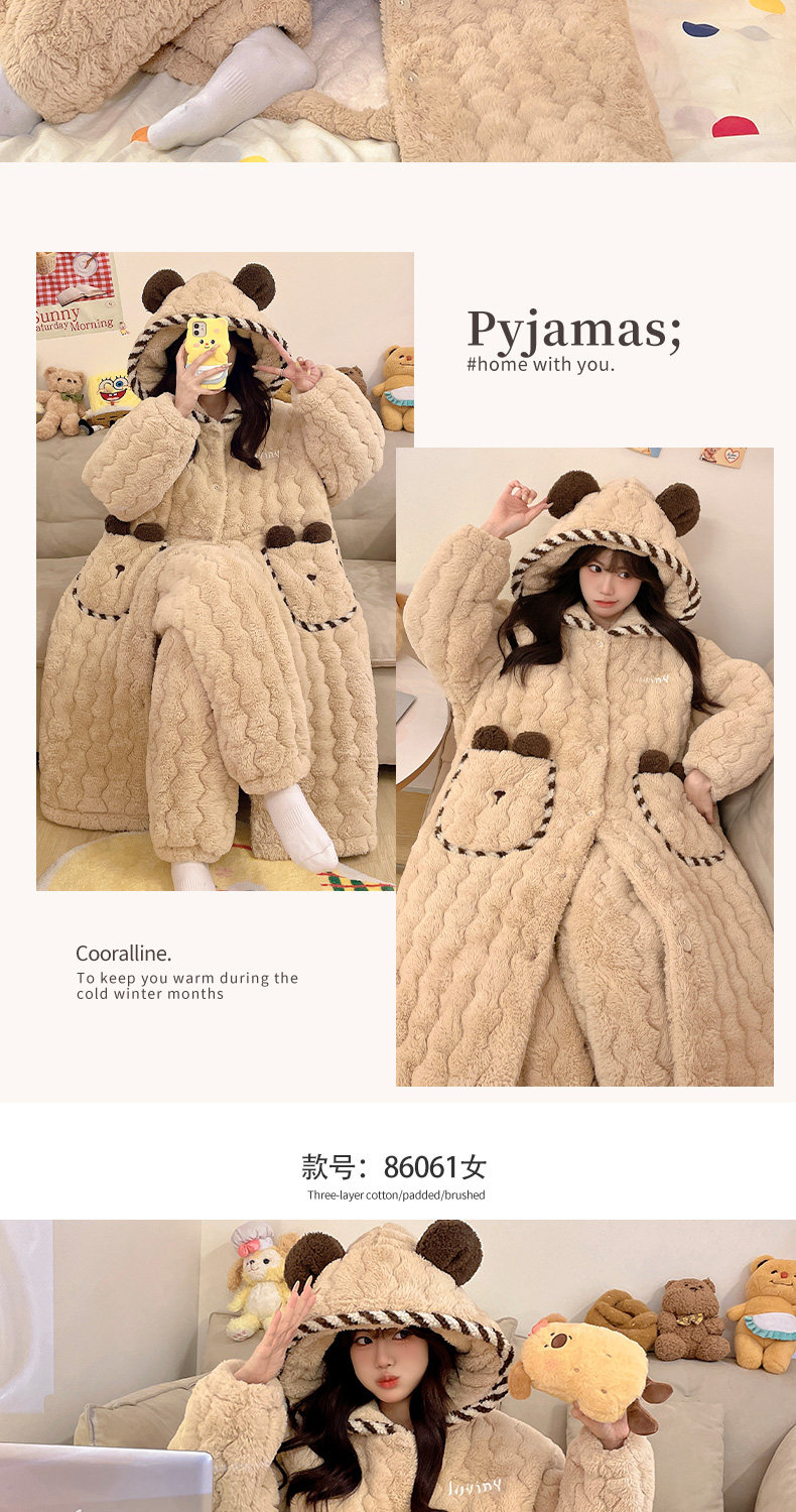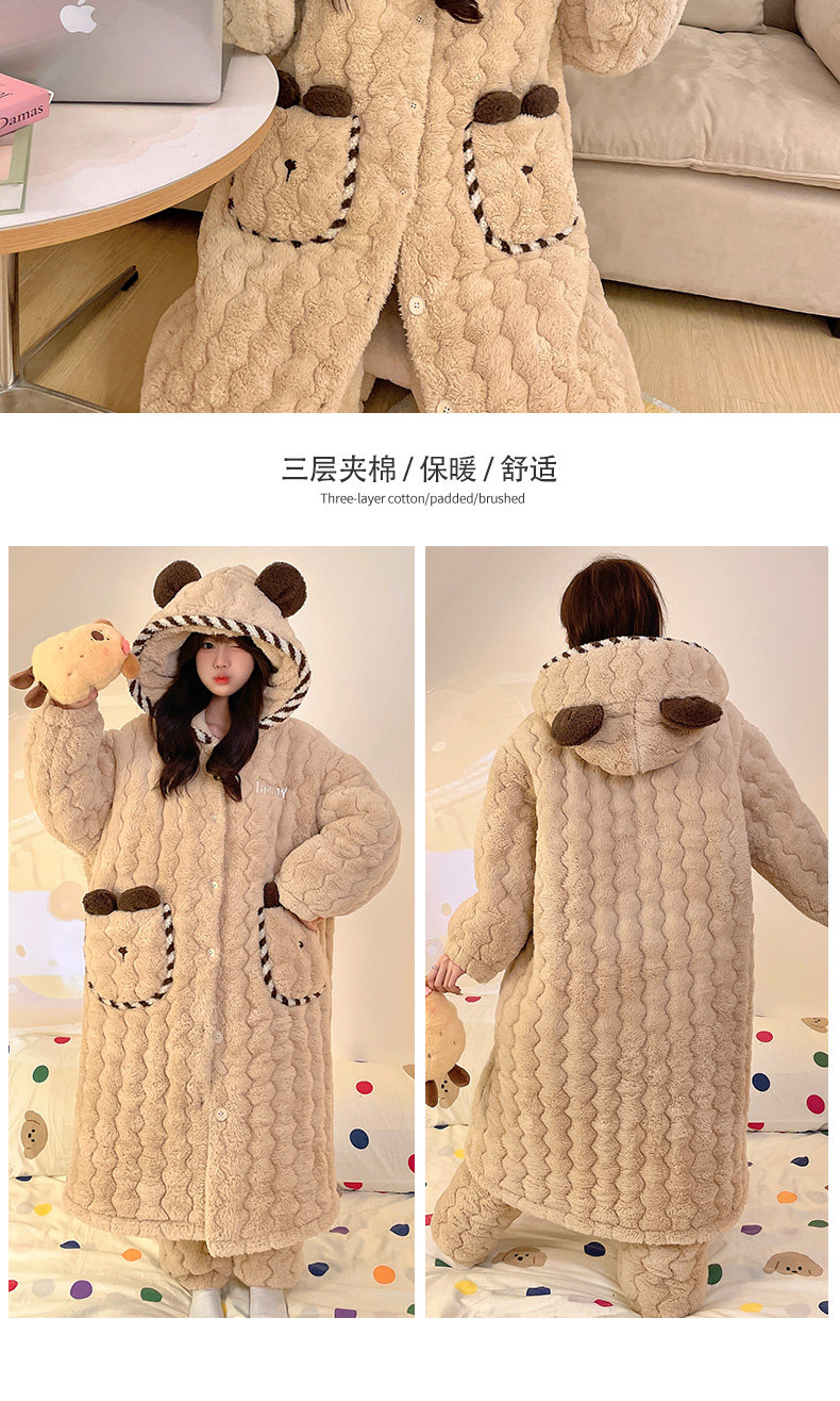 Three-Layer Quilted Coral Fleece Plus Velvet Thickened Autumn and Winter New Women's Robe Large Size Pajama Set Loungewear