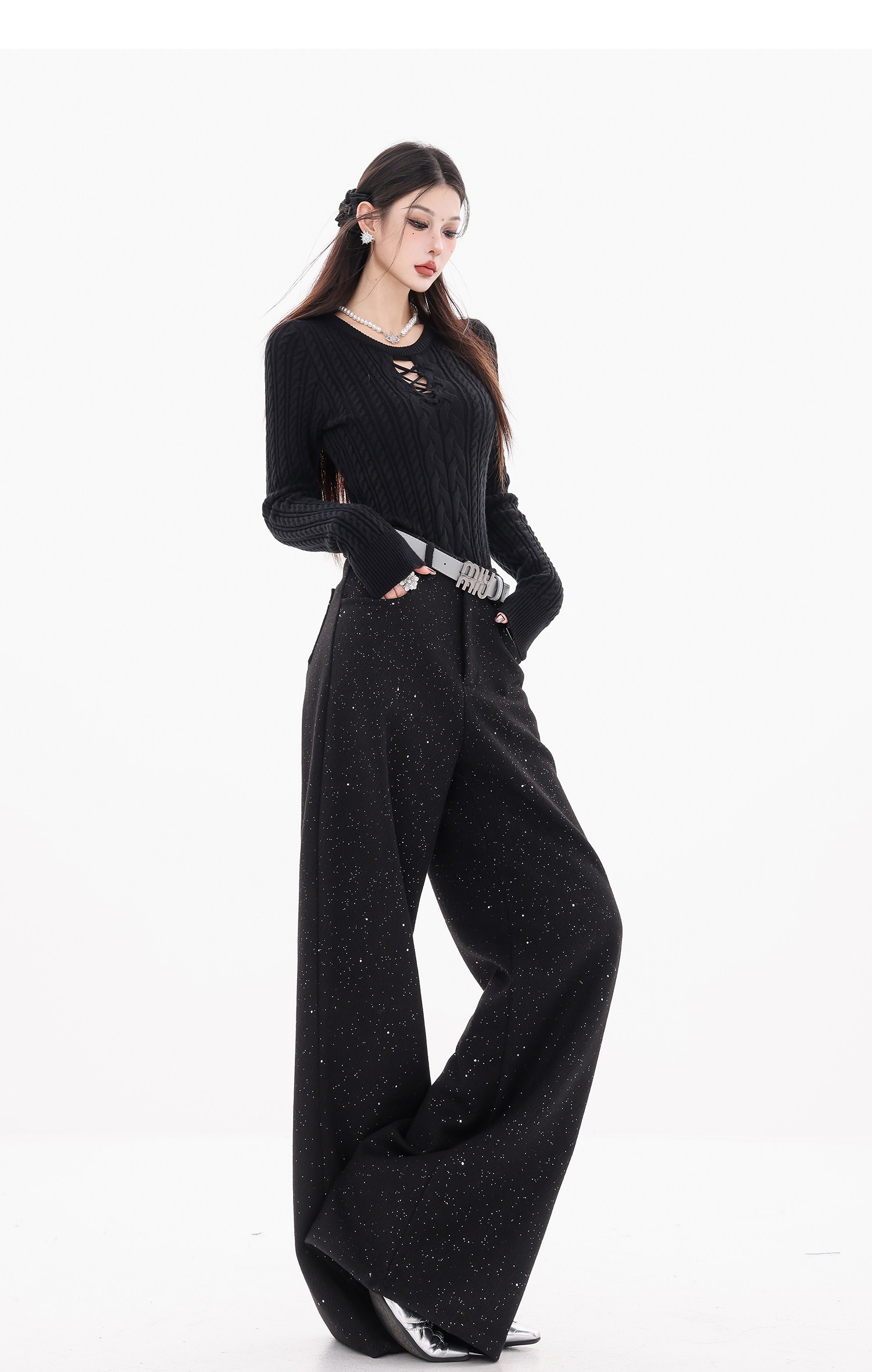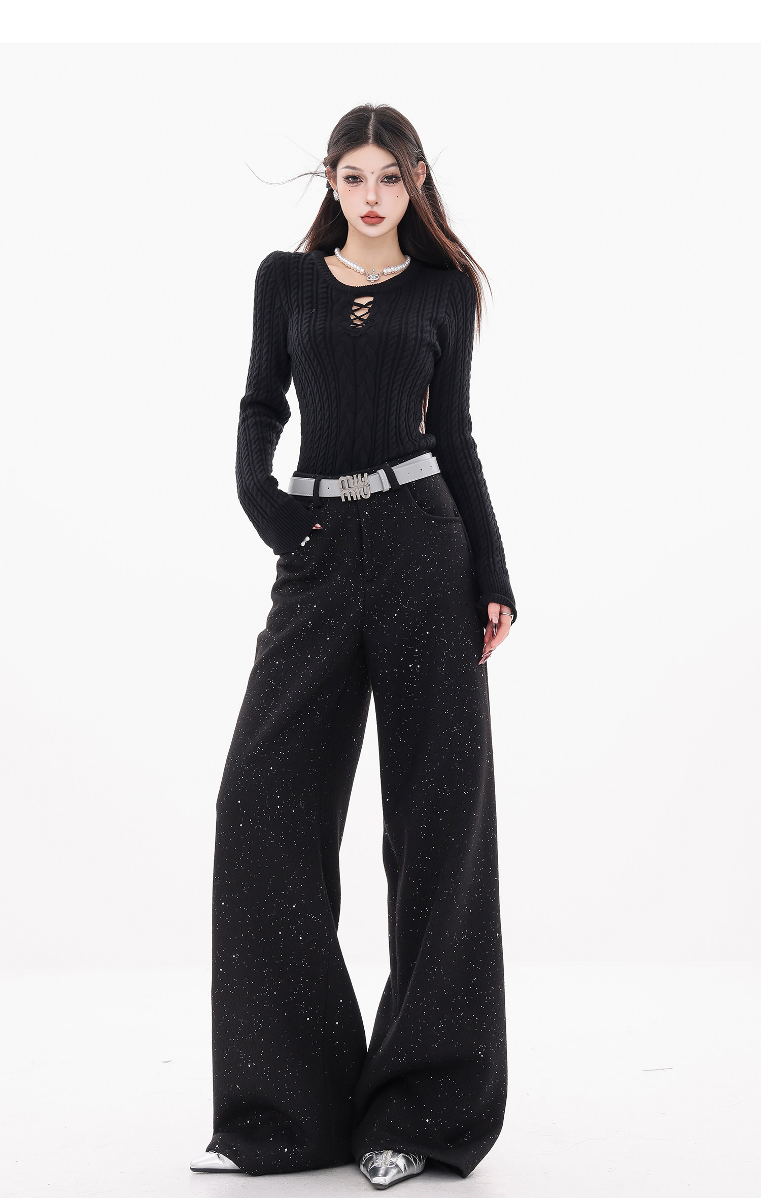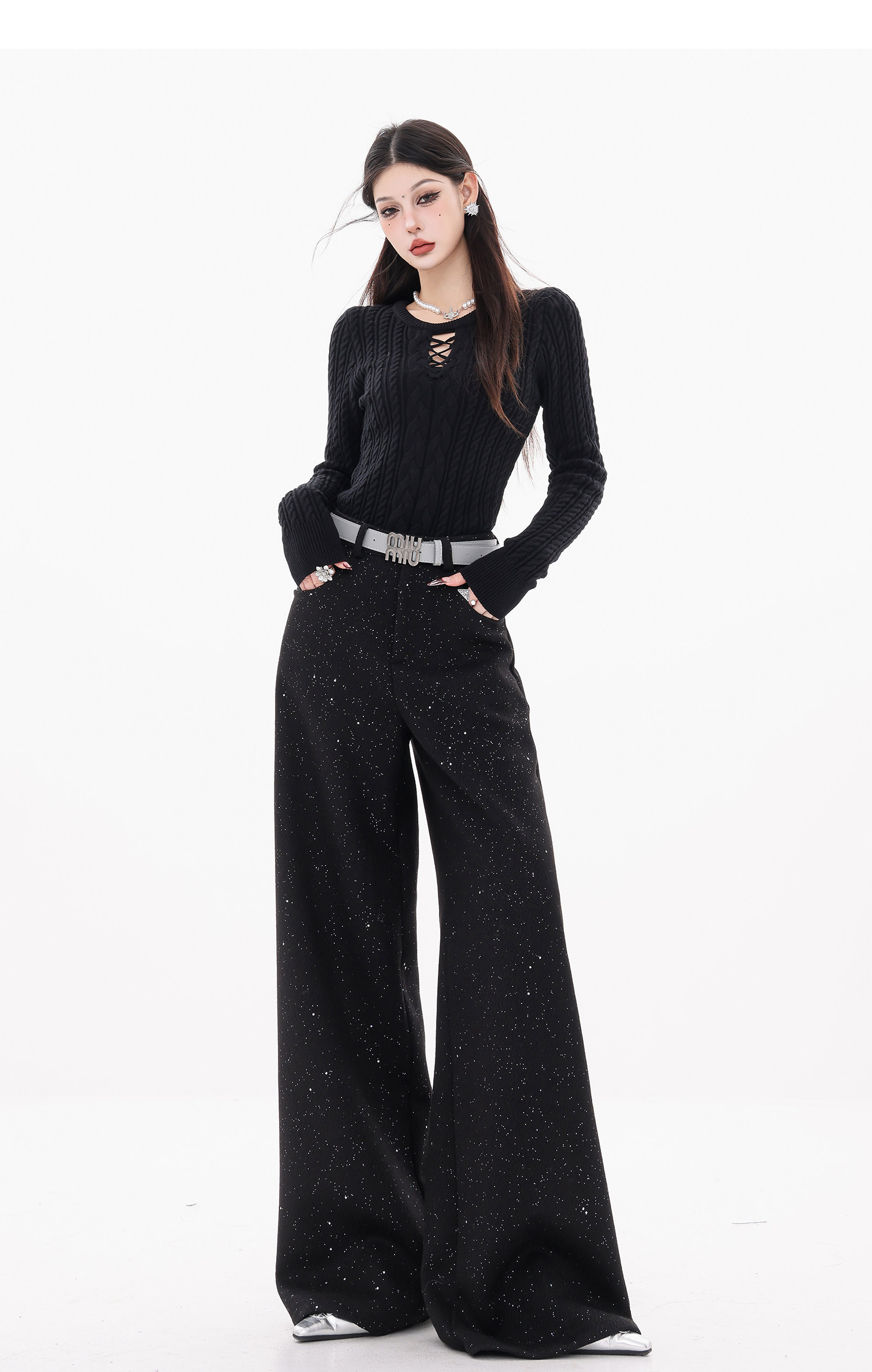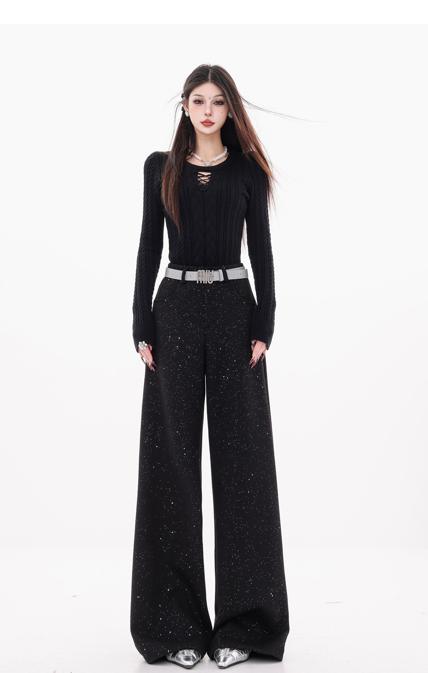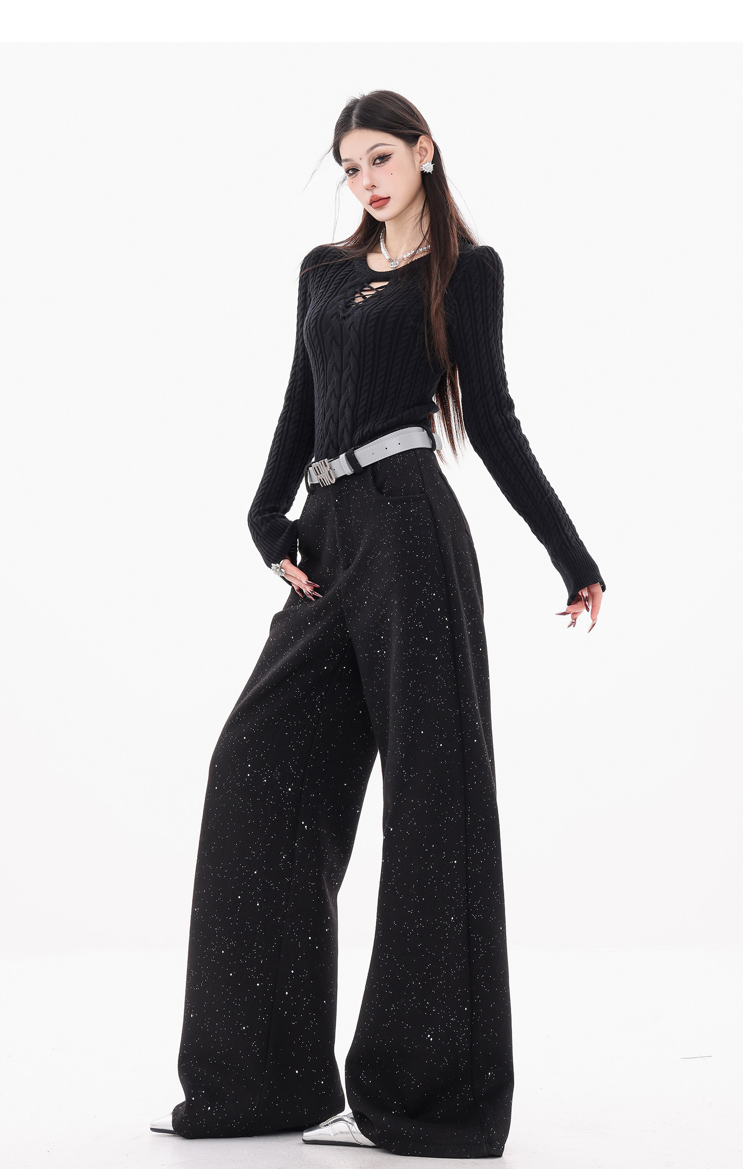 Abwear St. Luoyue Night-Original Black Woolen Sequin Suit Pants Women's 2024 Autumn and Winter Wide Leg Straight-Leg Pants
