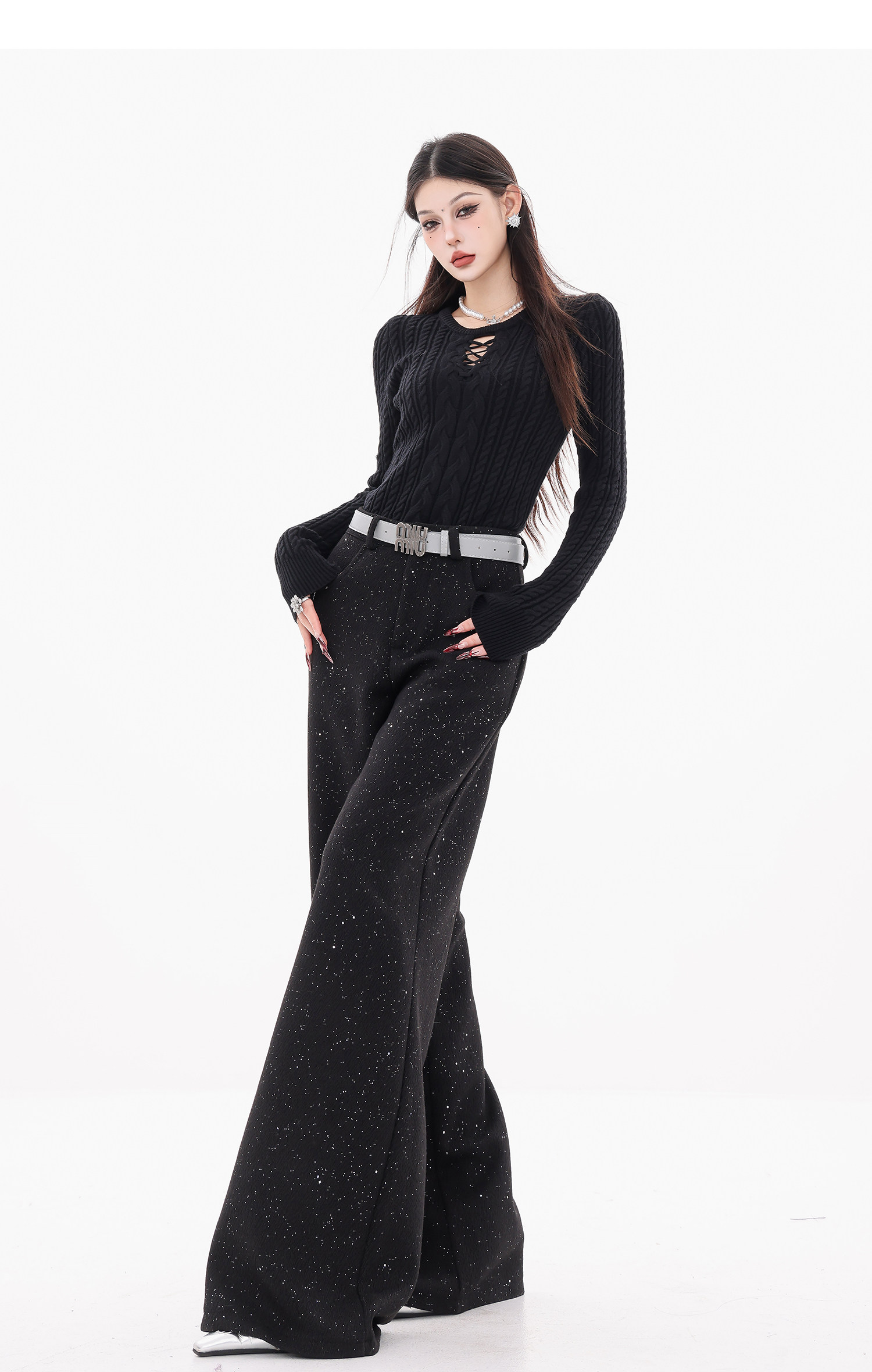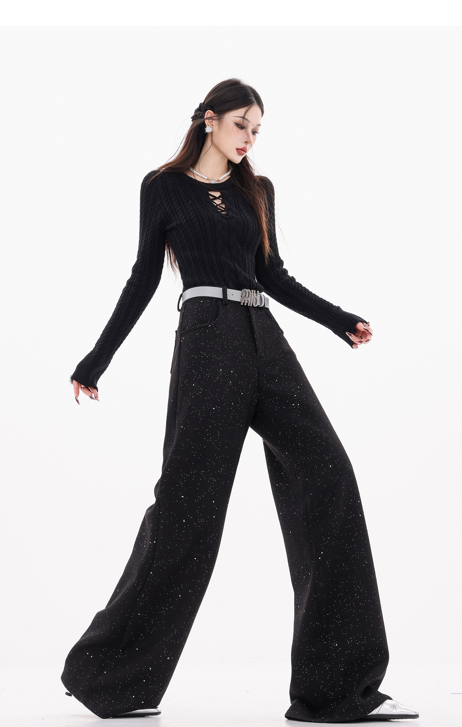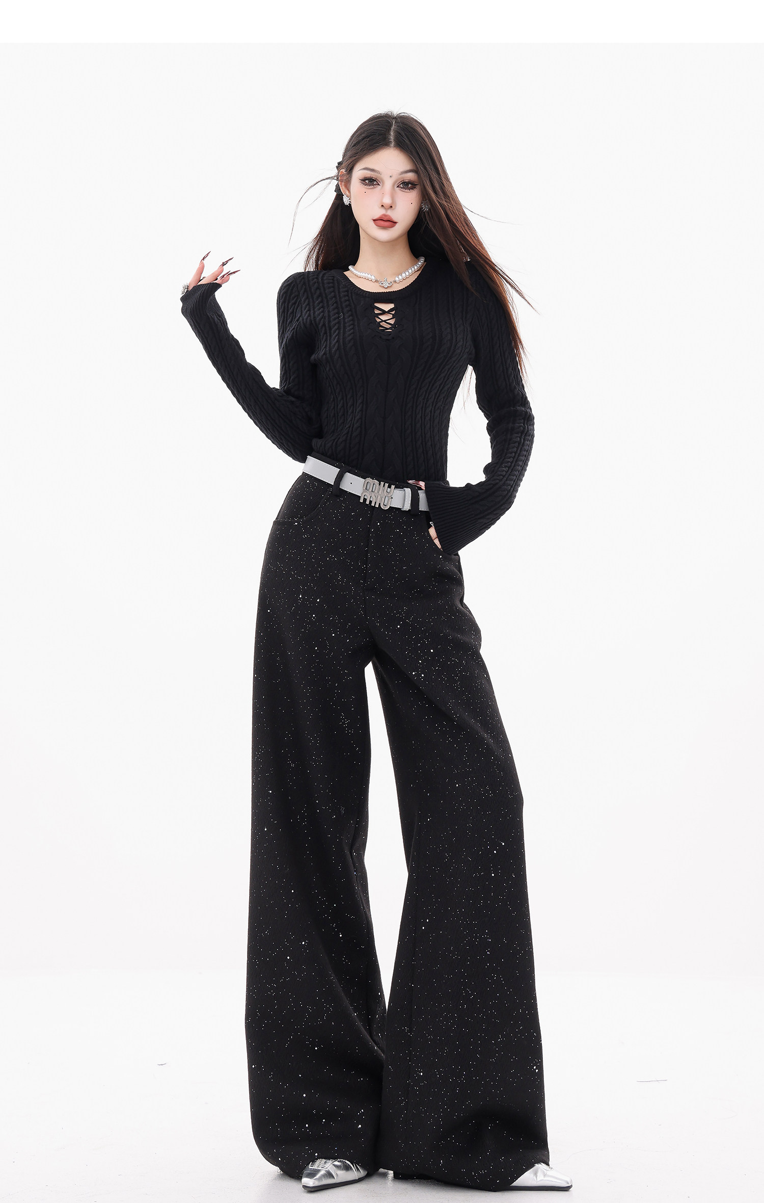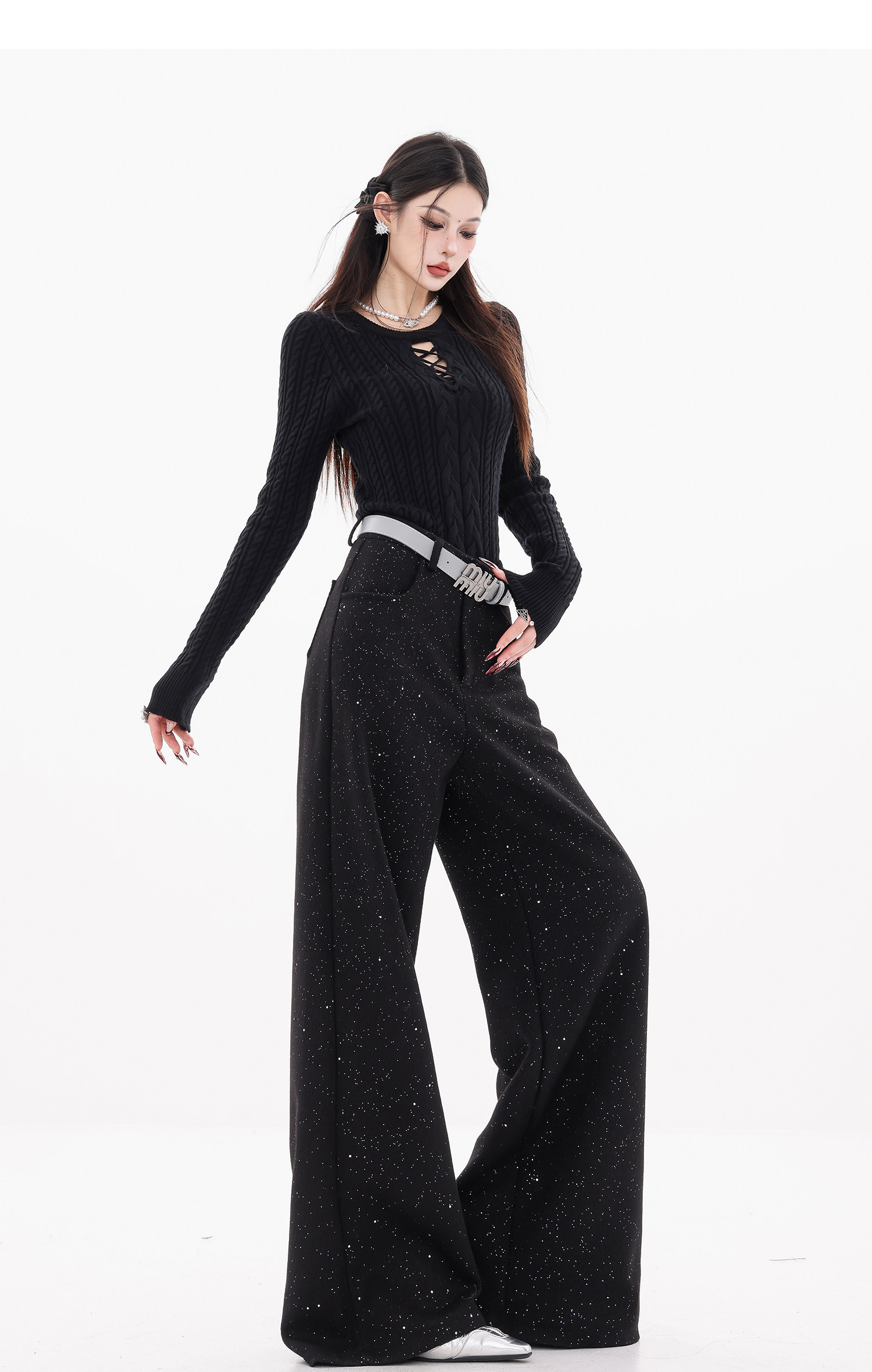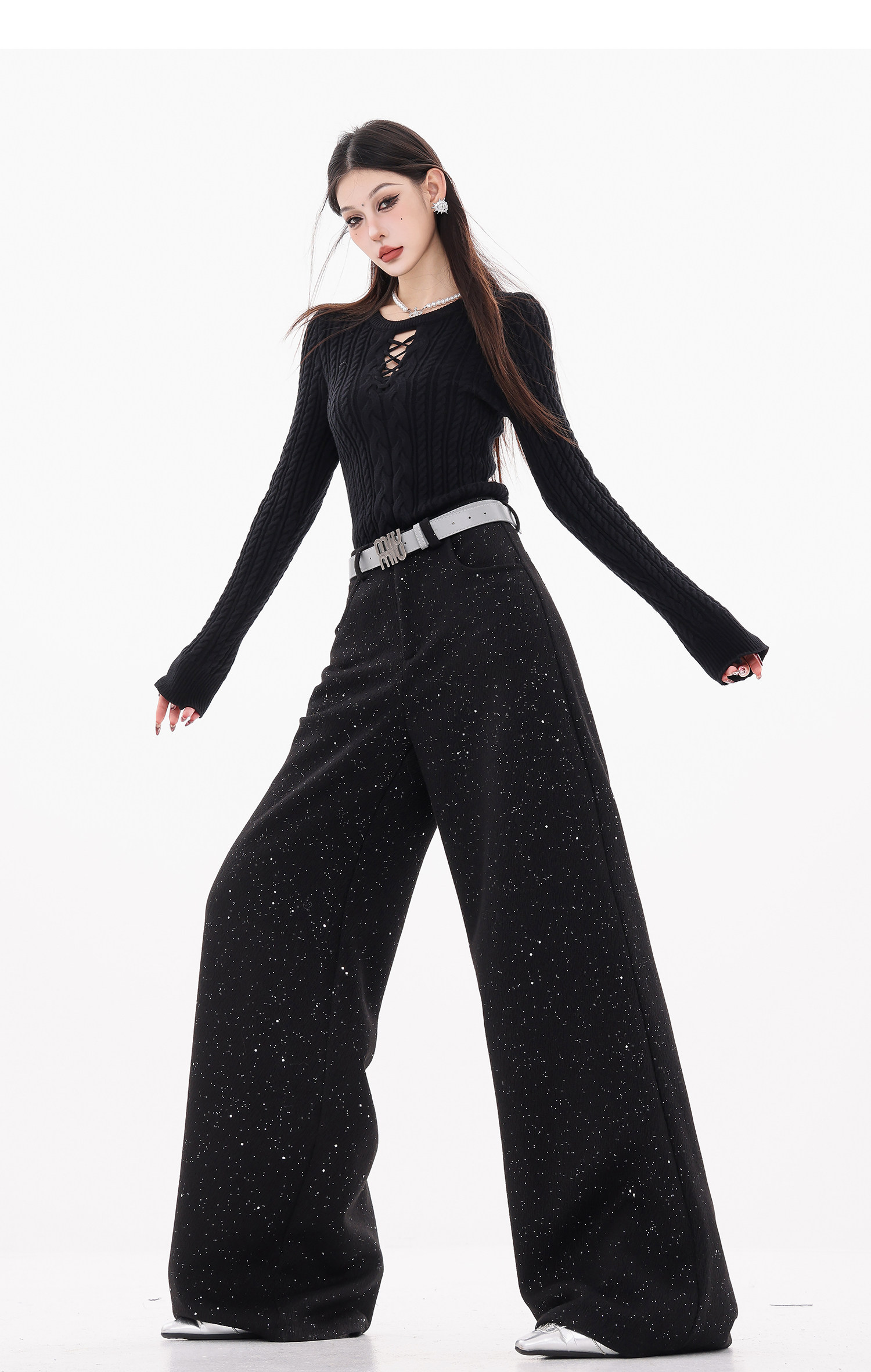 Abwear St. Luoyue Night-Original Black Woolen Sequin Suit Pants Women's 2024 Autumn and Winter Wide Leg Straight-Leg Pants