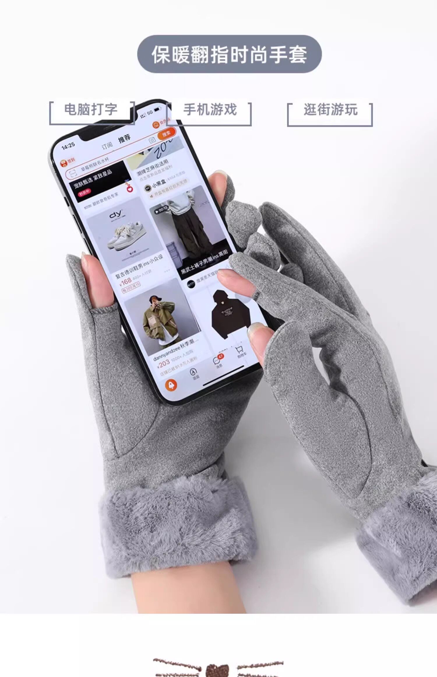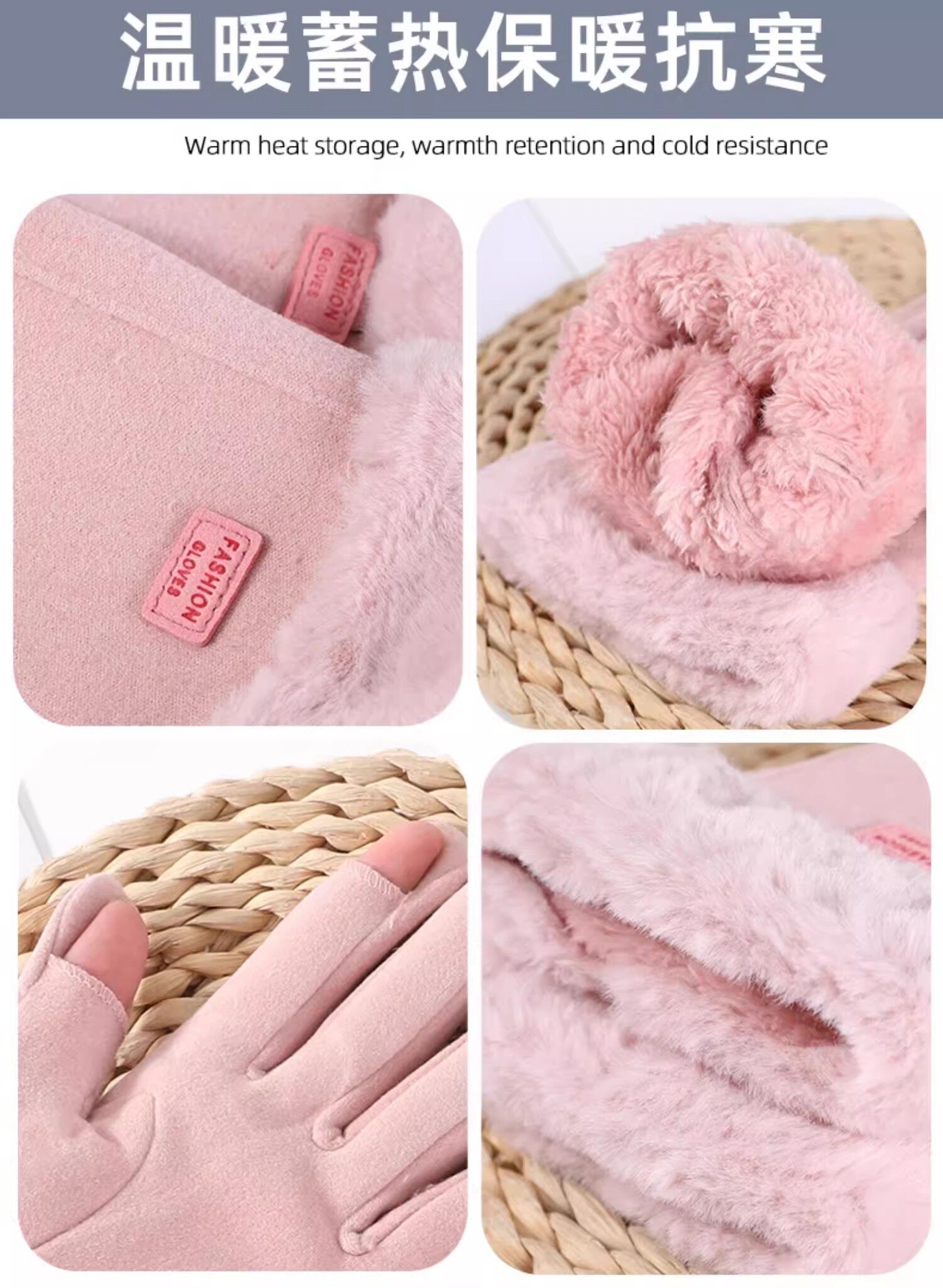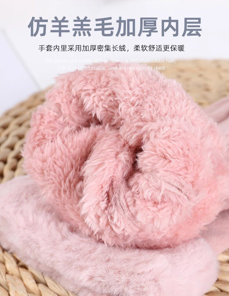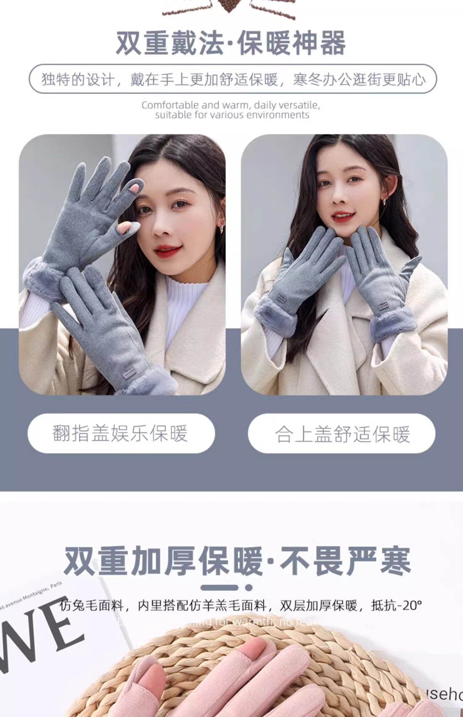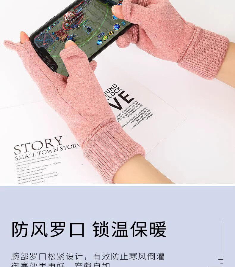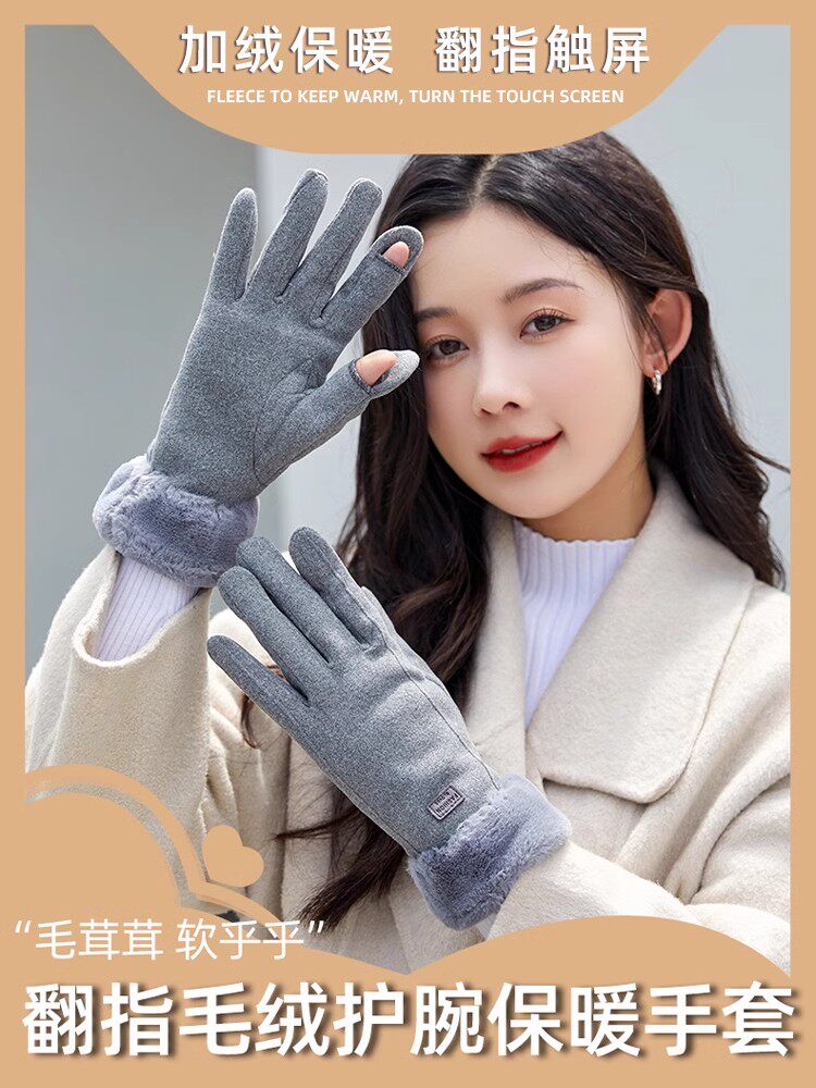 Women's new winter gloves for students with flip-top revealing two-finger touch screen leaking fingers plus velvet and thickening to keep warm and cold-proof for riding
