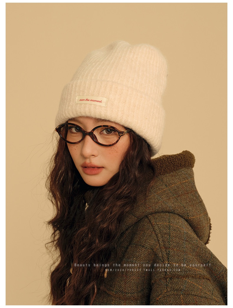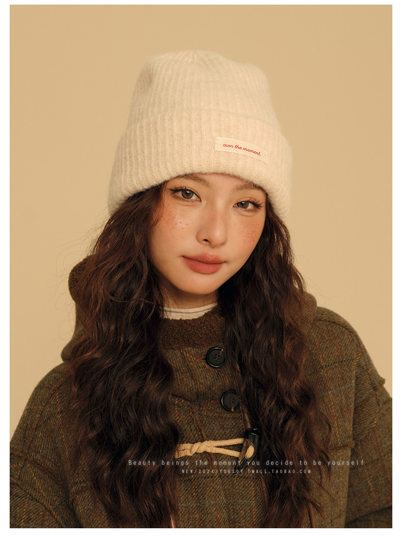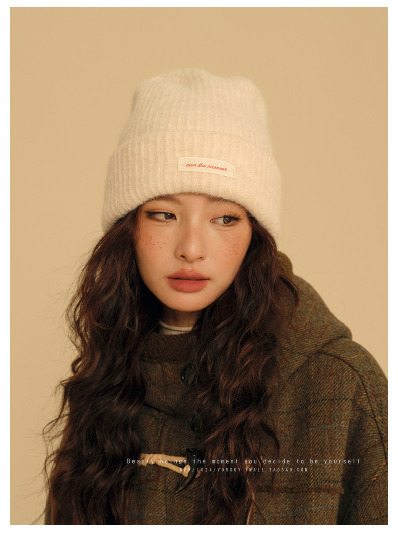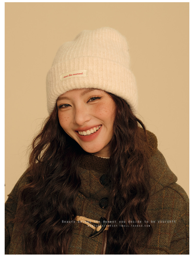 Wool Off-White College-Style Knitted Beanie for Women, Winter Warm Thickened Ear-Protecting Slouchy Hat