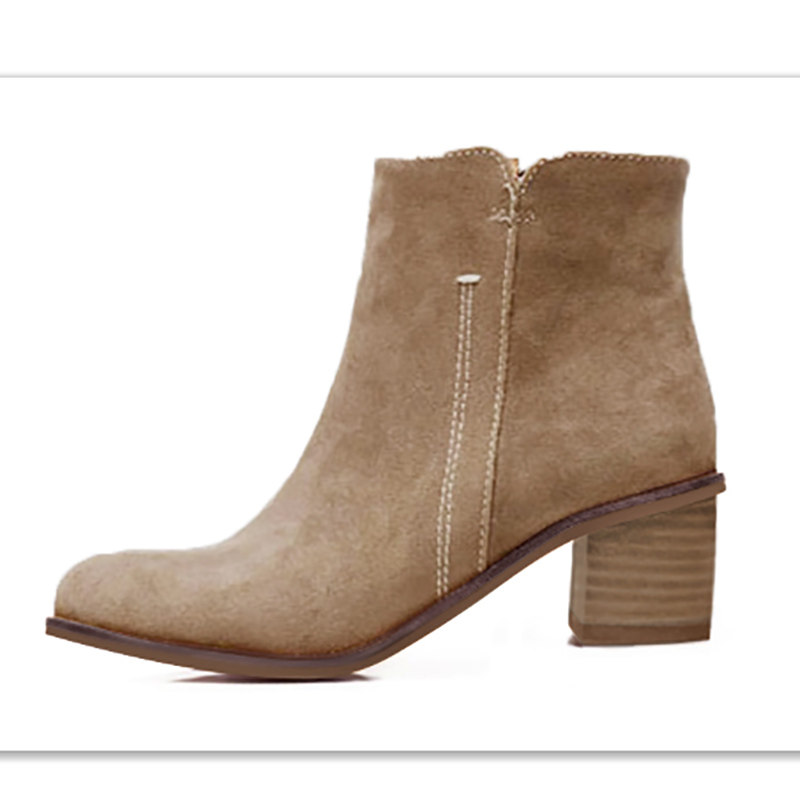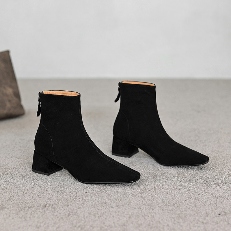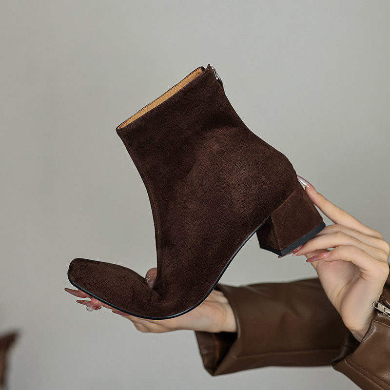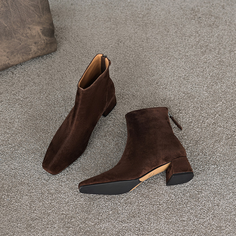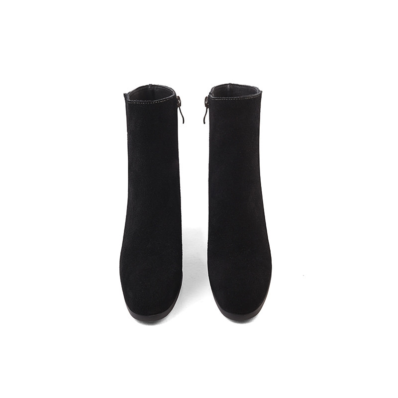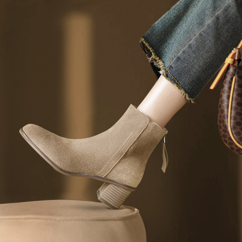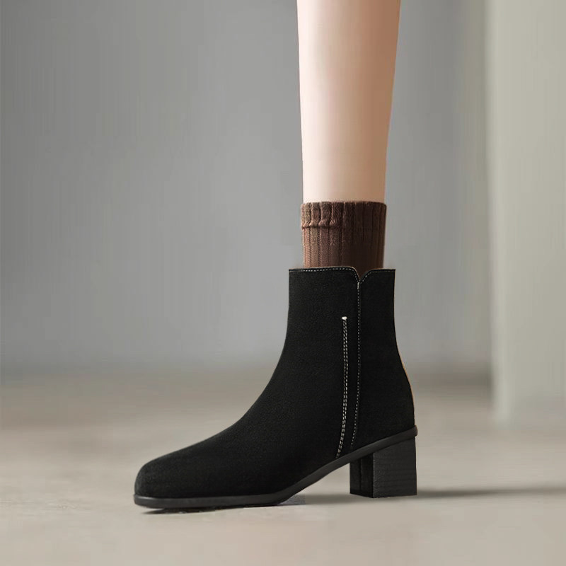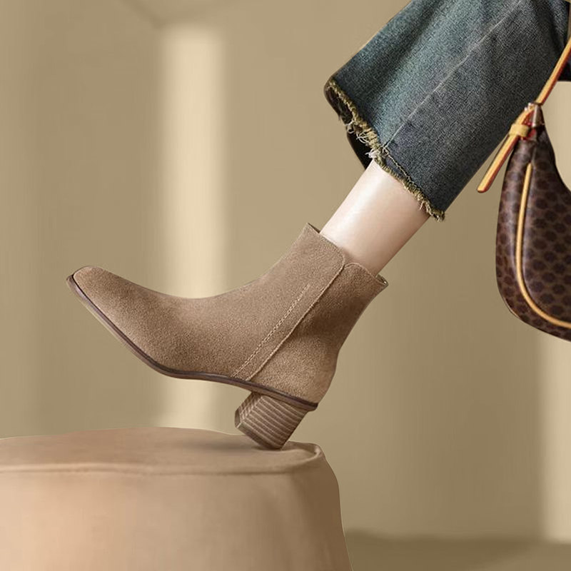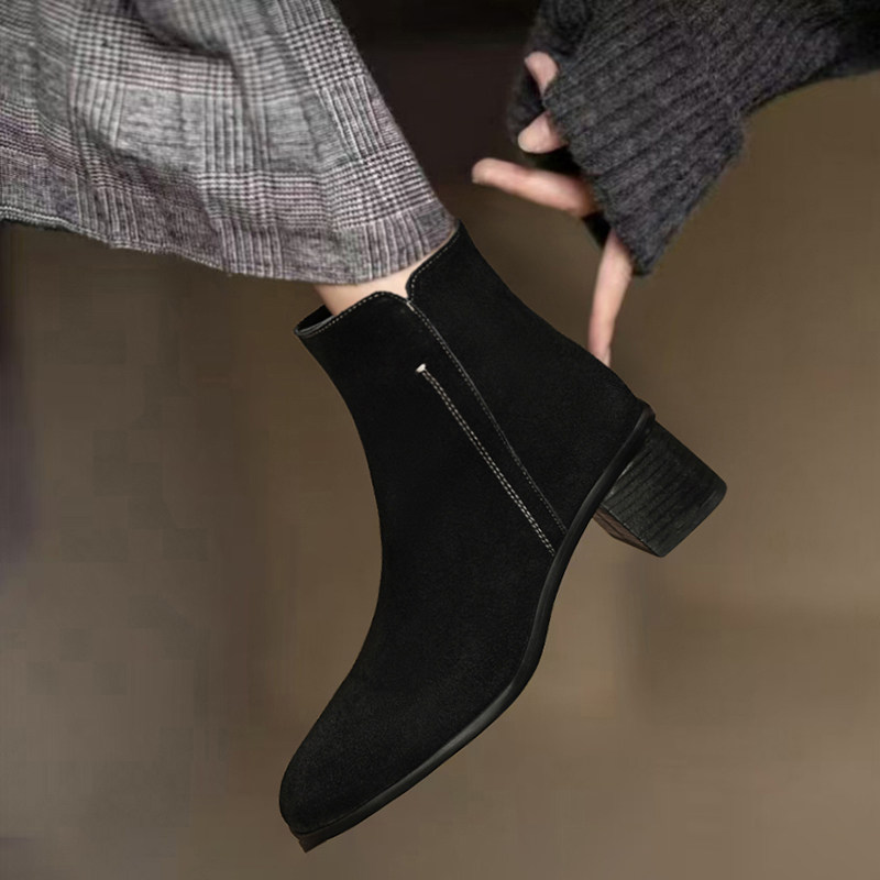 Slimming Soft-Soled Short Boots for Women, Autumn and Winter Genuine Leather Mid-Heel with Fleece Lining, Suede Leather, Small High Heel, Comfortable and Not Tiring for the Feet, Chunky Heel