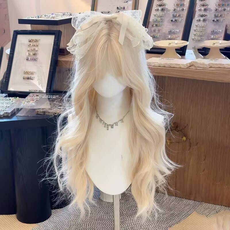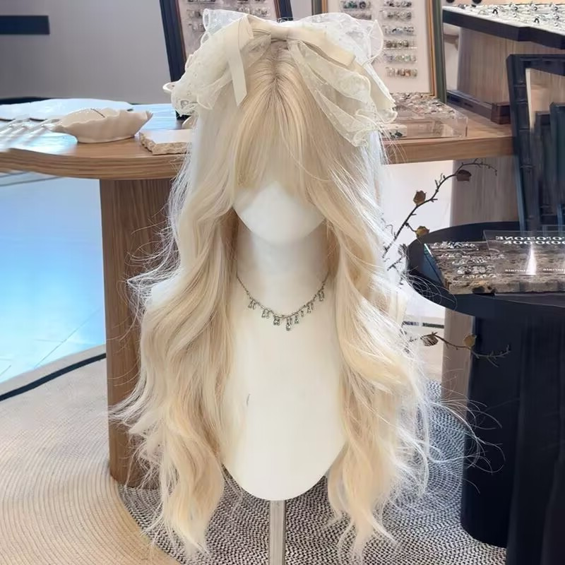 Off-White Wig for Women, Long Hair, Lolita Style, Sweet and Natural, Large Wavy Long Curly Hair, Everyday Air Bangs, Full Head Wig
