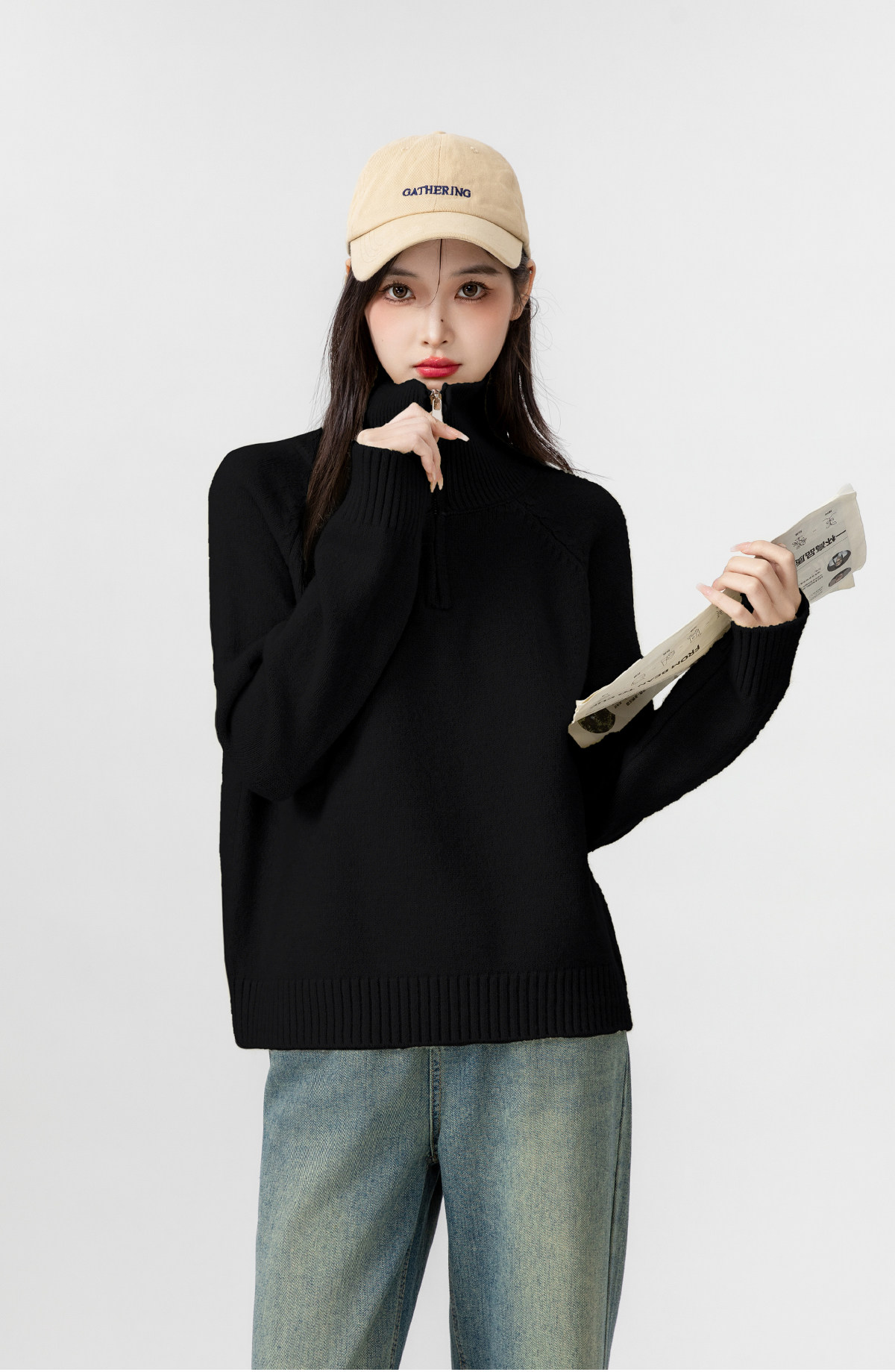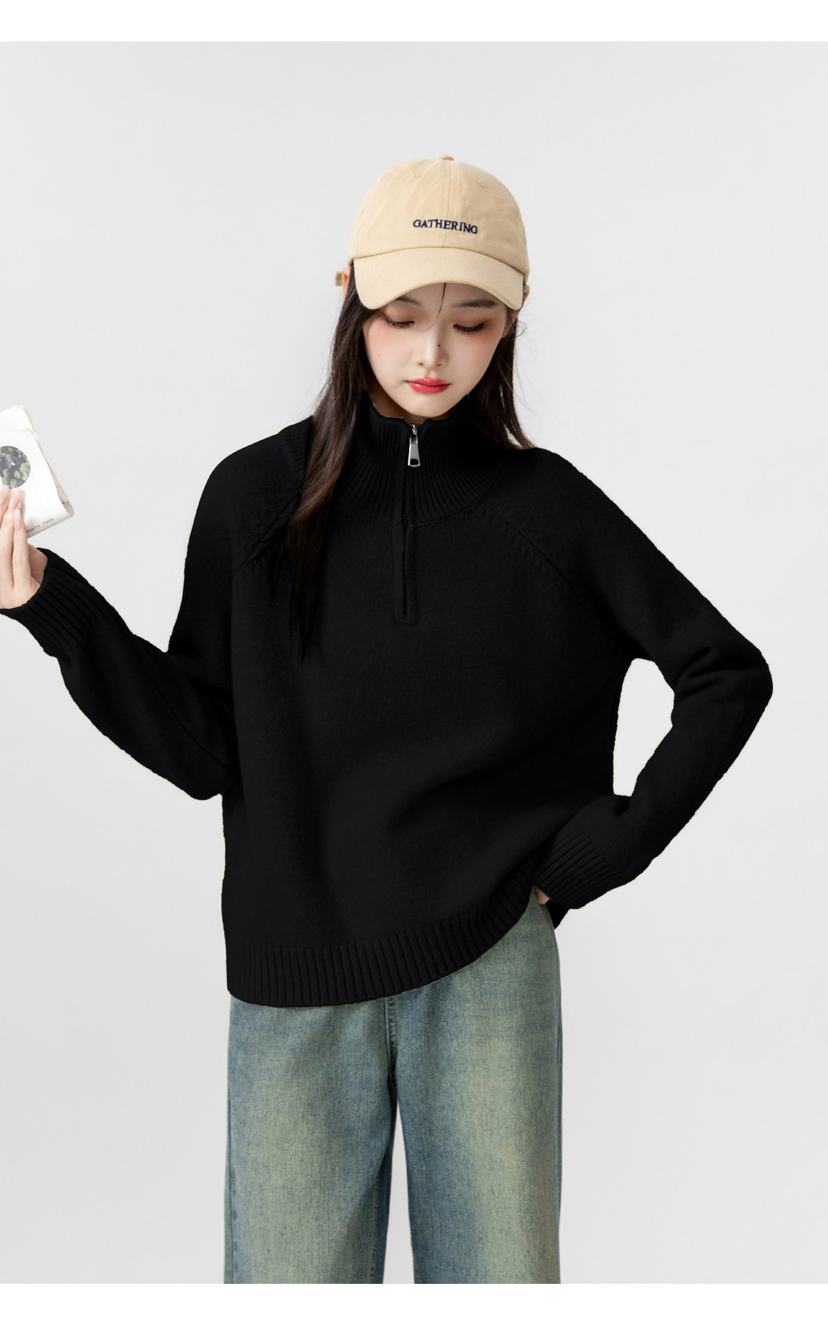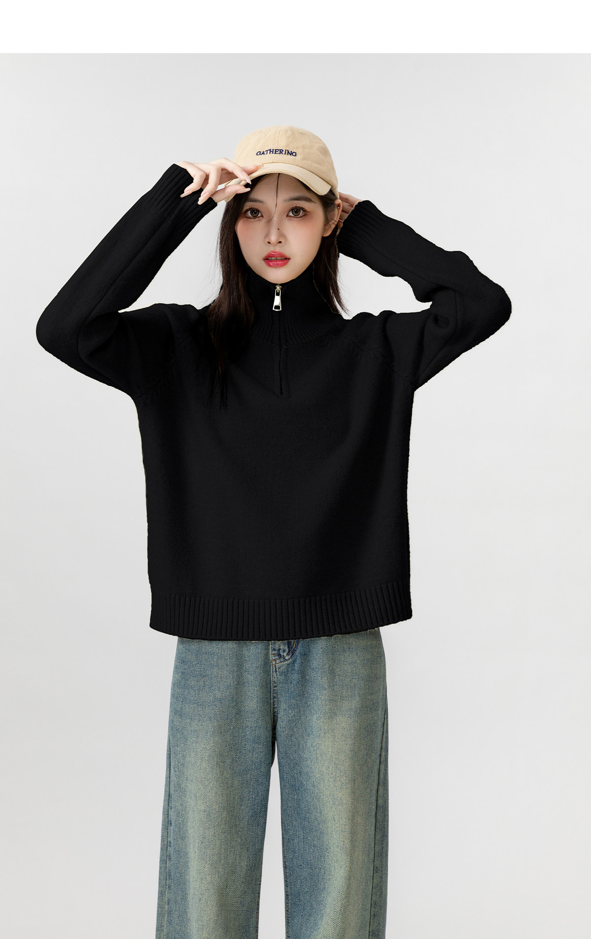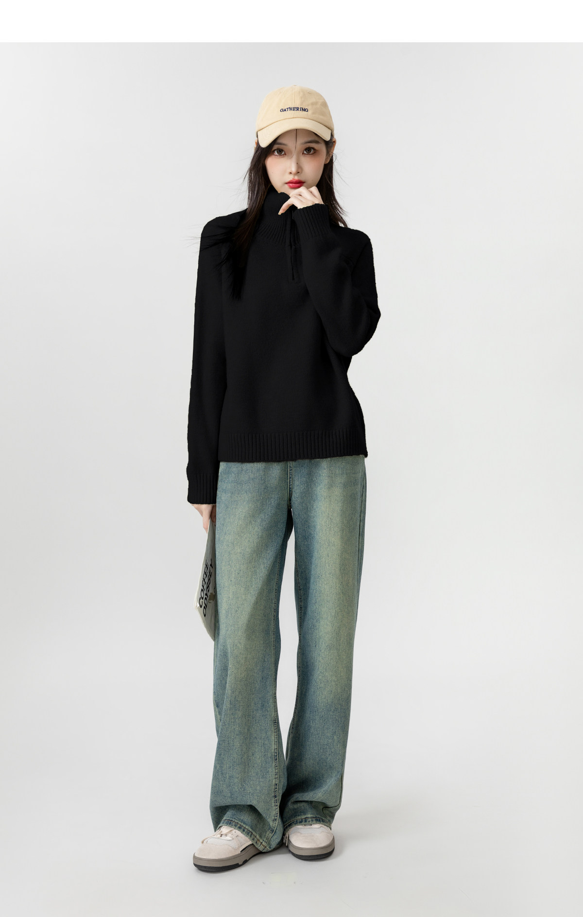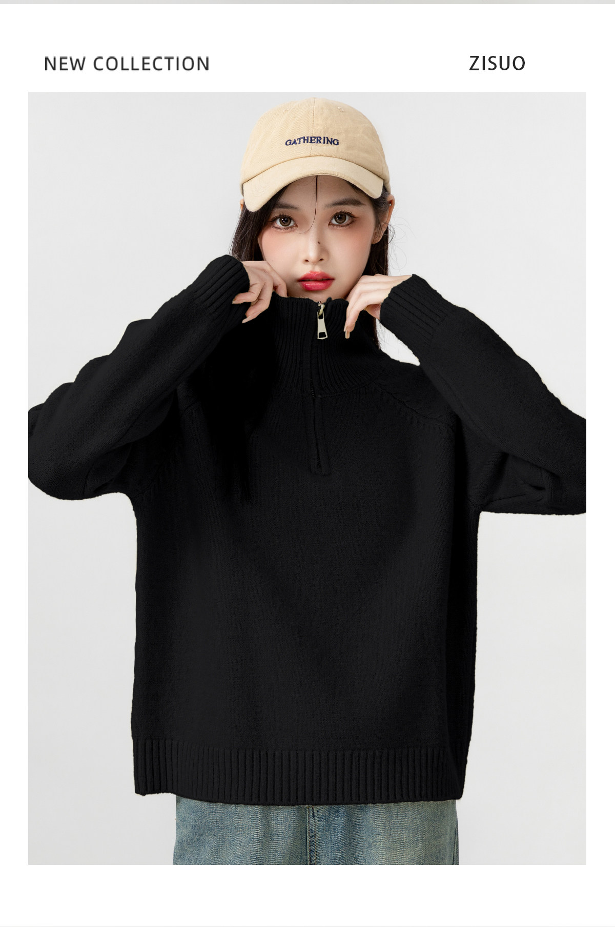 Black Half-Zip Turtleneck Sweater for Women 2024 Autumn and Winter New Design Loose Thickened Knitwear Outerwear