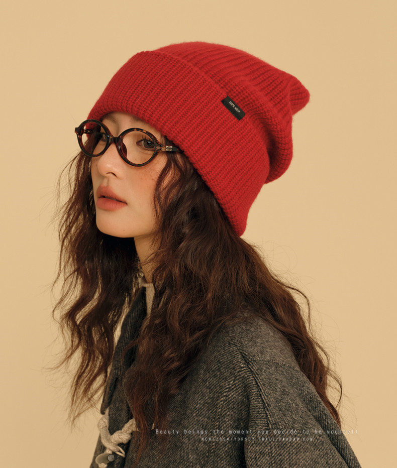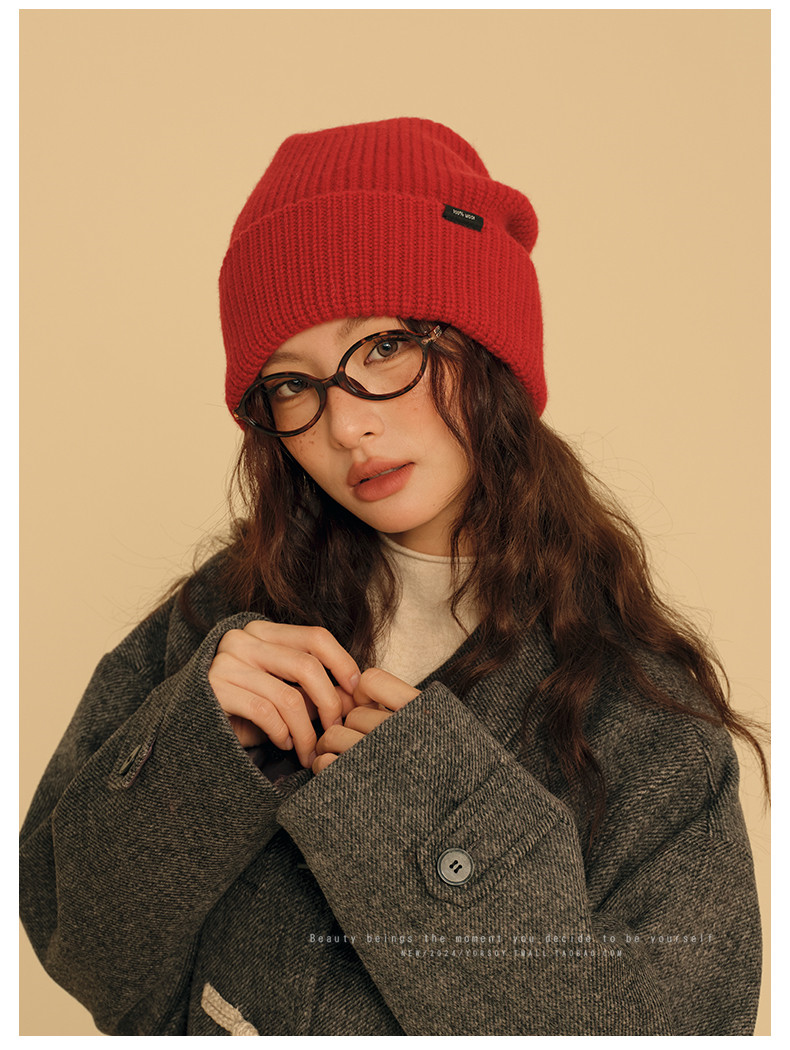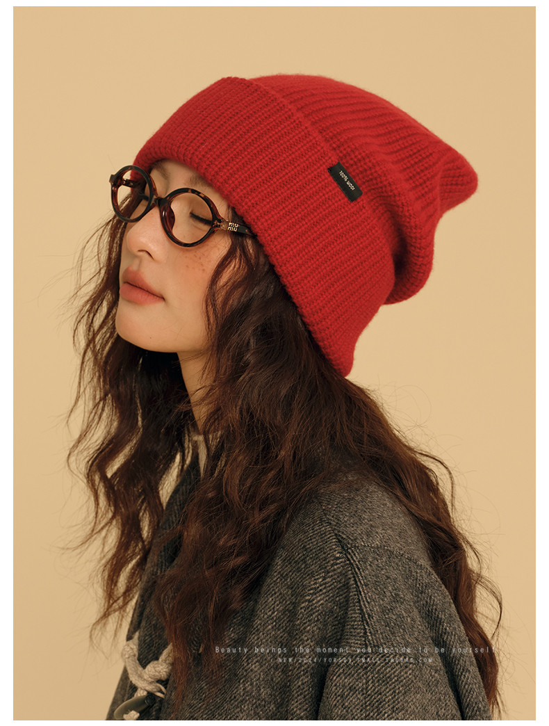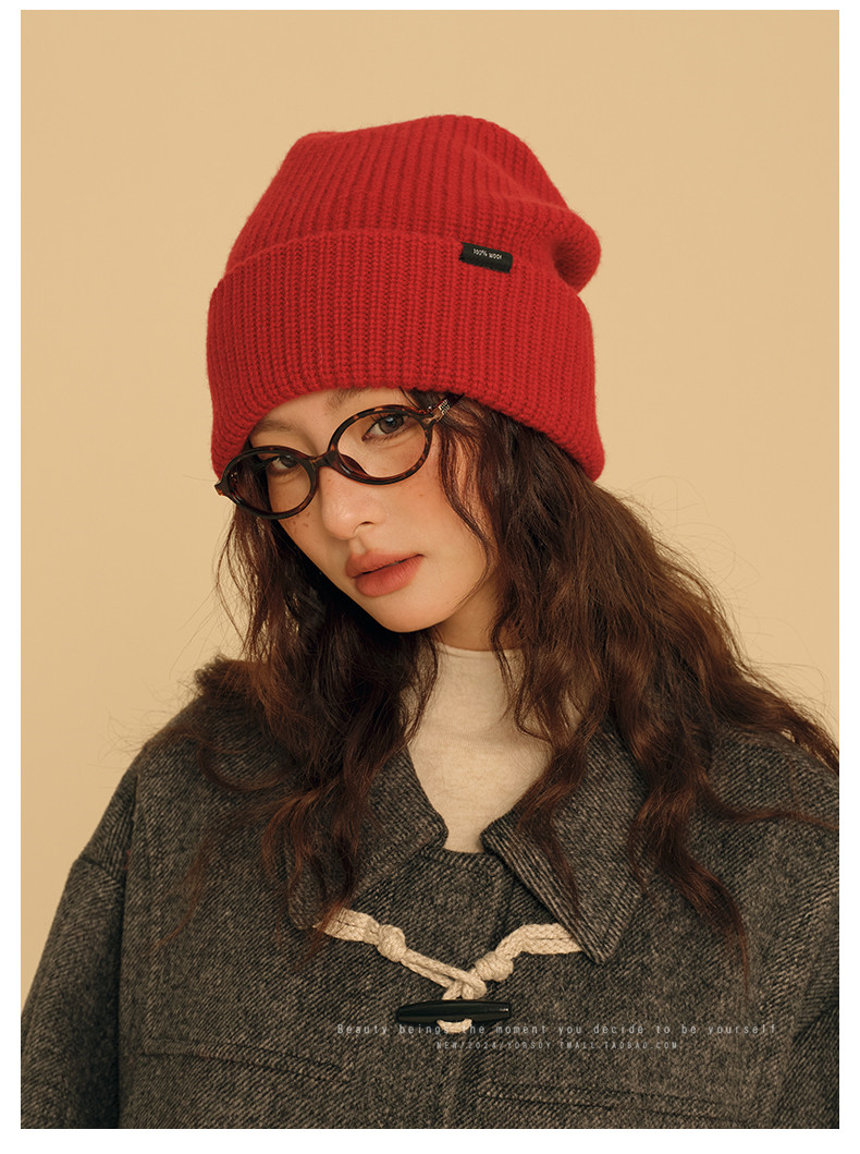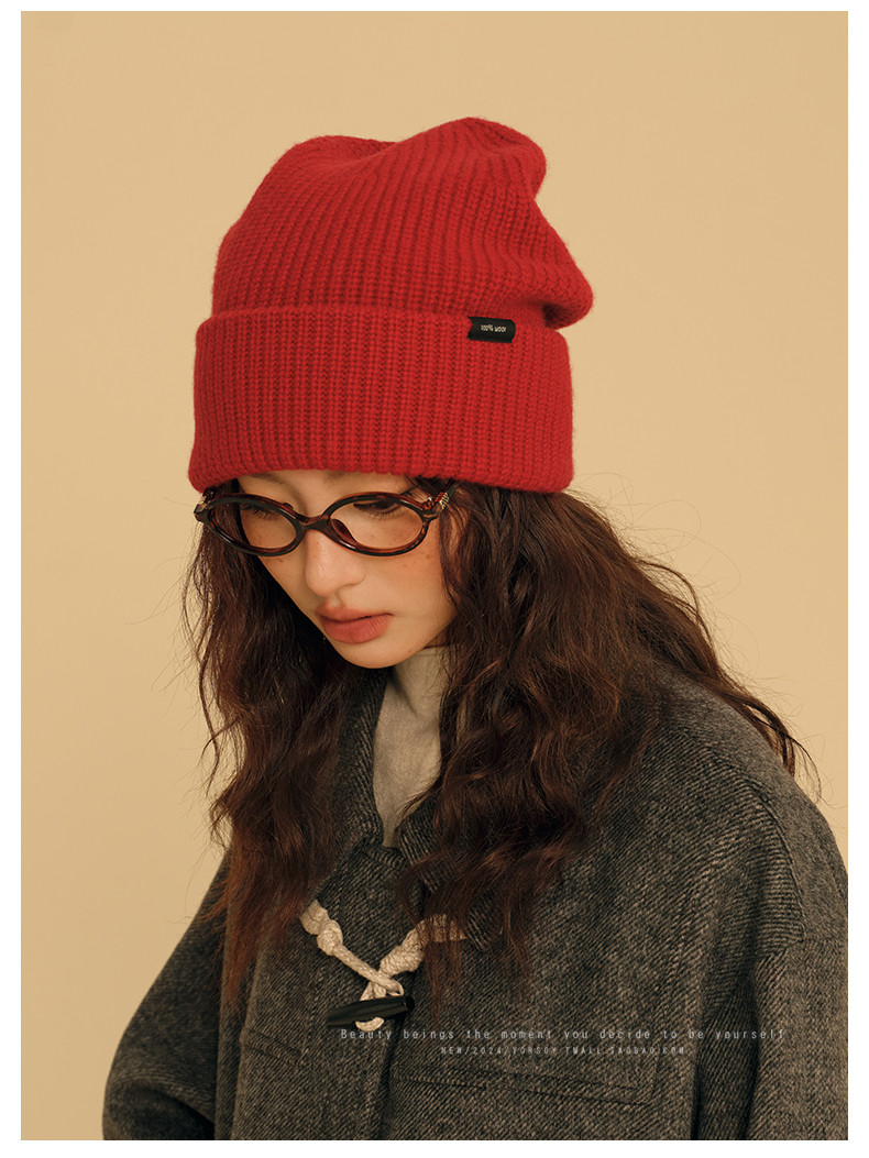 New Year Red Wool Hat for Women, Winter Australian 100% Pure Wool Knitted Slouchy Hat with Rolled Edges, Makes Face Look Smaller, Cold Weather Hat