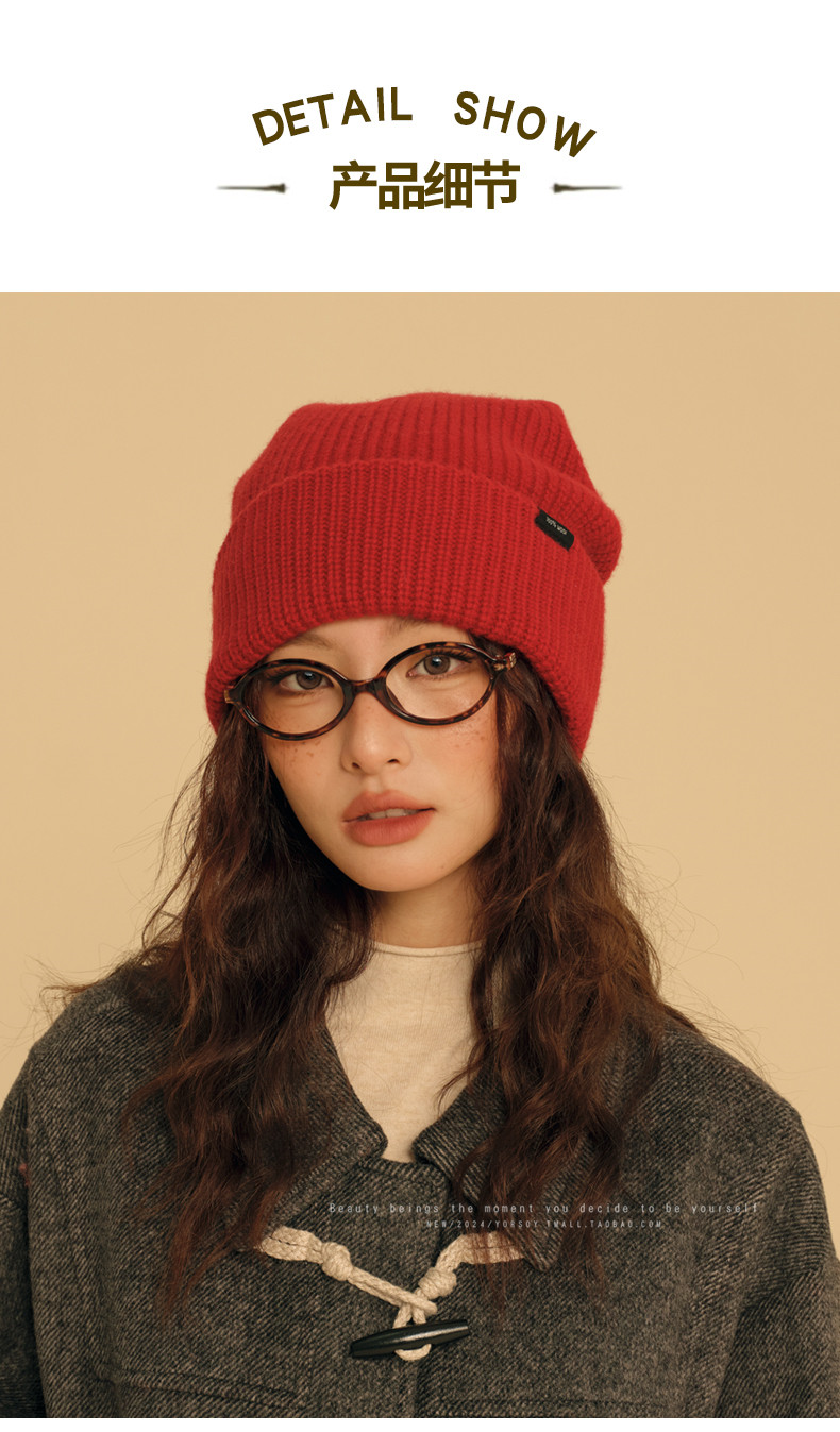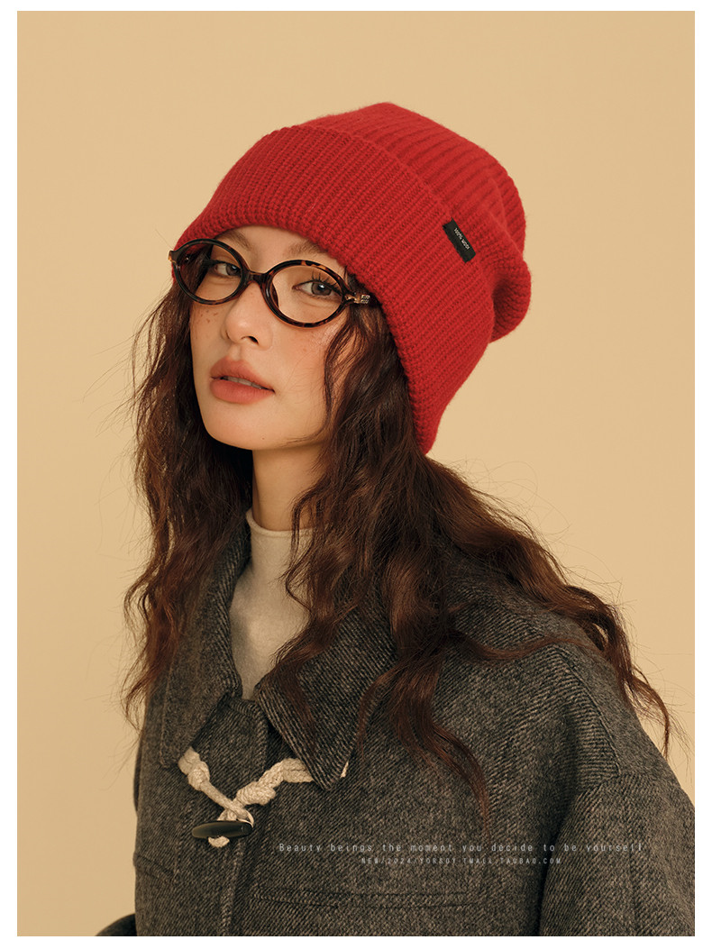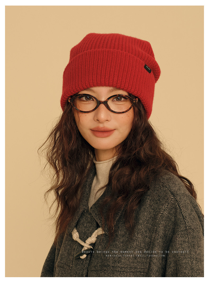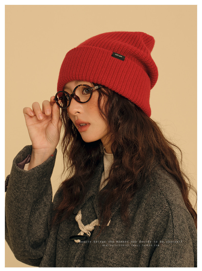 New Year Red Wool Hat for Women, Winter Australian 100% Pure Wool Knitted Slouchy Hat with Rolled Edges, Makes Face Look Smaller, Cold Weather Hat