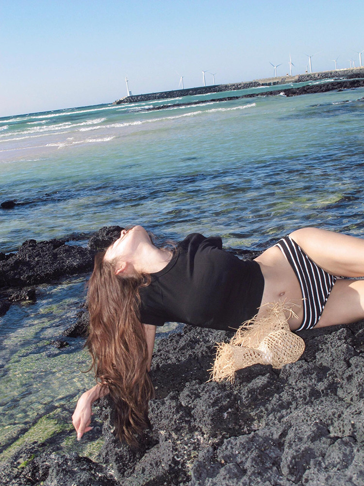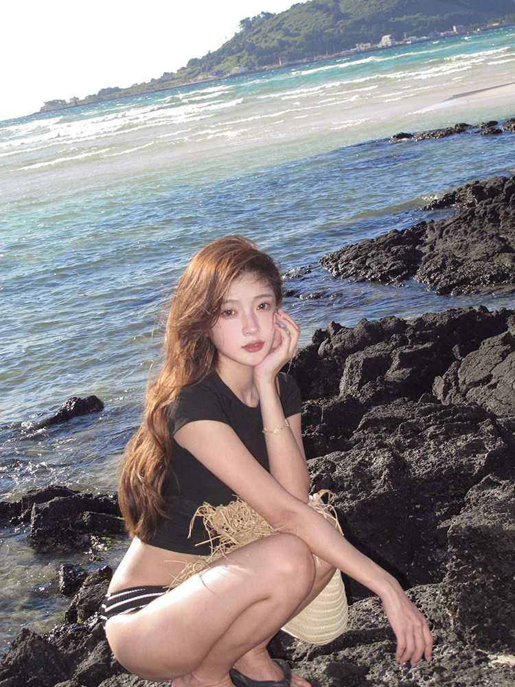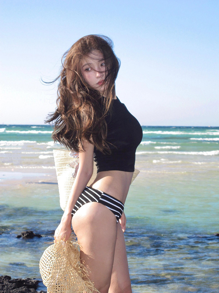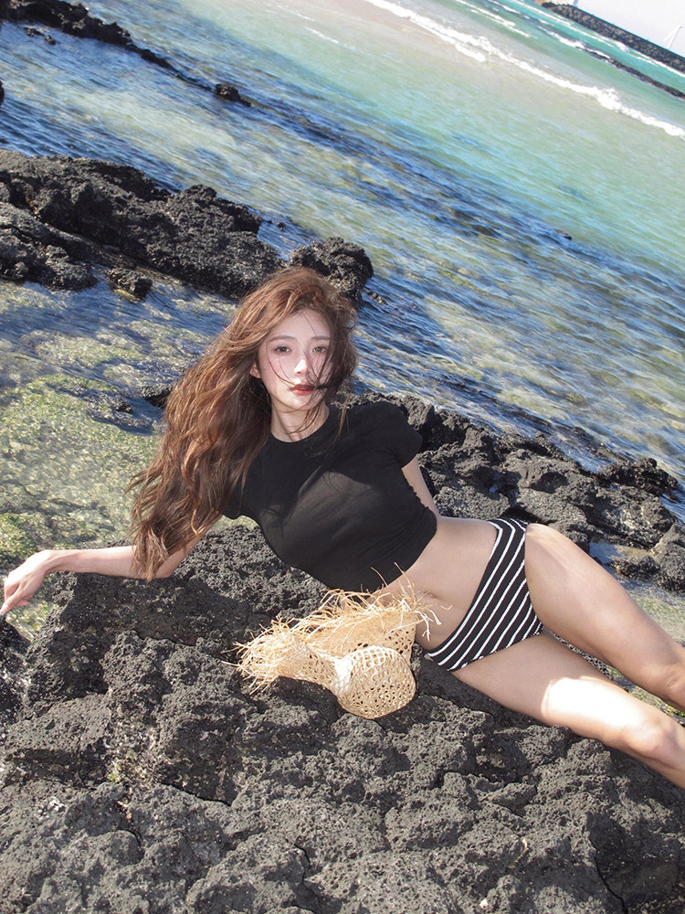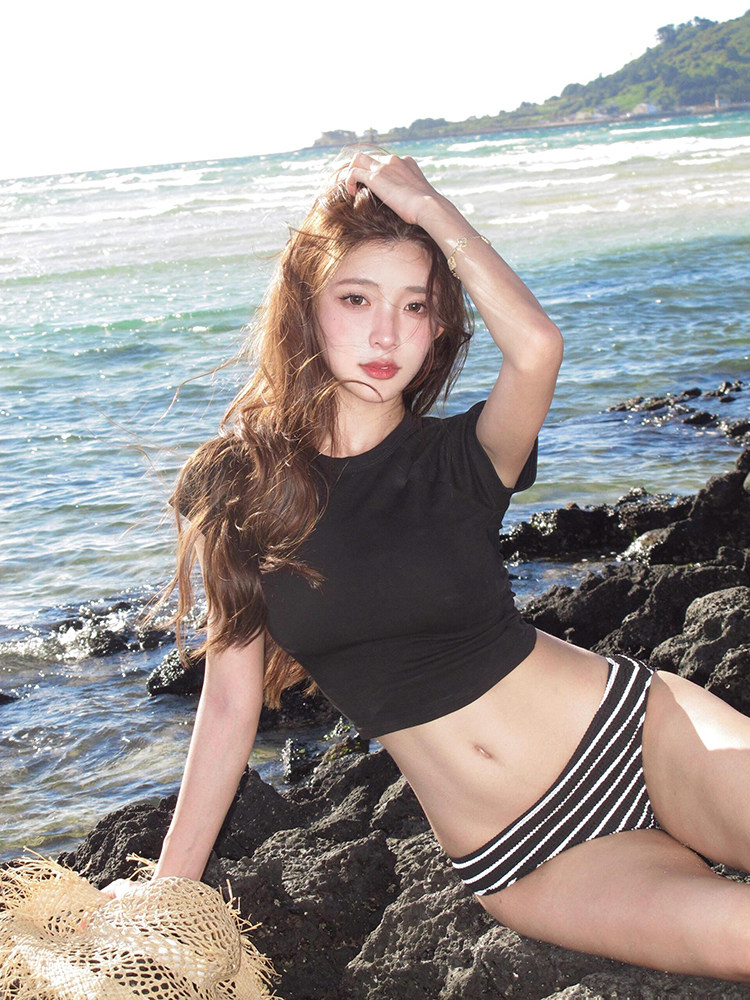 Retro Hot Girl Style Sexy Striped Short-Sleeved Split Bikini Island Vacation Small Bust Pure Desire Girl Hot Spring Swimsuit