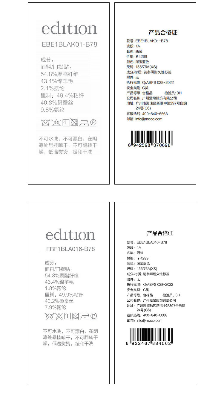 Material ingredients Polyester fiber 54.8%, sheep wool 43.4%, polyurethane elastic fiber (spandex) 1.8%