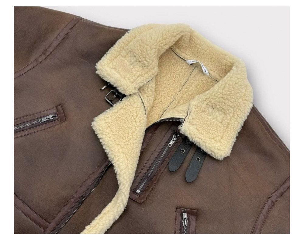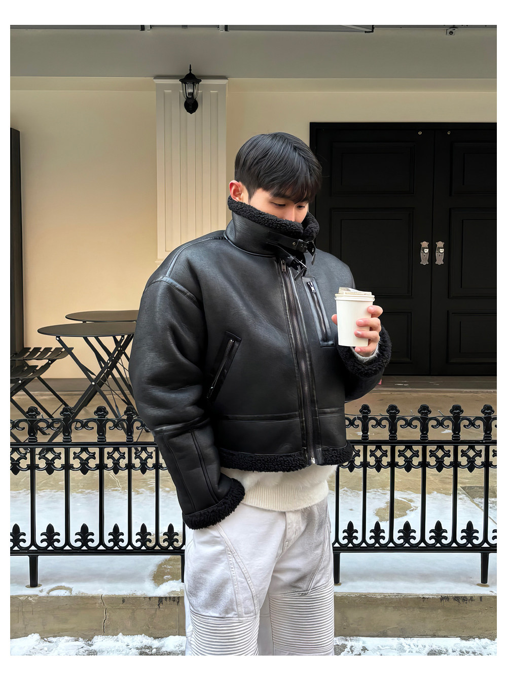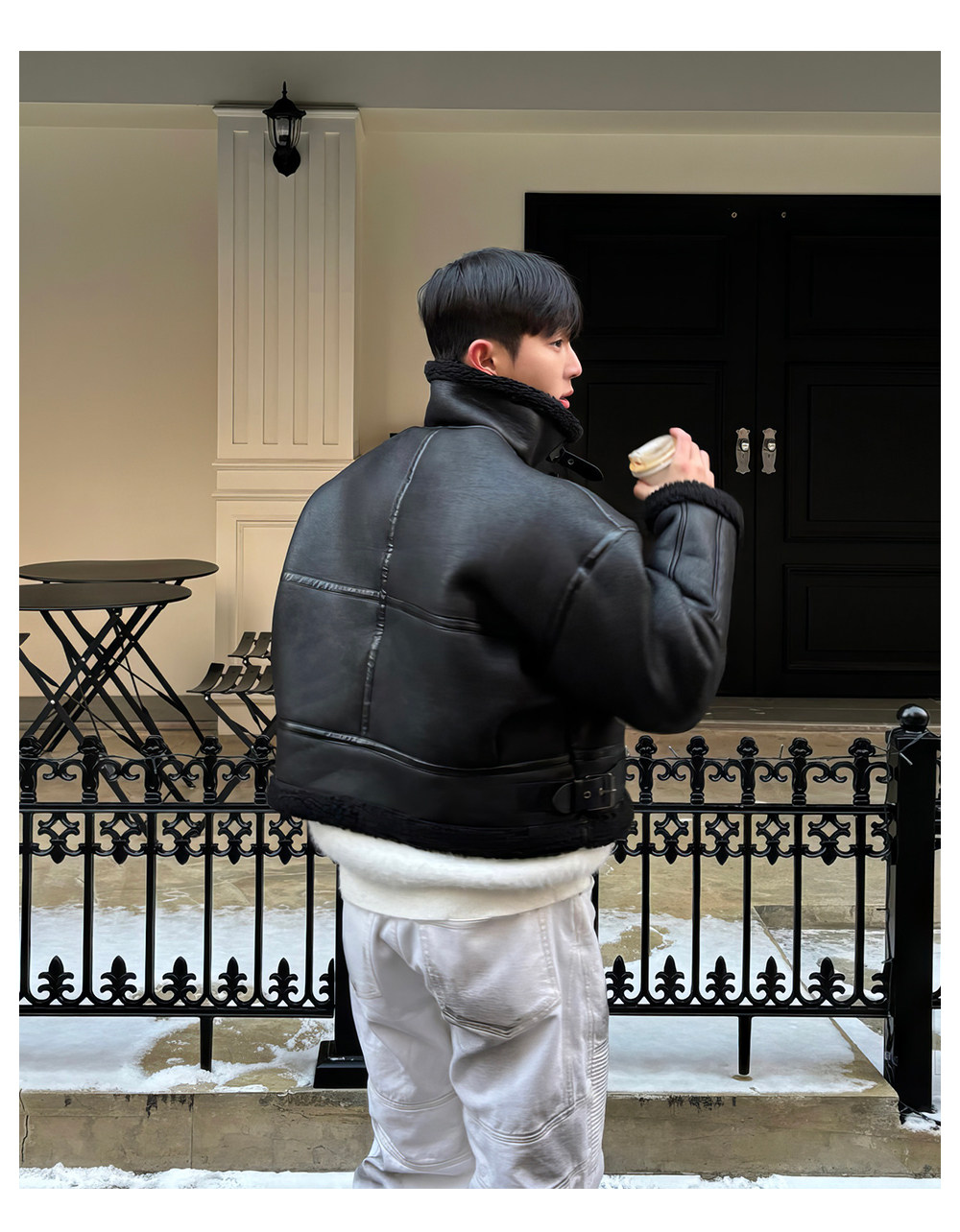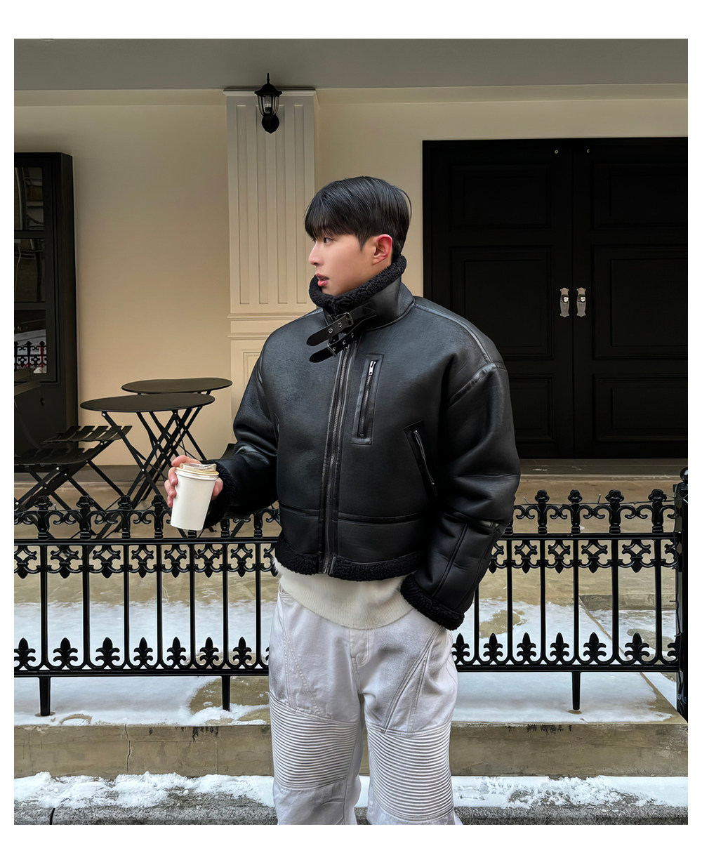 Black Stand-Up Collar Cotton Jacket for Men, Winter Thickened Faux Shearling Jacket, American Style Cool Leather and Fur Integrated Jacket, Trendy