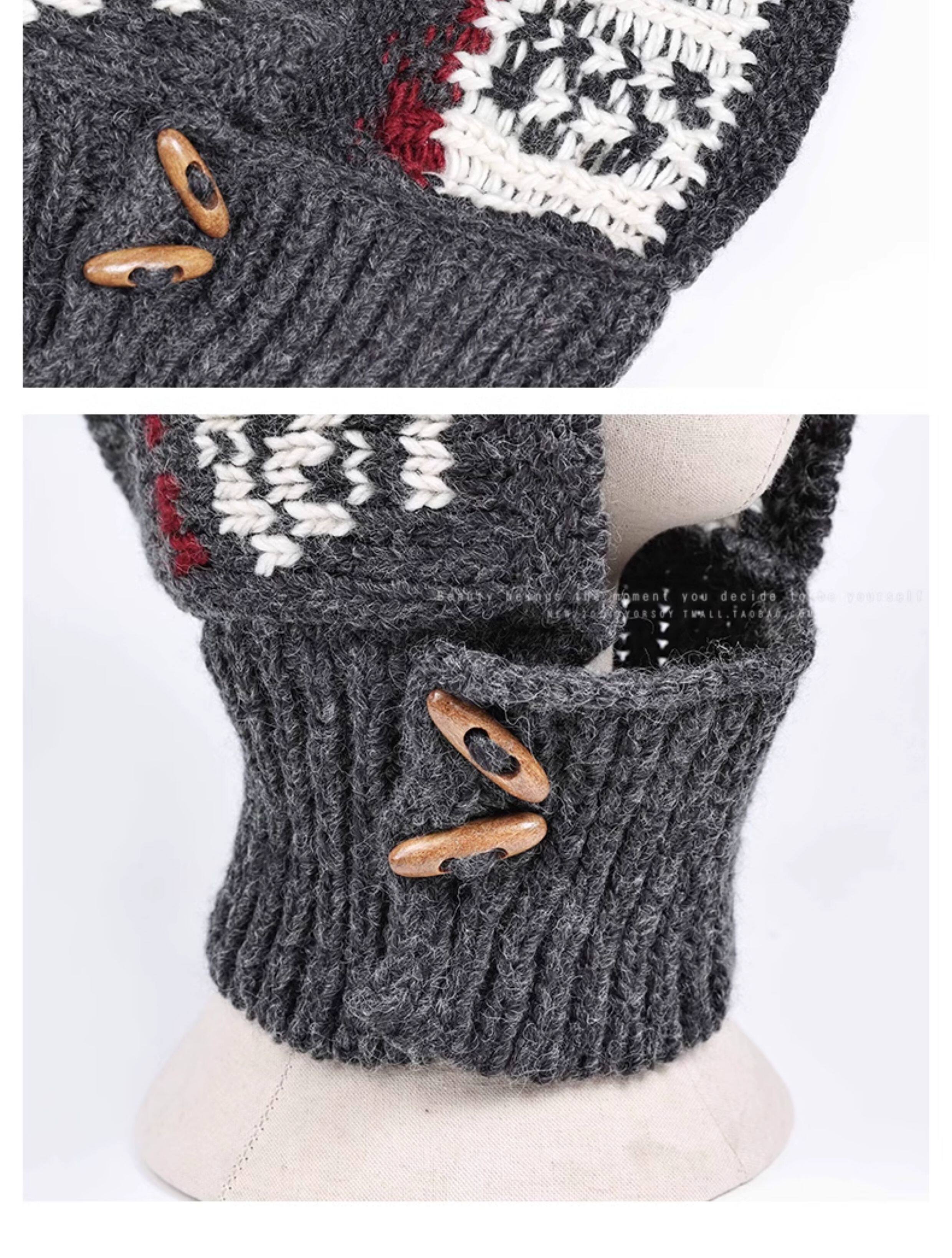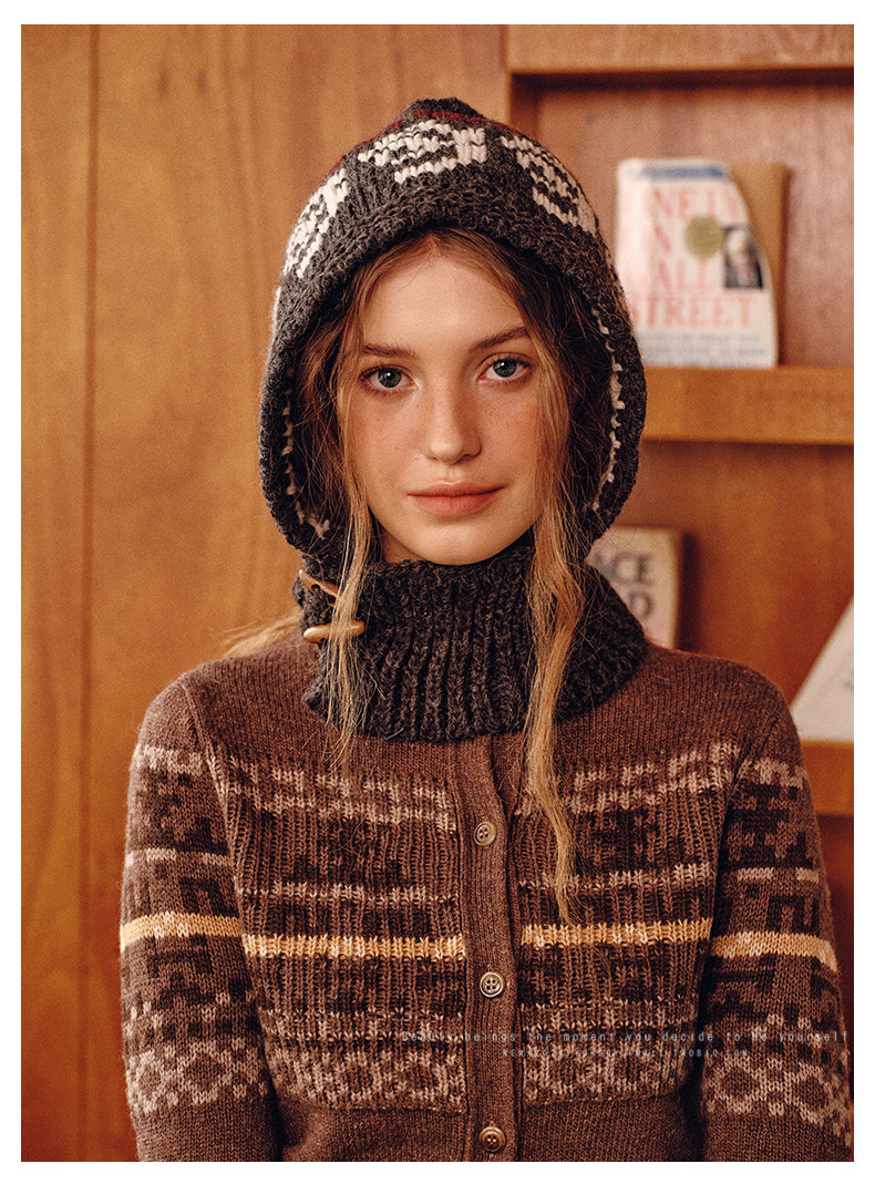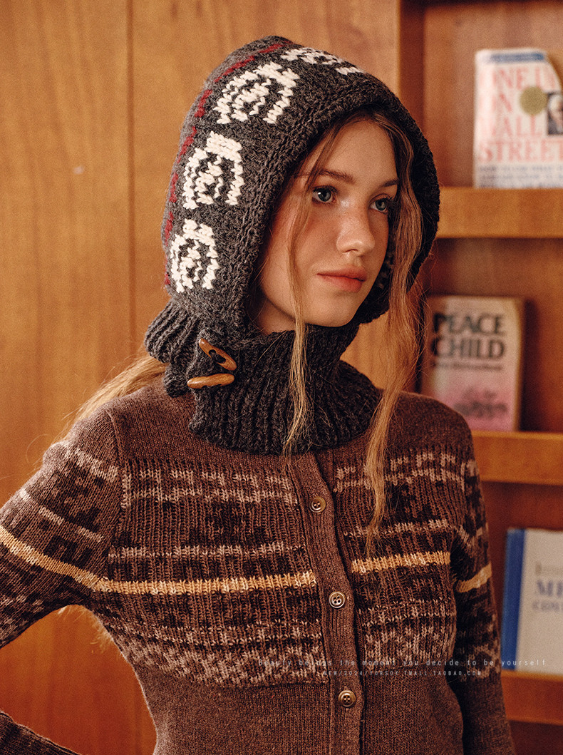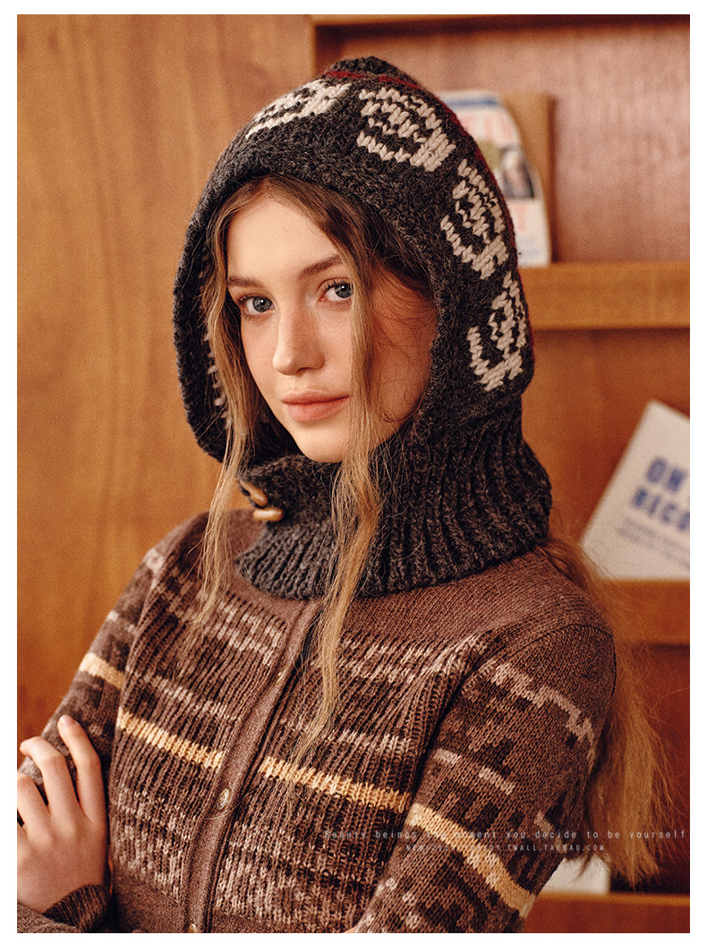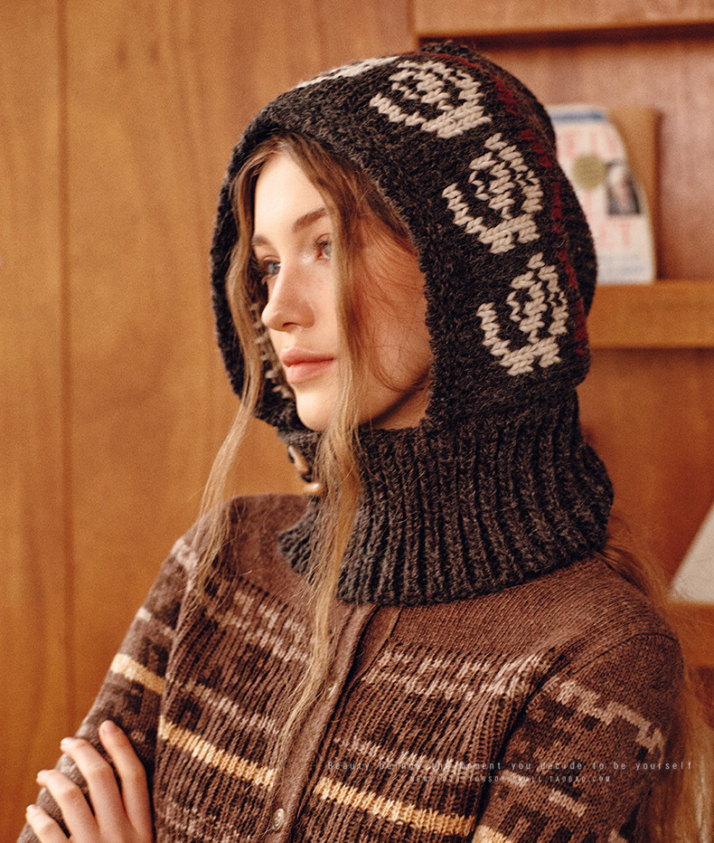 Retro Floral Gray Balaclava Hat for Women, Autumn and Winter Hat, Neck Scarf, Integrated Warm Ear Protection Hood