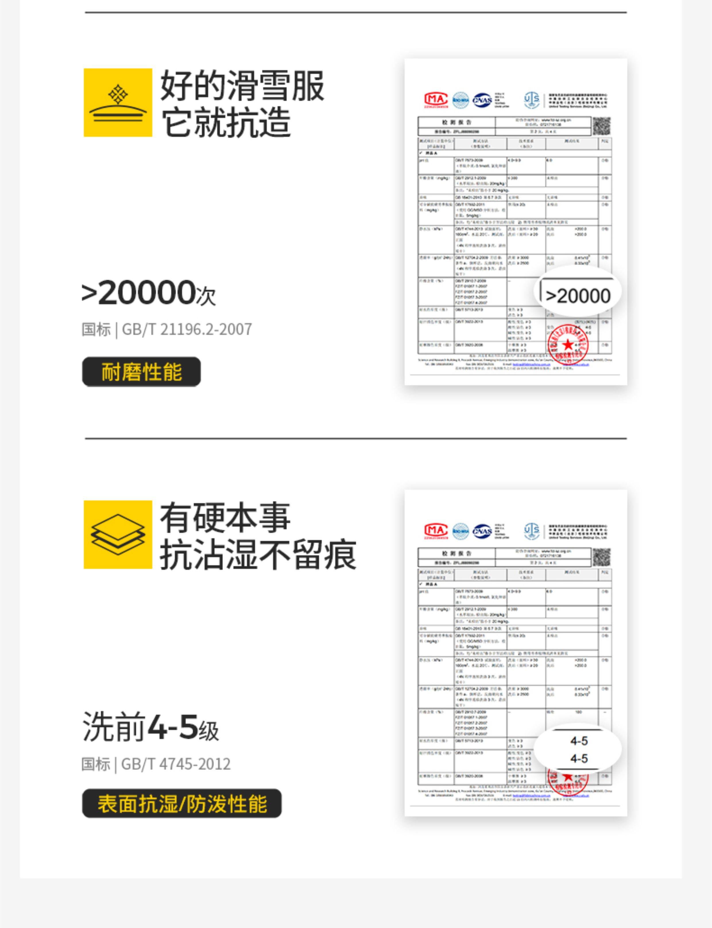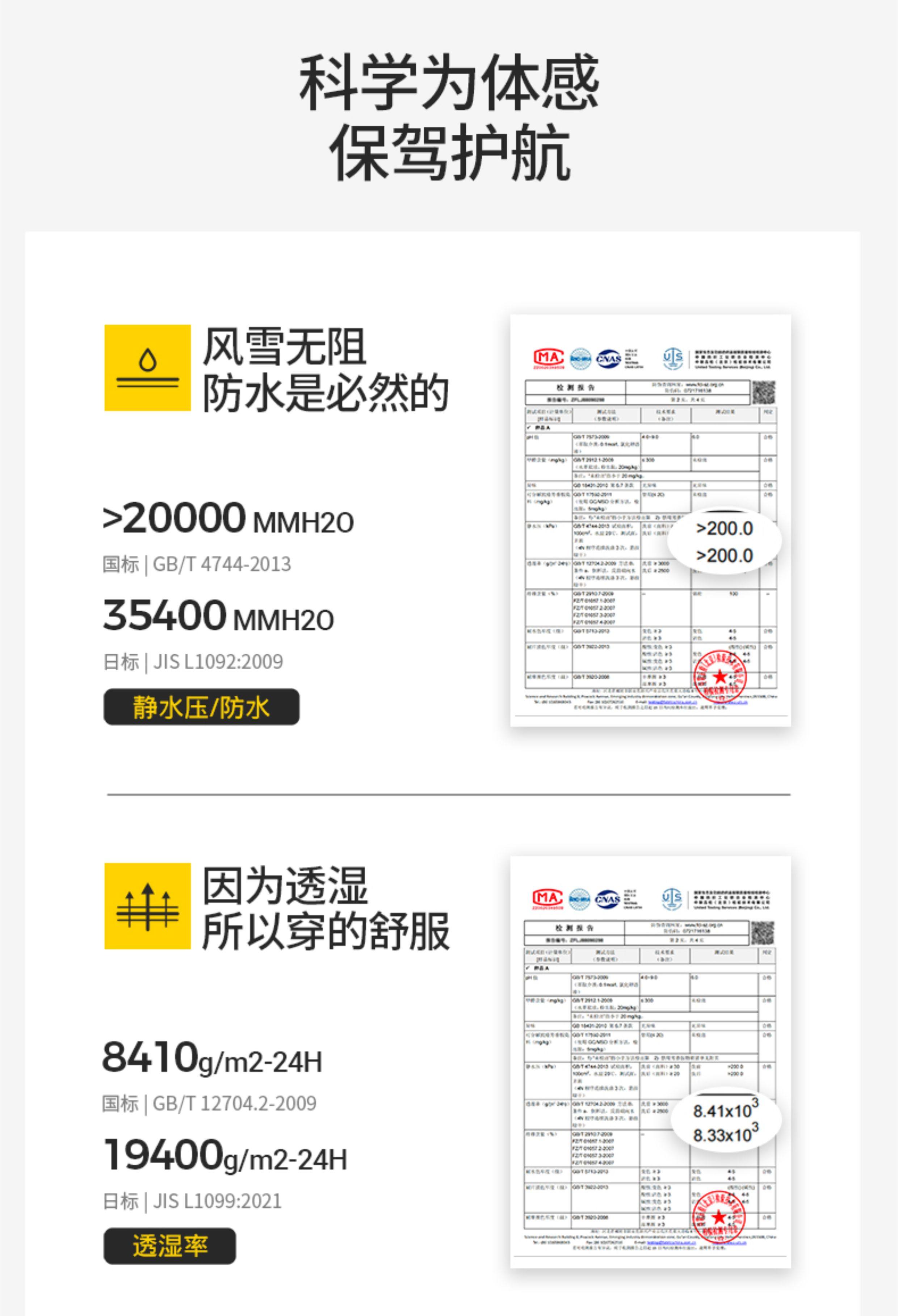 Waterproof Surface Moisture Resistance: ≥4-5 Levels before Washing, ≥3-4 Levels after Washing,Hydrostatic Pressure: before Washing - Fabric ≥50Kpa,Fabric Seam ≥40Kpa after Washing - Fabric ≥40Kpa,Fabric Joint ≥30Kpa