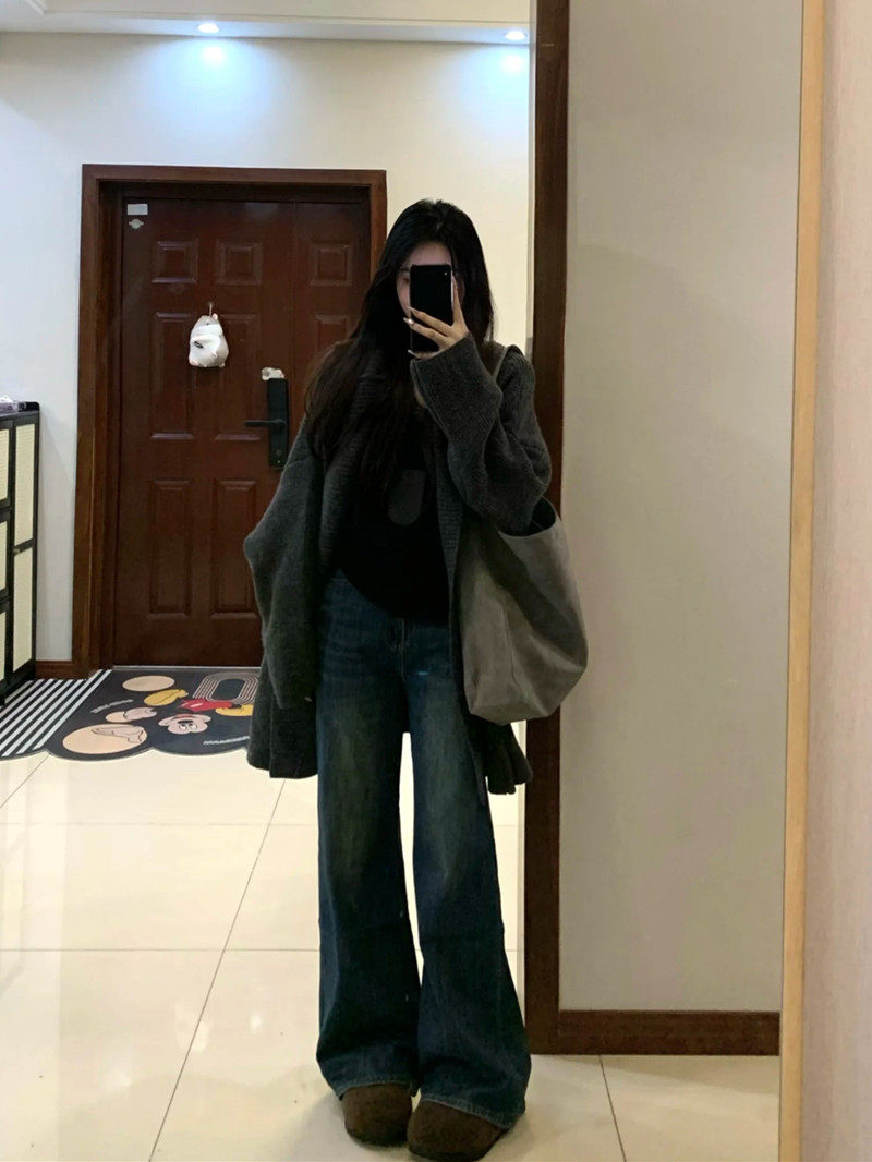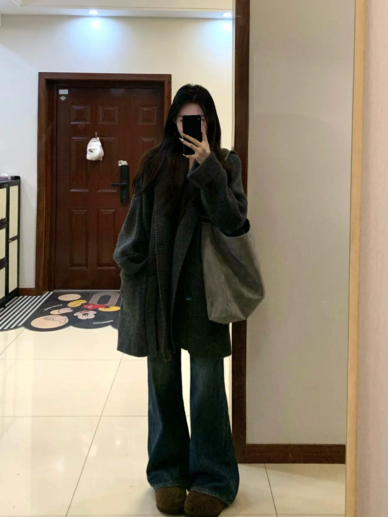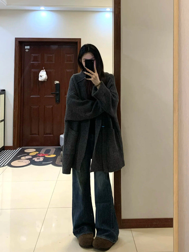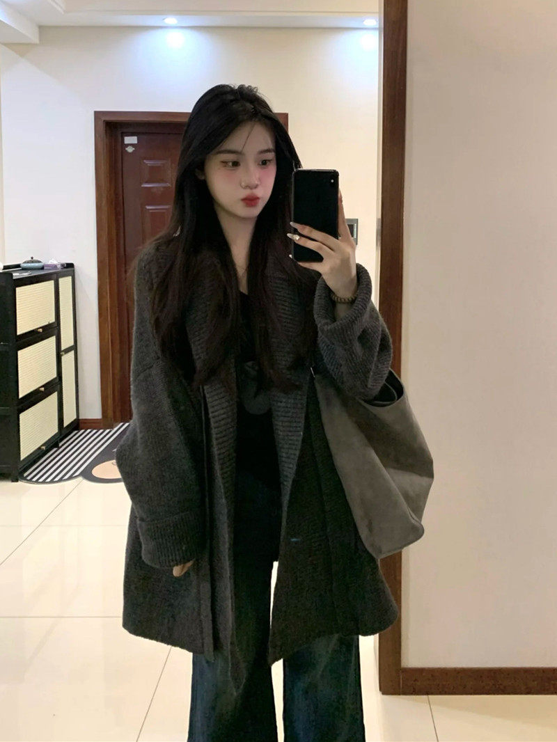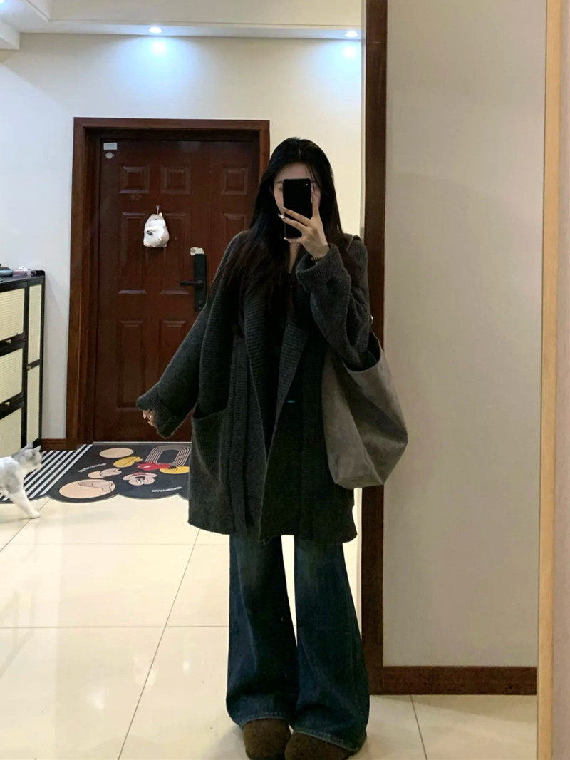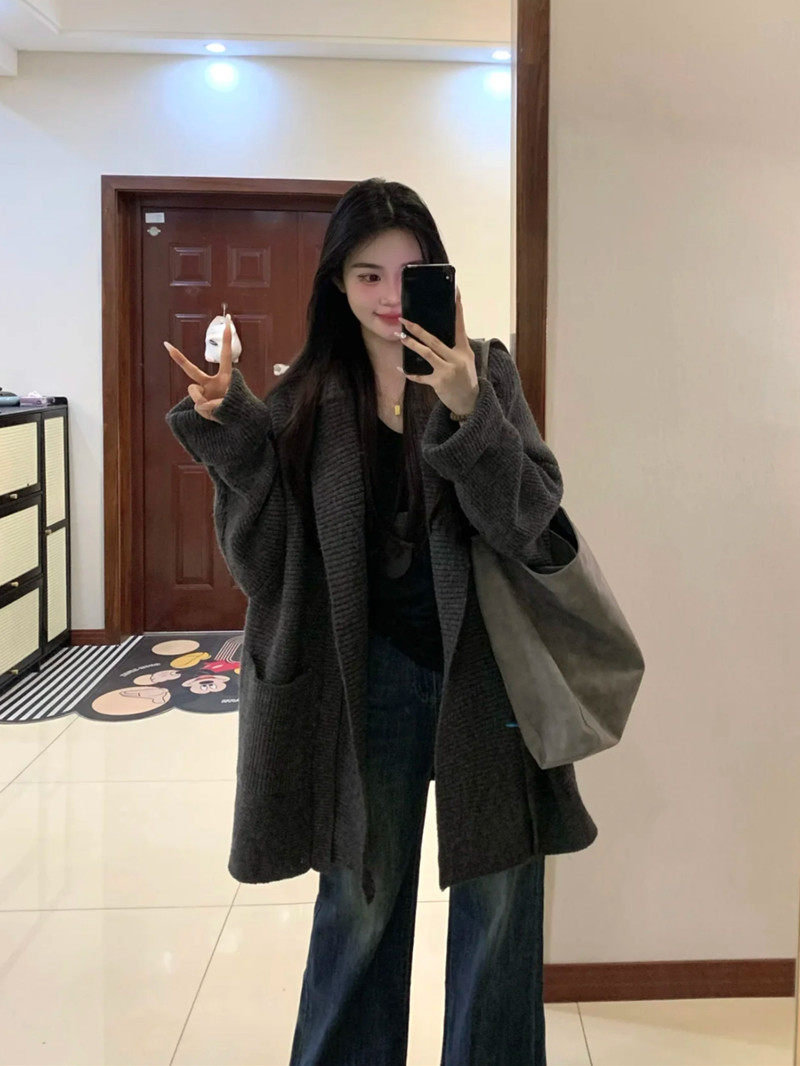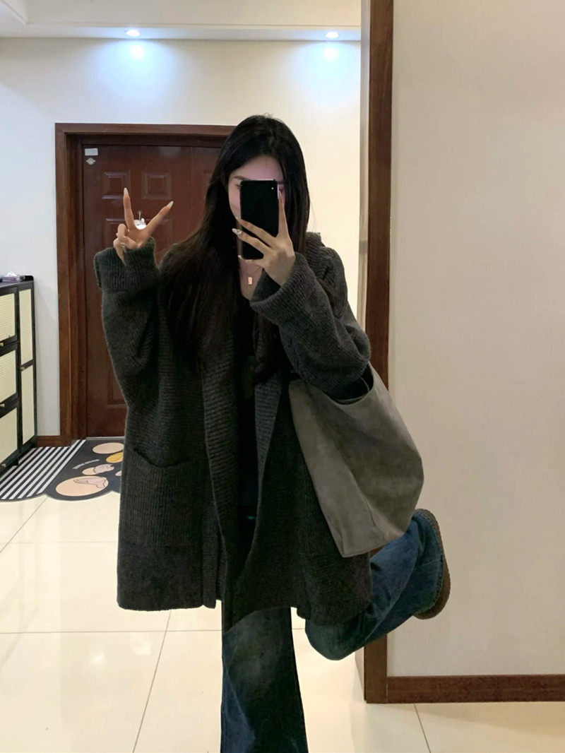 Suseyiku lazy style loose hooded knitted cardigan large pocket raglan sleeves thickened warm sweater jacket