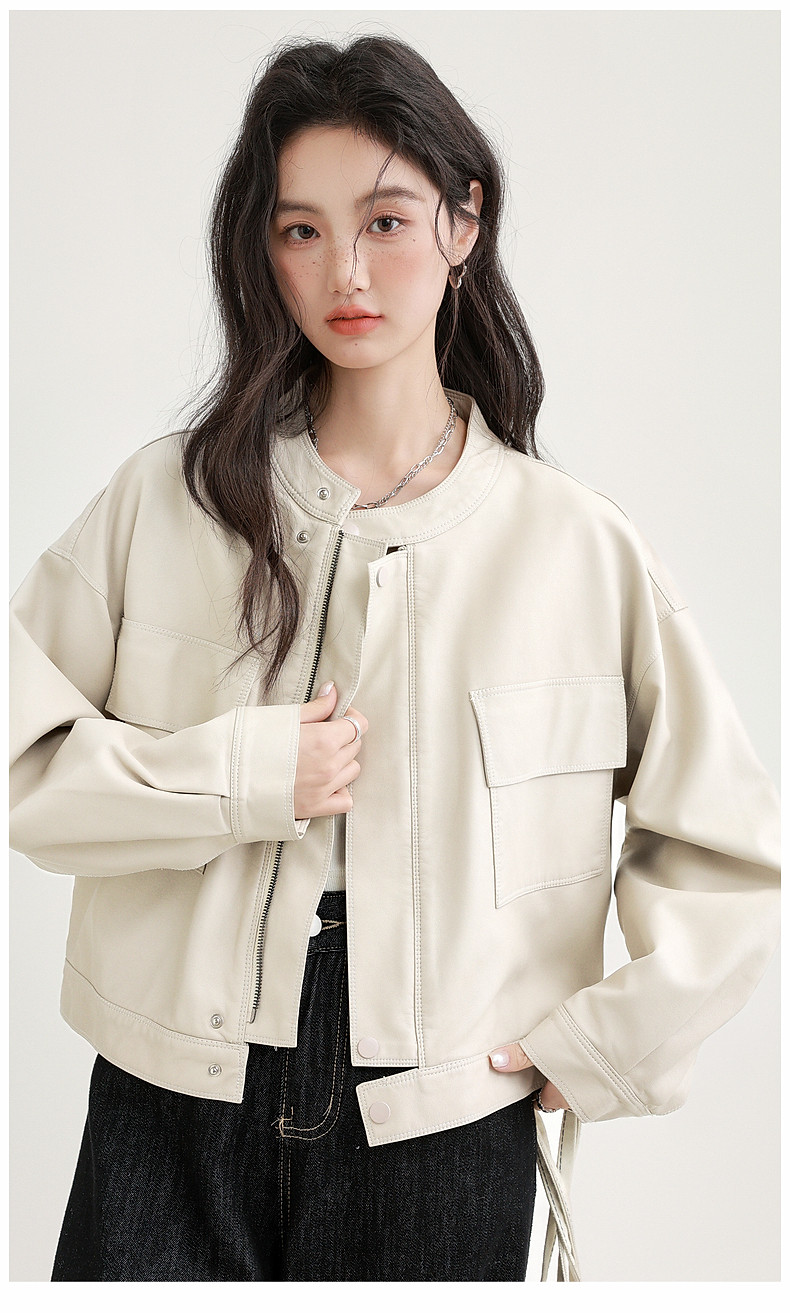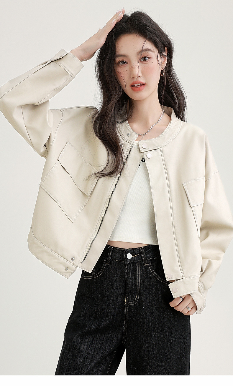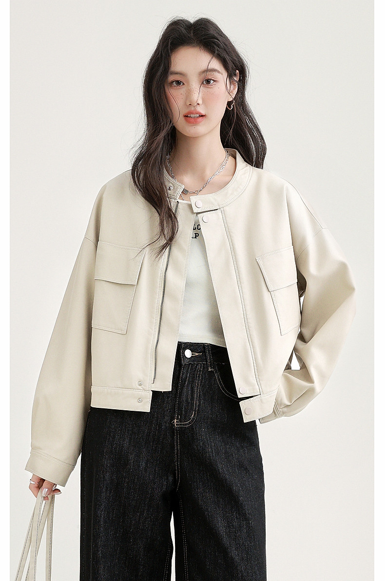 2025 Spring and Autumn New Vintage Stand Collar Pu Leather Jacket for Women, Loose Fit, Stylish Biker Style, Apricot Leather Jacket Top