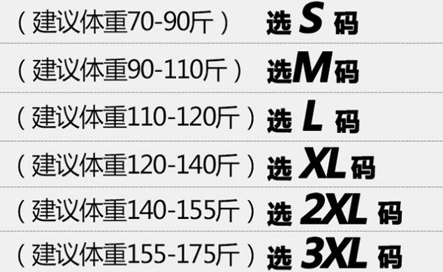 China (cm) 165 / 88-90 170 / 96-98 175 / 108-110 180 / 118-122 185 / 126-130