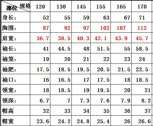 China (cm) 165 / 88-90 170 / 96-98 175 / 108-110 180 / 118-122 185 / 126-130