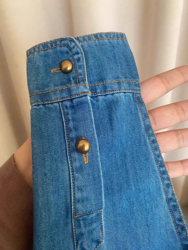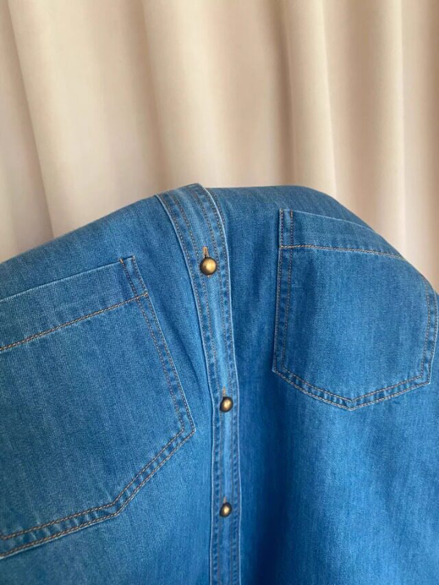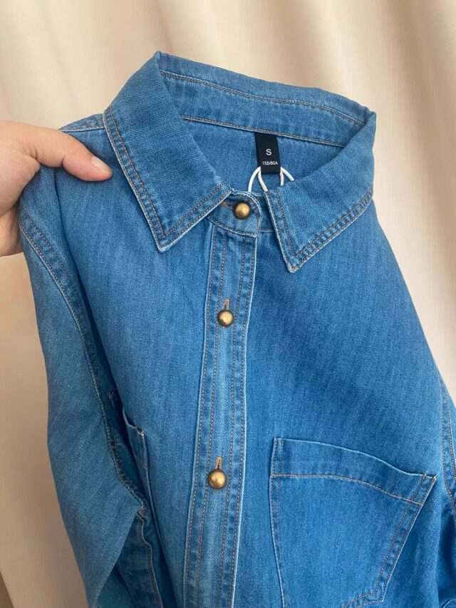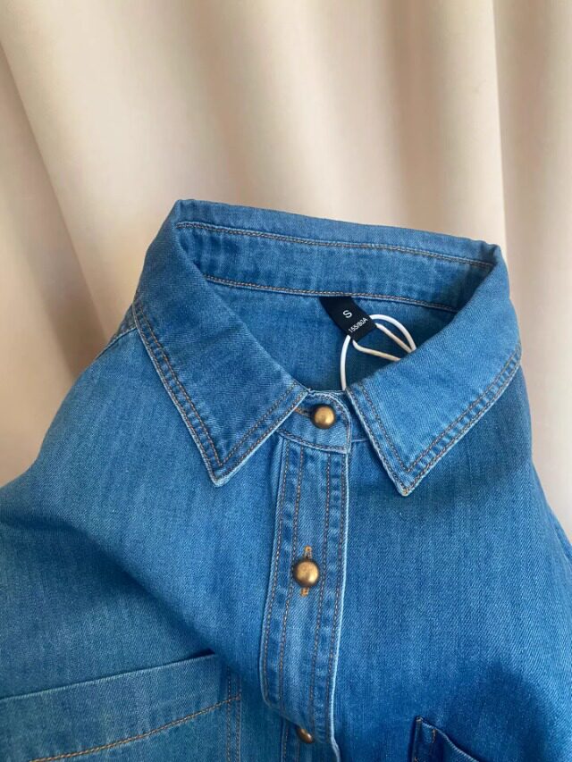 Retro blue denim shirt for women in spring and autumn, small lapel shirt, layered loose right shoulder long-sleeved top