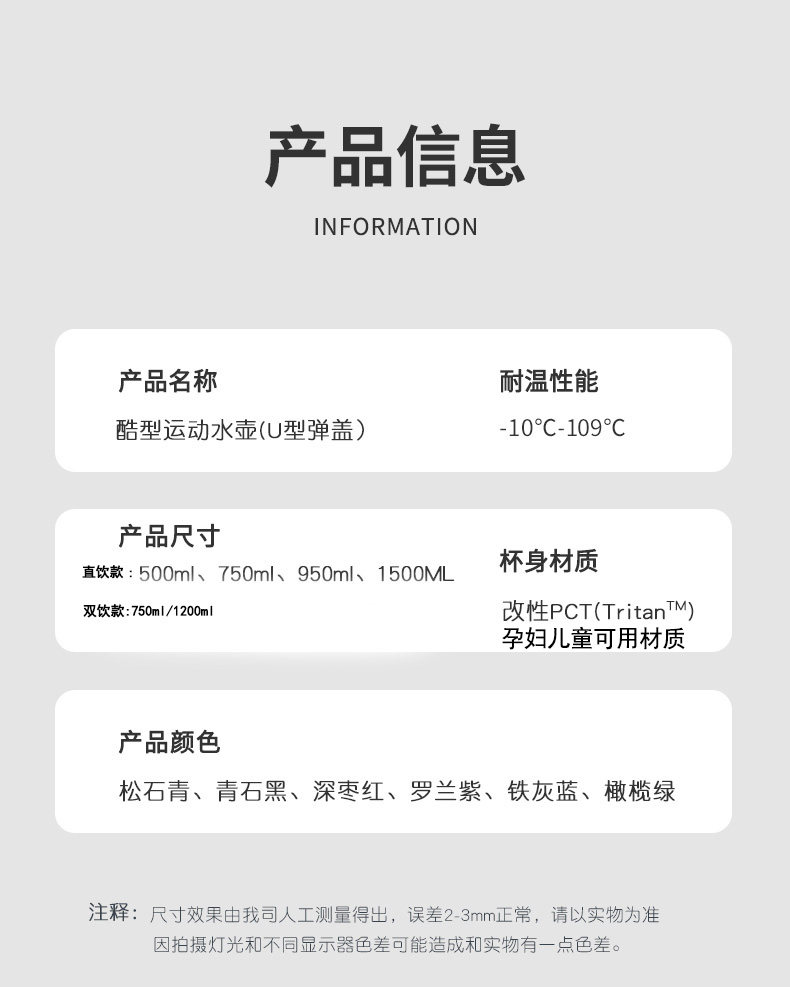 Sort by color 1200ML bluestone black direct drink + straw (imported Tritan material),1200ML malachite green direct drink + straw (imported Tritan material),1200ML Stone Red Straw + Straw (imported Tritan material),1200ML iron gray blue direct drink + straw (imported Tritan material),750ML bluestone black direct drink + straw (imported Tritan material),750ML malachite green direct drink + straw (imported Tritan material),750ML iron gray blue direct drink + straw (imported Tritan material),750ML Stone Red Straw + Straw (Imported Tritan material),Bluestone Black 1500ml (imported tritan material for direct drinking, can be filled with boiling water),Iron gray blue 1500ml (imported tritan material for direct drinking, can be filled with boiling water),Turquoise blue 1500ml (imported tritan material for direct drinking, can be filled with boiling water),Dark jujube 1500ml (direct drinking imported tritan material can be filled with boiling water),Luo Lan Purple 1500ml (imported tritan material for direct drinking, can be filled with boiling water),Bluestone Black 950ml (imported tritan material for direct drinking, can be filled with boiling water),Iron gray blue 950ml (imported tritan material for direct drinking, can be filled with boiling water),Turquoise blue 950ml (imported tritan material for direct drinking, can be filled with boiling water),Luo Lan Purple 950ml (imported tritan material for direct drinking, can be filled with boiling water),Deep red jujube 950ml (imported tritan material for direct drinking, can be filled with boiling water),Bluestone Black 750ml (imported tritan material for direct drinking, can be filled with boiling water),Iron Gray Blue 750ml (imported tritan material for direct drinking, can be filled with boiling water),Turquoise Blue 750ml (imported tritan material for direct drinking, can be filled with boiling water),Turquoise Blue 500ml (imported tritan material for direct drinking, can be filled with boiling water)