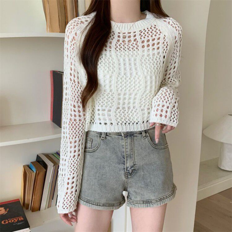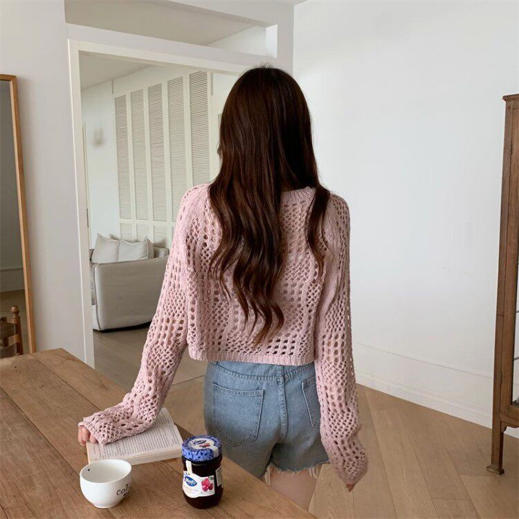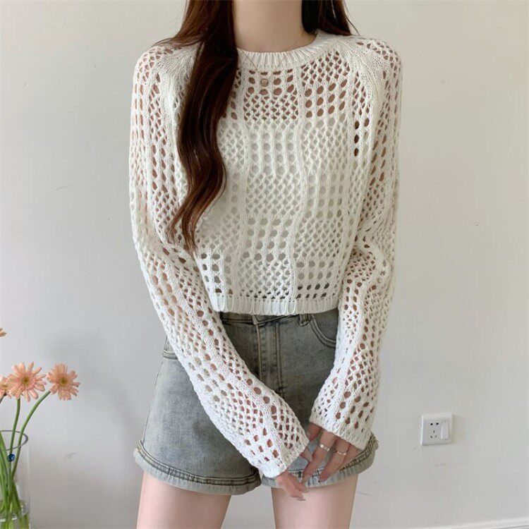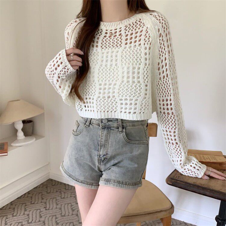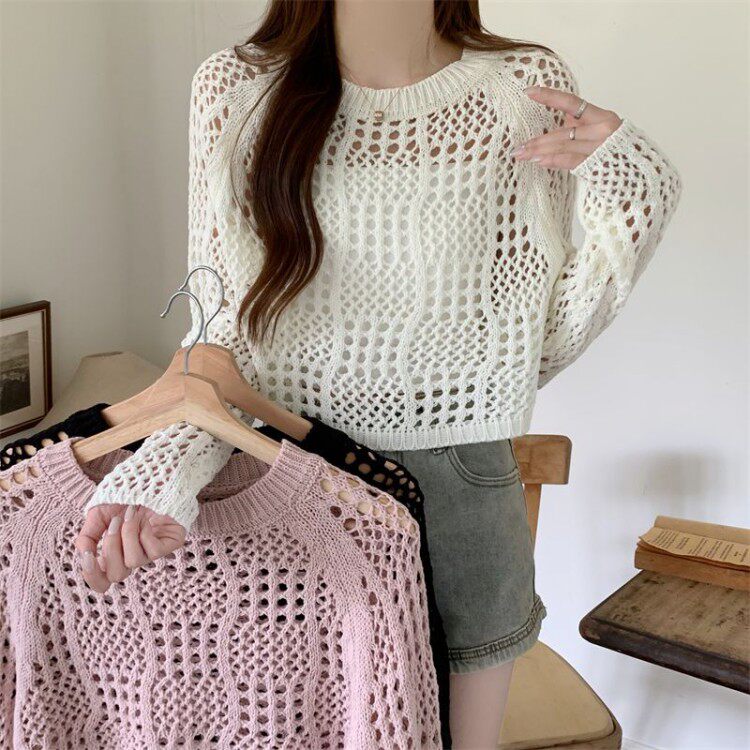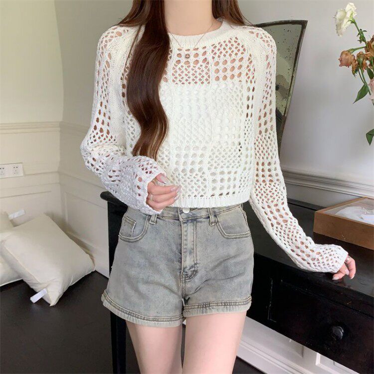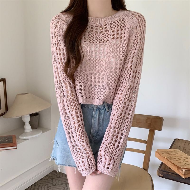American retro hollow sun protection knitted blouse 2025 early spring new women's loose slimming solid color sun protection sleeves