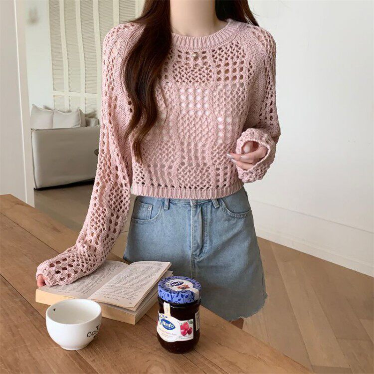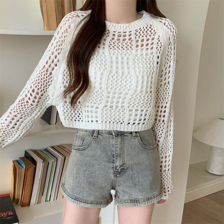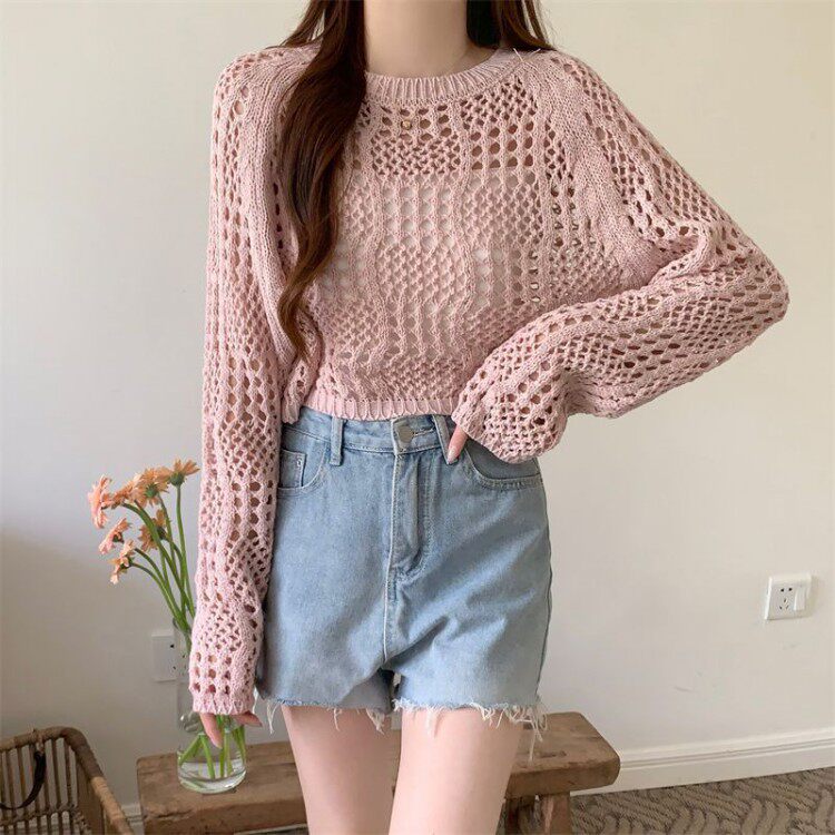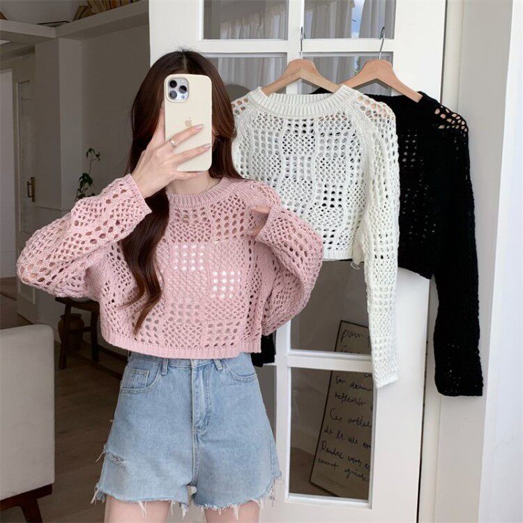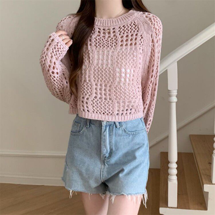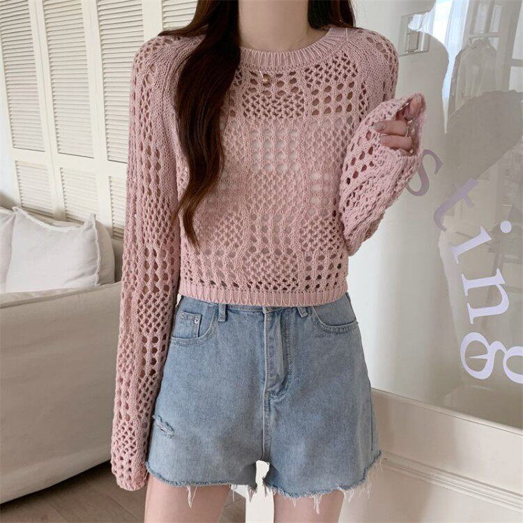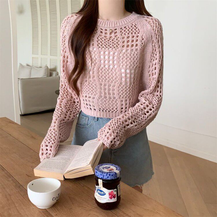 American retro hollow sun protection knitted blouse 2025 early spring new women's loose slimming solid color sun protection sleeves
