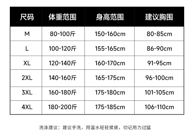 Size M (suitable for 80-100 Jin Jin equals 0.5 kg),L (suitable for 100-120 Jin Jin equals 0.5 kg),XL (suitable for 120-140 Jin Jin equals 0.5 kg),XXL (suitable for 140-160Jin Jin equal to 0.5kg),3XL (suitable for 160-180Jin Jin equal to 0.5kg),4XL (suitable for 180-200Jin Jin equal to 0.5kg)