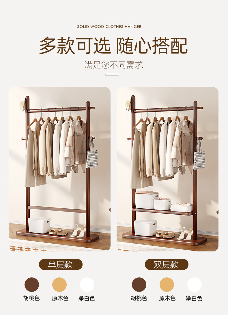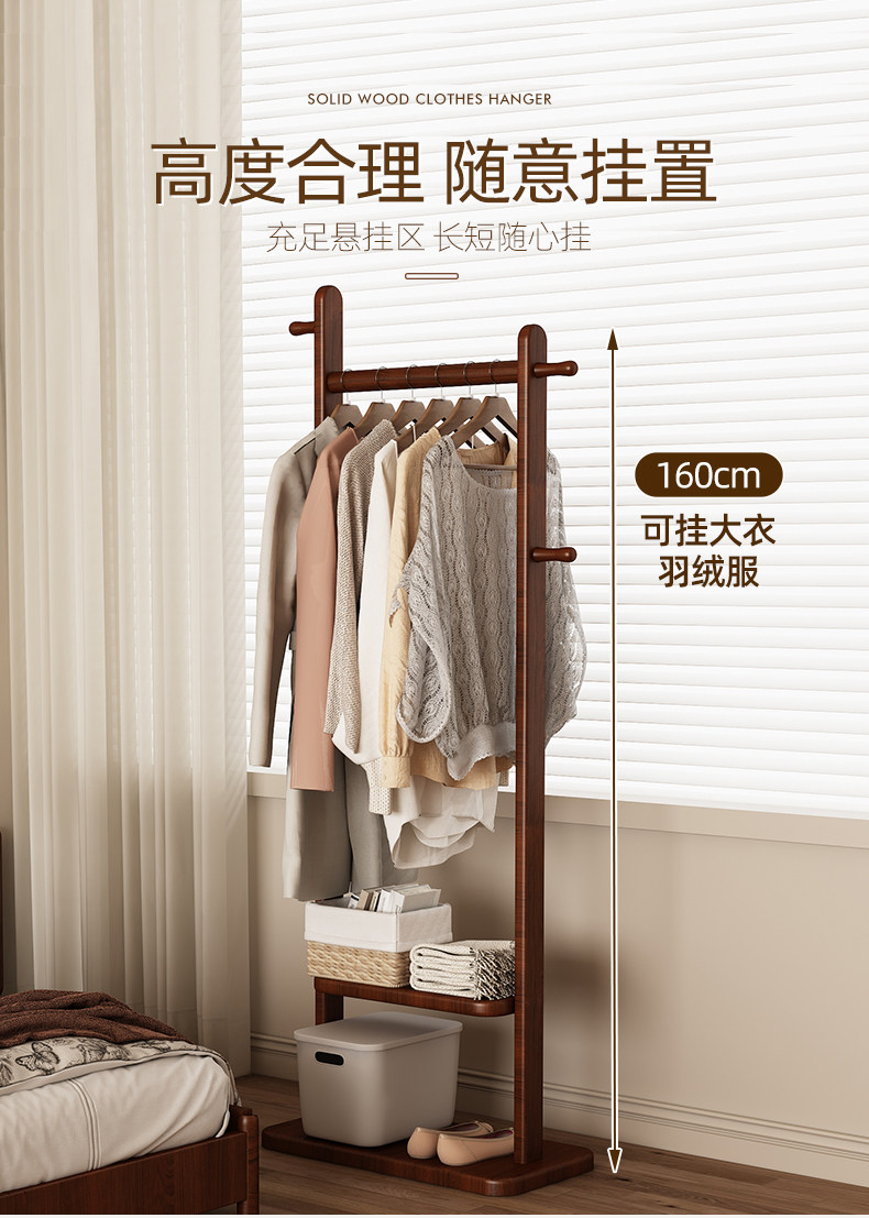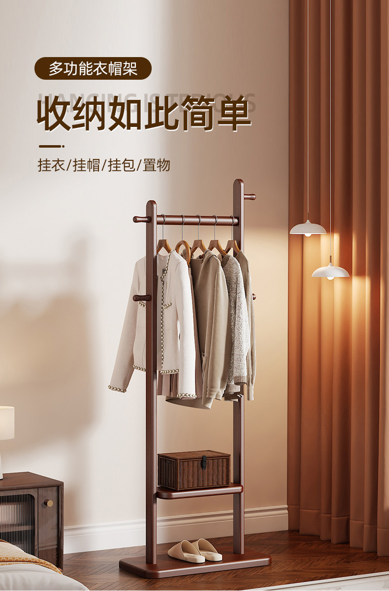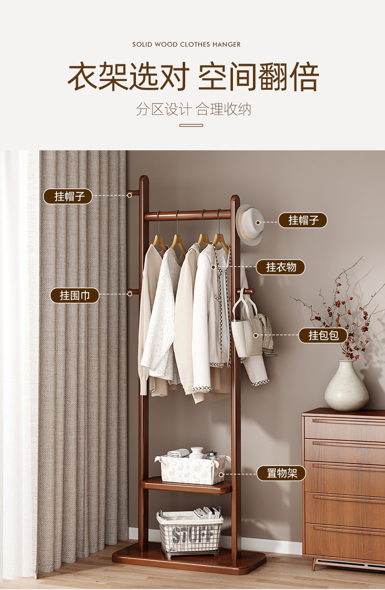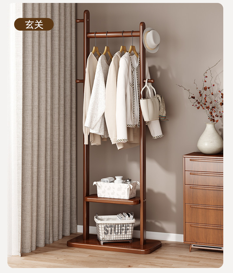 Black Walnut Color Solid Wood Floor-Standing Clothes Rack for Bedroom, Simple Home Use Clothes and Hat Rack, Clothes Hanging Rod