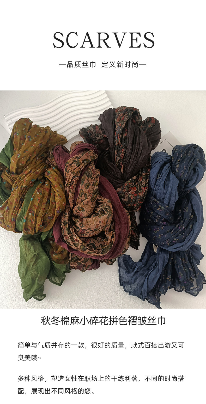 2025 New Spring and Autumn Retro Artistic Floral Scarf for Women, Color-Blocking Ethnic Style Cotton and Linen Feel Silk Scarf, Long Shawl