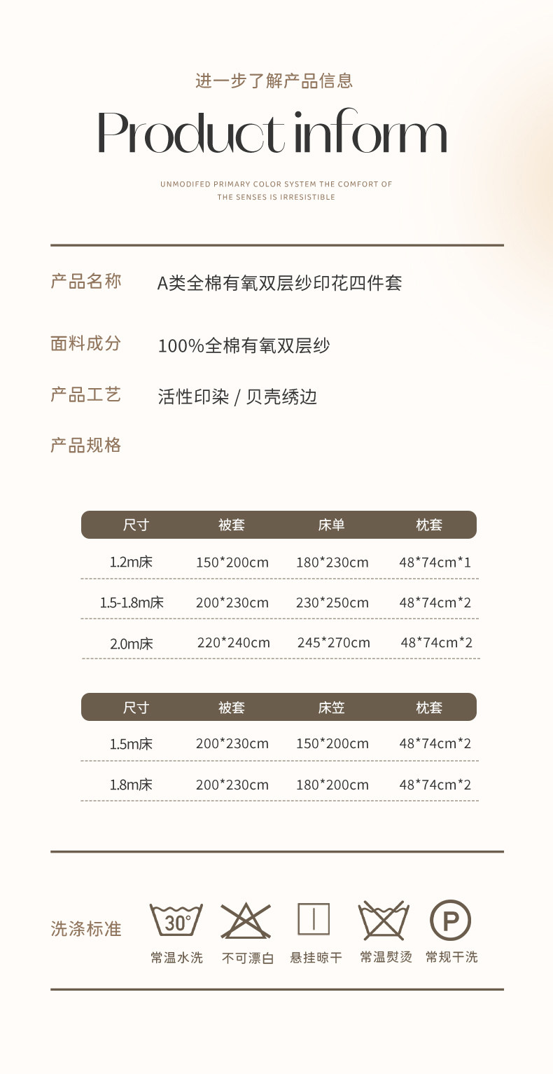 Applicable bed size 1.2m bed three-piece bed sheet set - suitable for 150x200cm quilt core,1.5m bed bed sheet four-piece set - suitable for 200x230cm quilt core,1.8m bed bed sheet four-piece set - suitable for 200x230cm quilt core,1.5m bed four-piece fitted sheet set - suitable for 200x230cm quilt core,1.8m bed four-piece fitted sheet set - suitable for 200x230cm quilt core