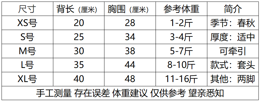 Size XS Back Length 20cm (Recommended 0.5-1.0kg),S Back Length 25cm (Recommended 1.5-2kg),M Back Length 30cm (Recommended 2.5-3.5kg),L Back Length 35cm (Recommended 4-5kg),XL Back Length 40cm (Recommended 5.5-8kg)