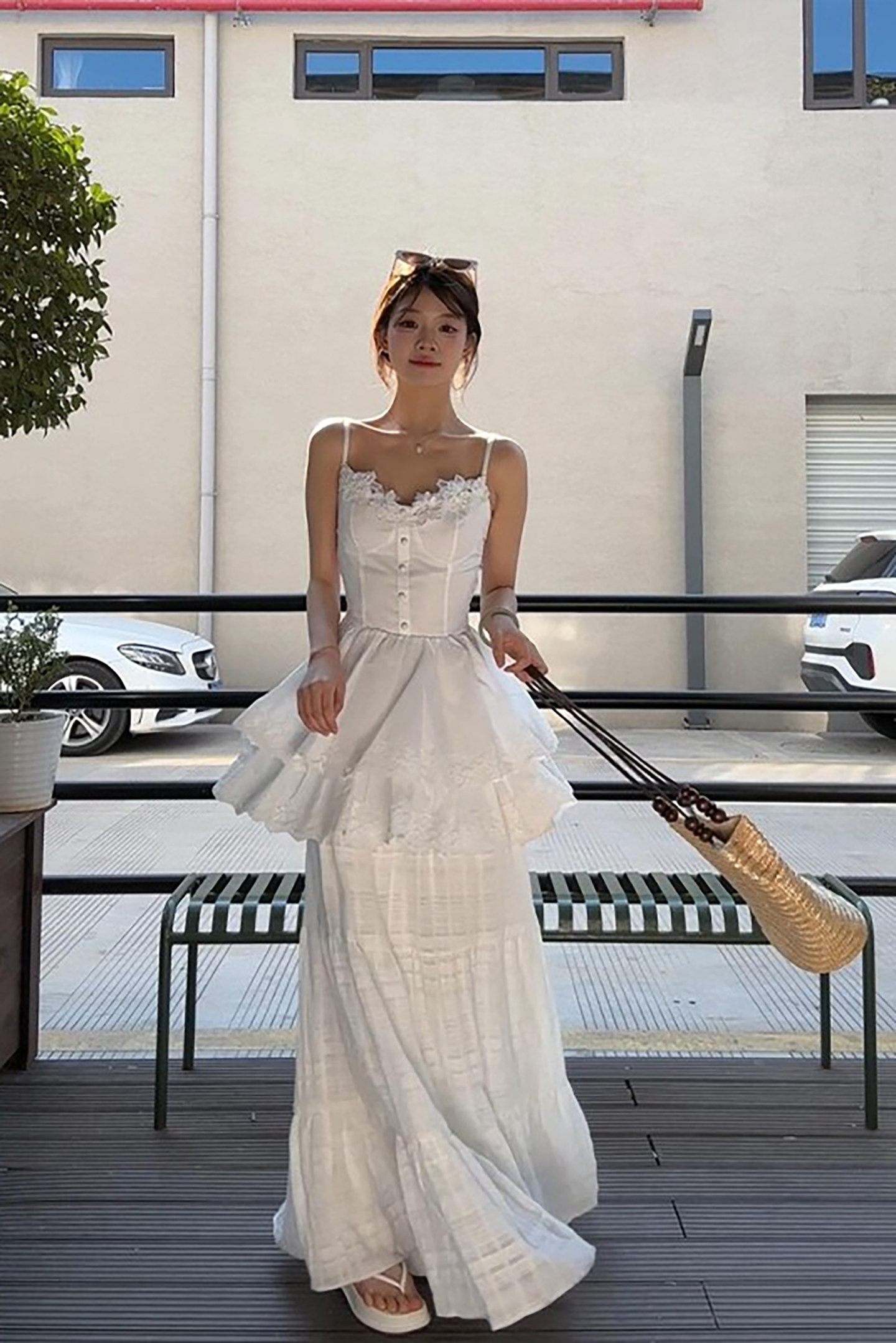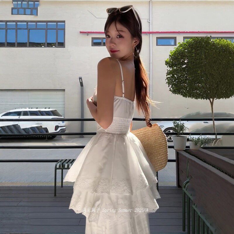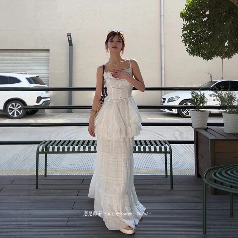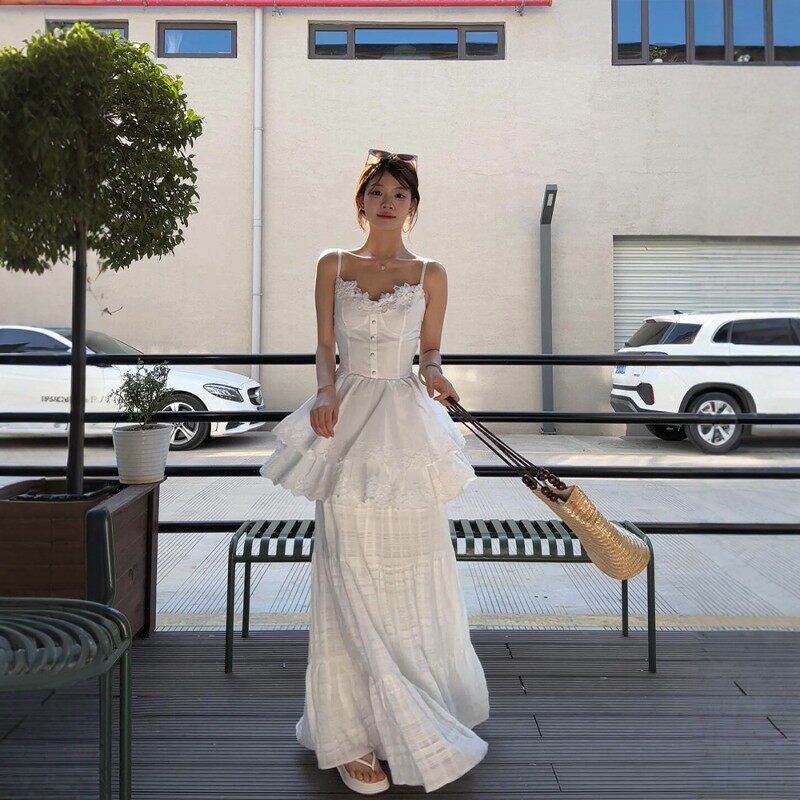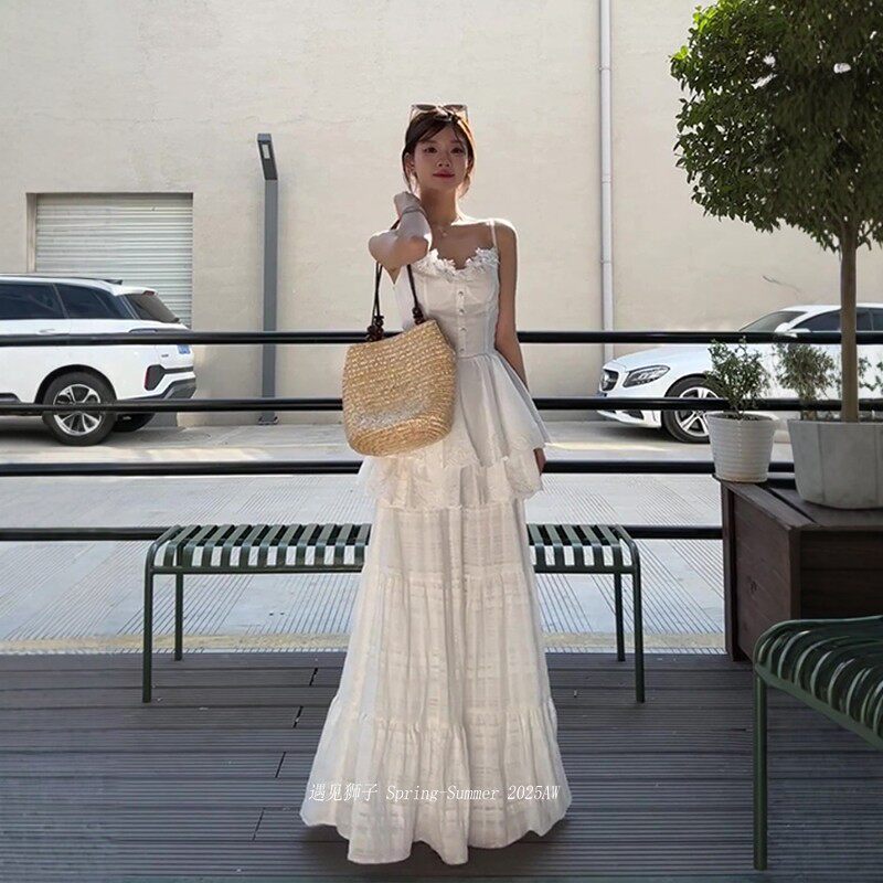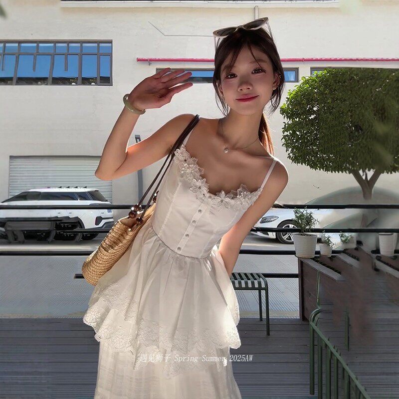 White lace splicing flower suspender skirt suit women's summer french seaside resort style long skirt two-piece set
