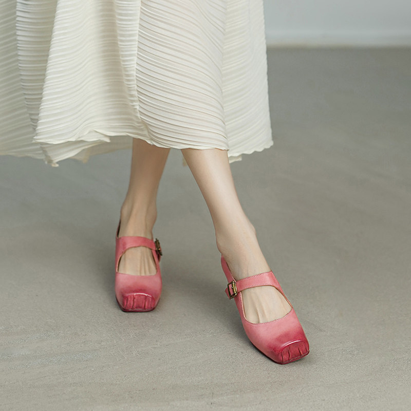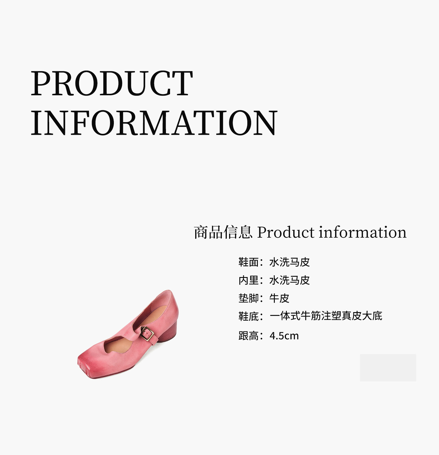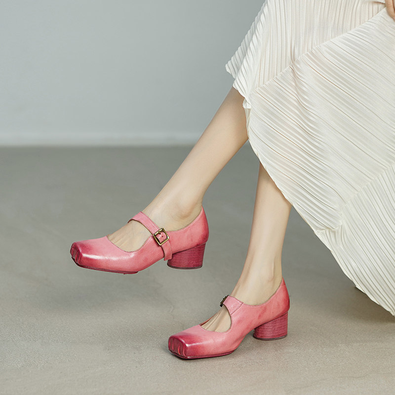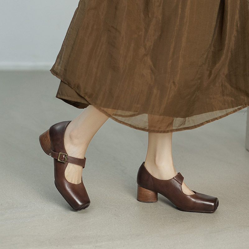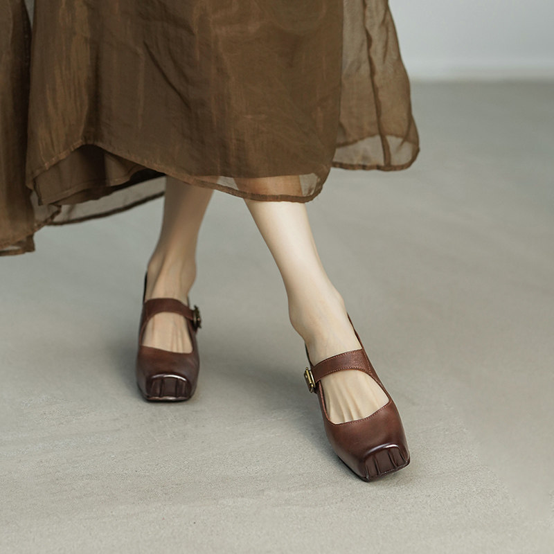 Original Ultra-Soft Washed Horse Leather Retro Mary Jane Shoes for Women, Spring Mid-Heel Chunky Heel Soft Sole Pig Nose Ballet Flats