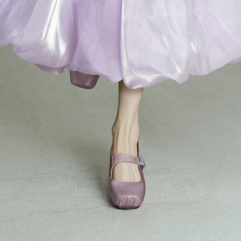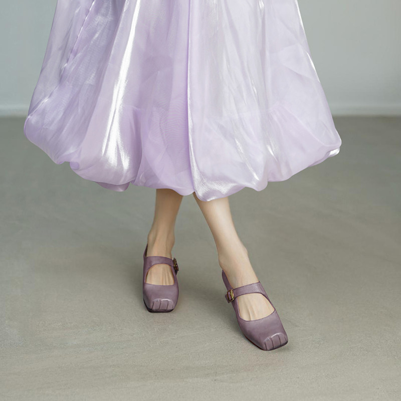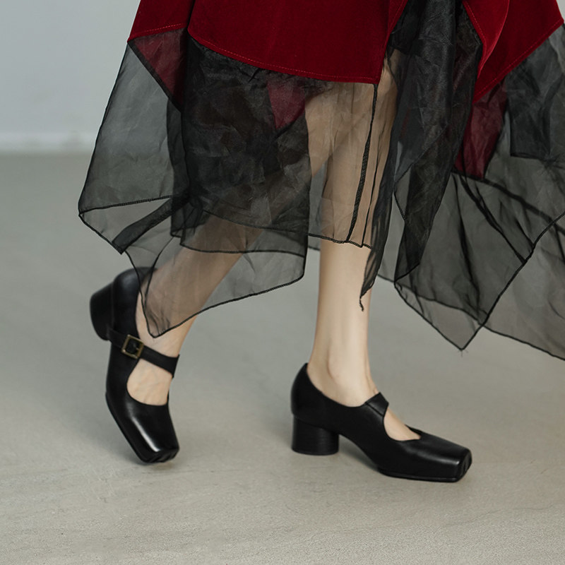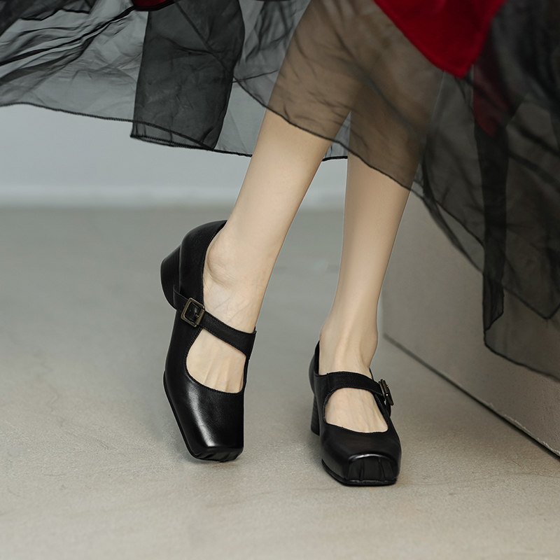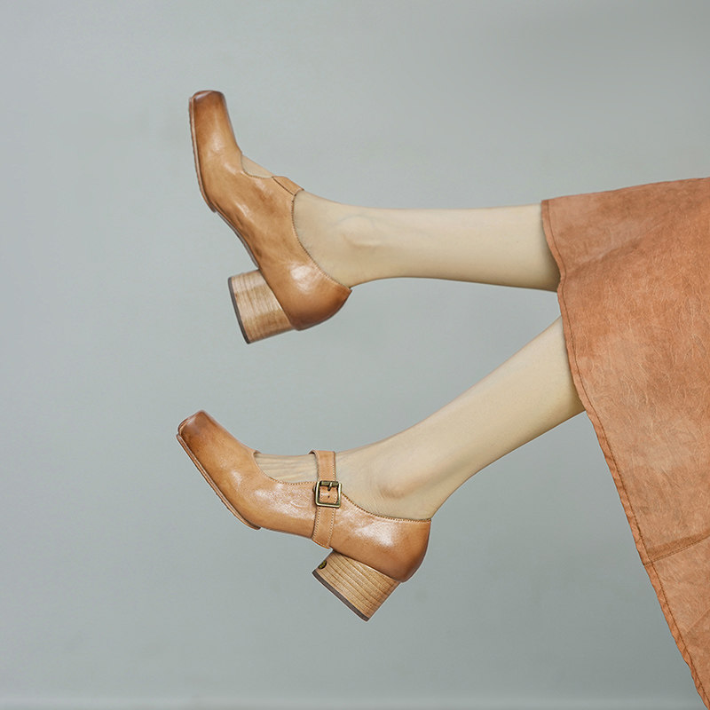 Original Ultra-Soft Washed Horse Leather Retro Mary Jane Shoes for Women, Spring Mid-Heel Chunky Heel Soft Sole Pig Nose Ballet Flats