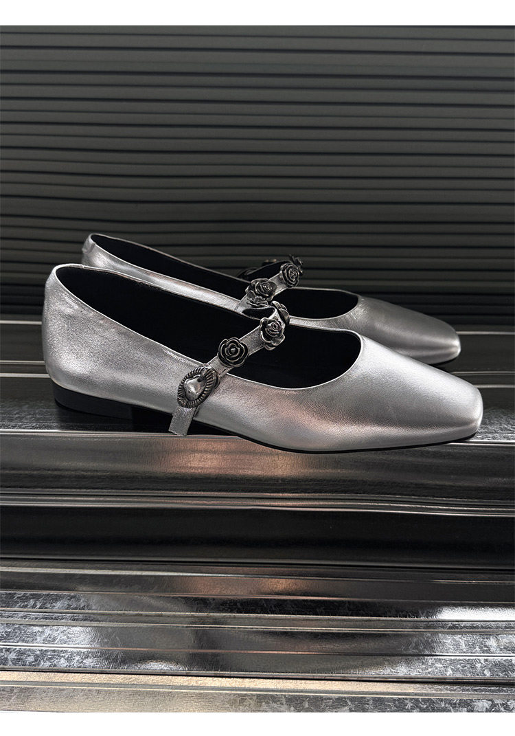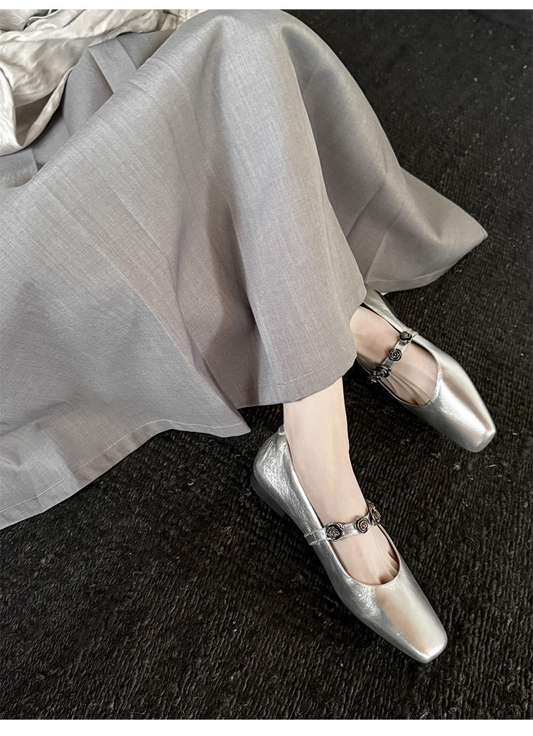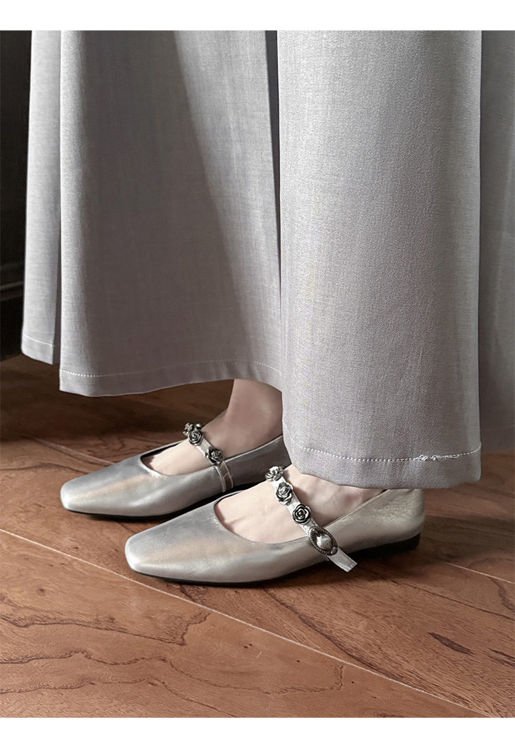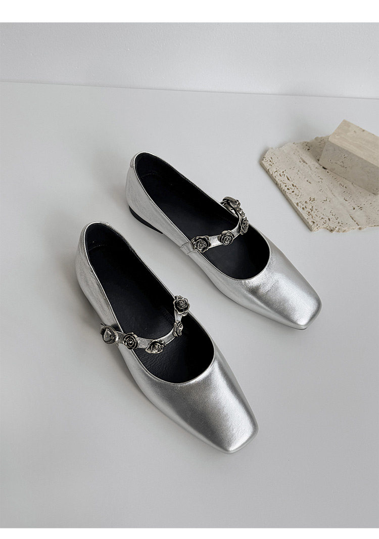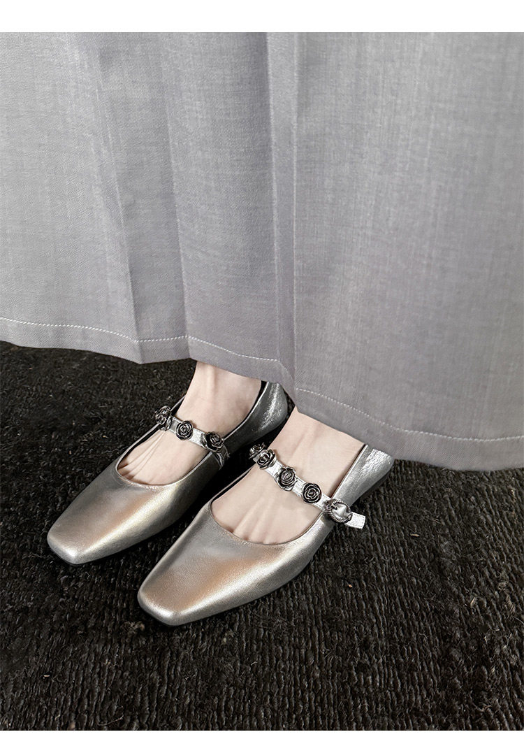Genuine Leather Square Toe Camellia Buckle Mary Jane Shoes for Women Silver Shallow Mouth Women's Shoes Comfortable and Versatile Flats Shoes