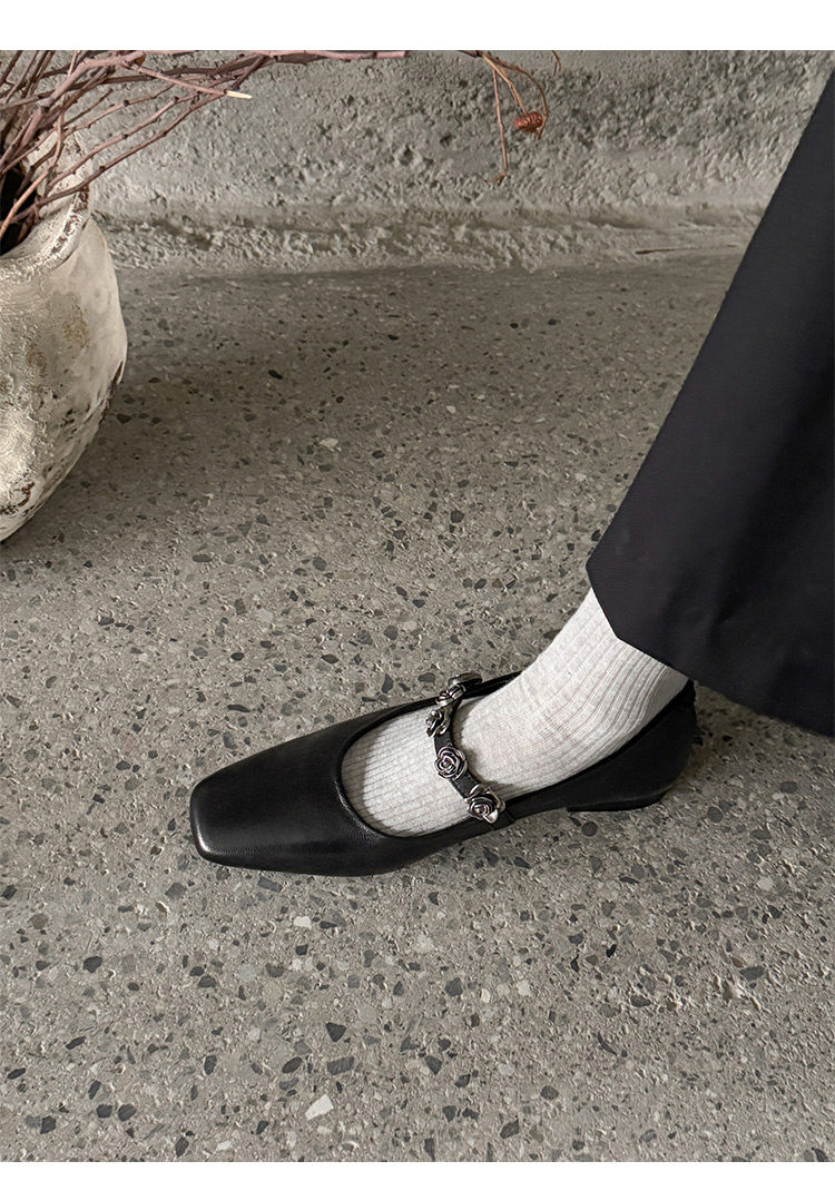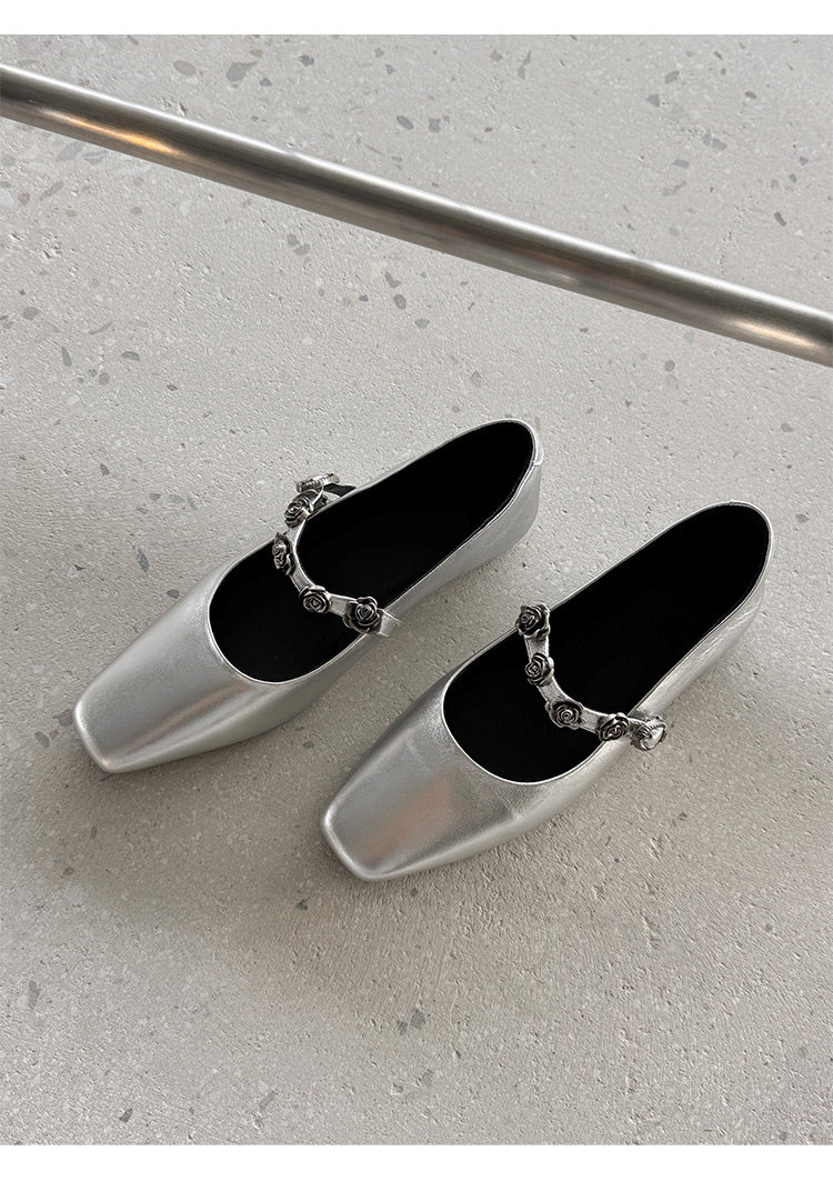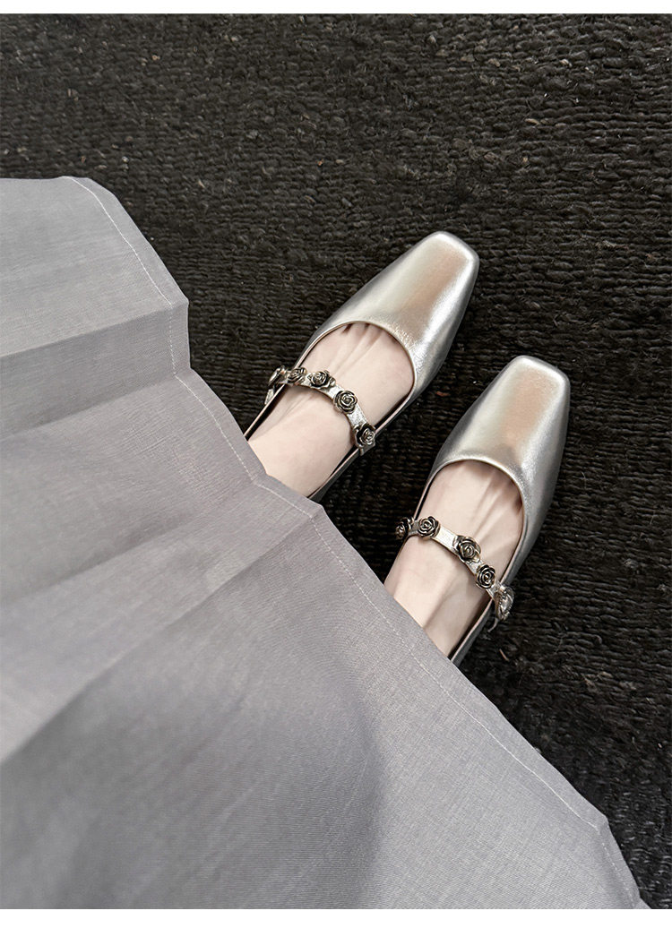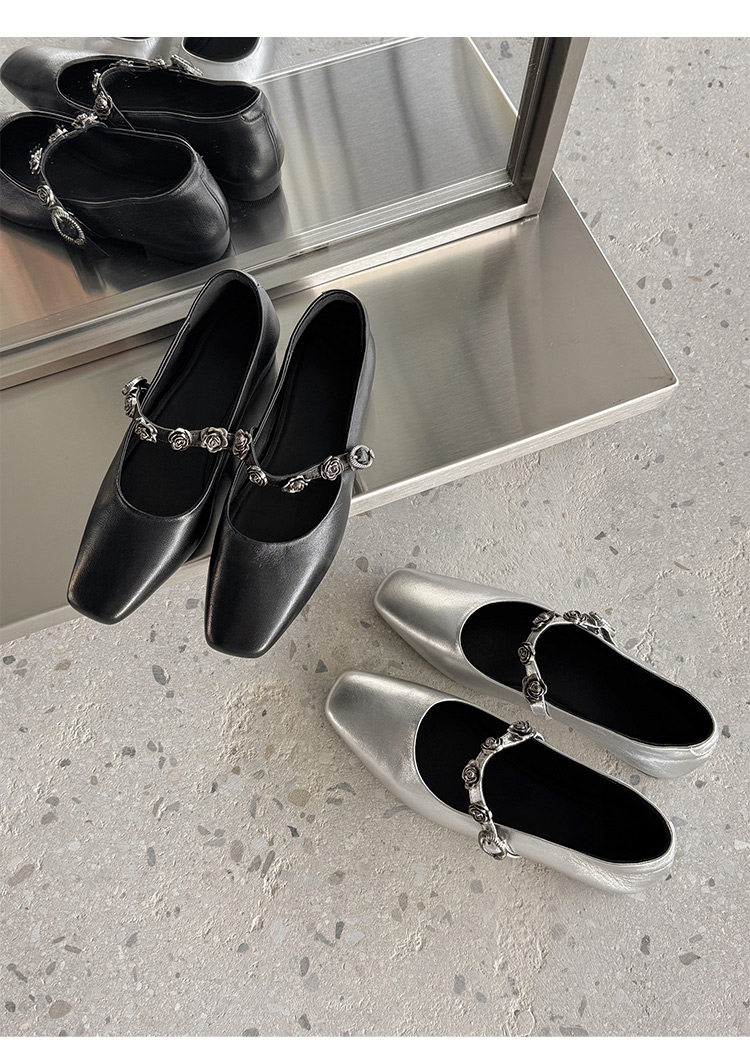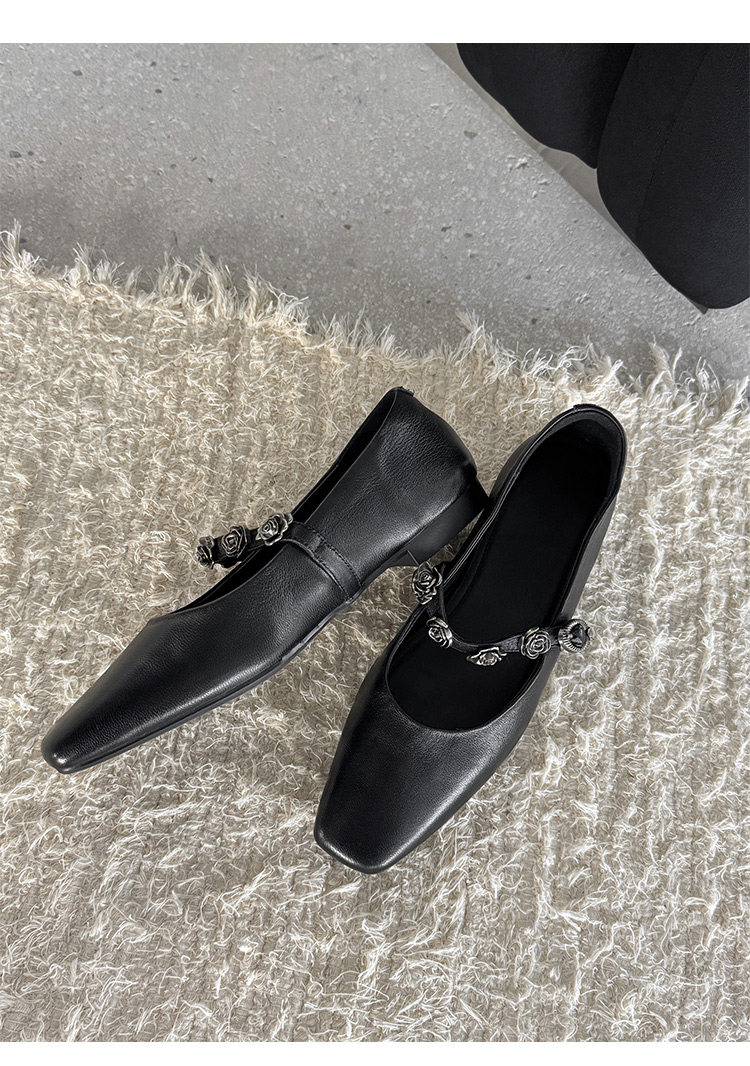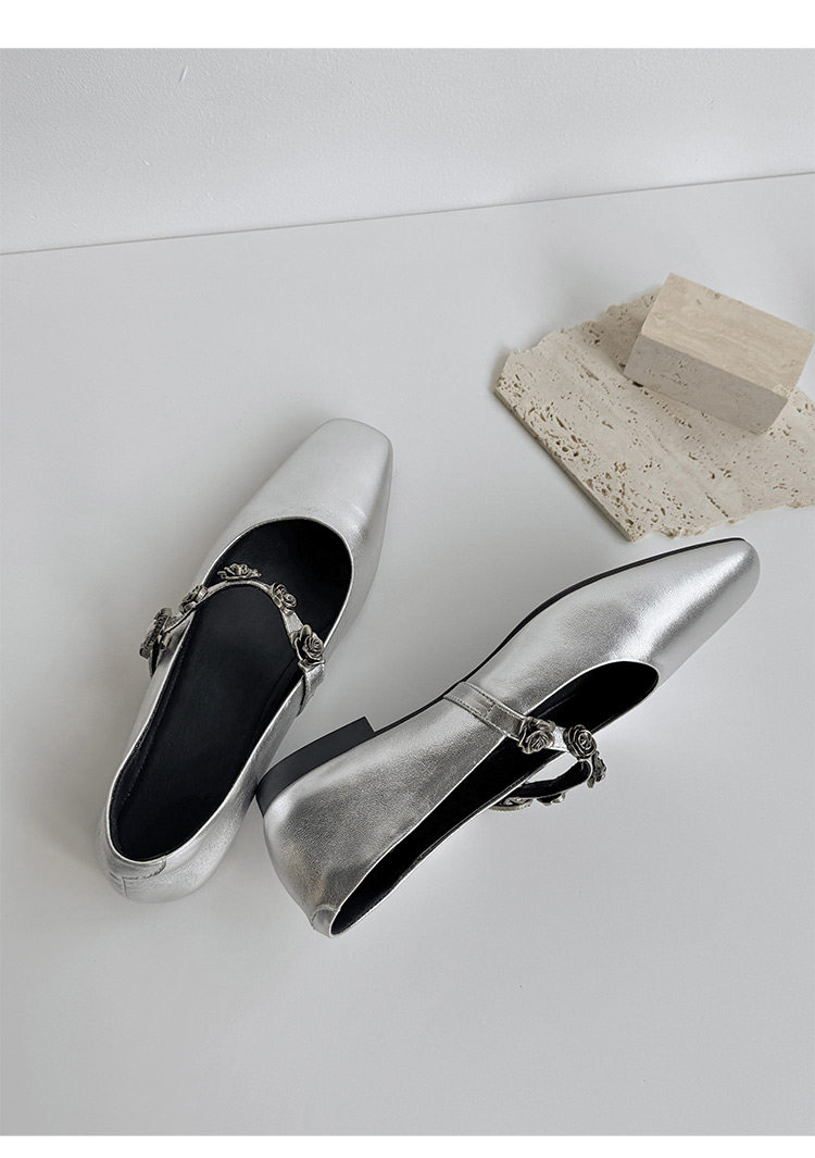 Genuine Leather Square Toe Camellia Buckle Mary Jane Shoes for Women Silver Shallow Mouth Women's Shoes Comfortable and Versatile Flats Shoes