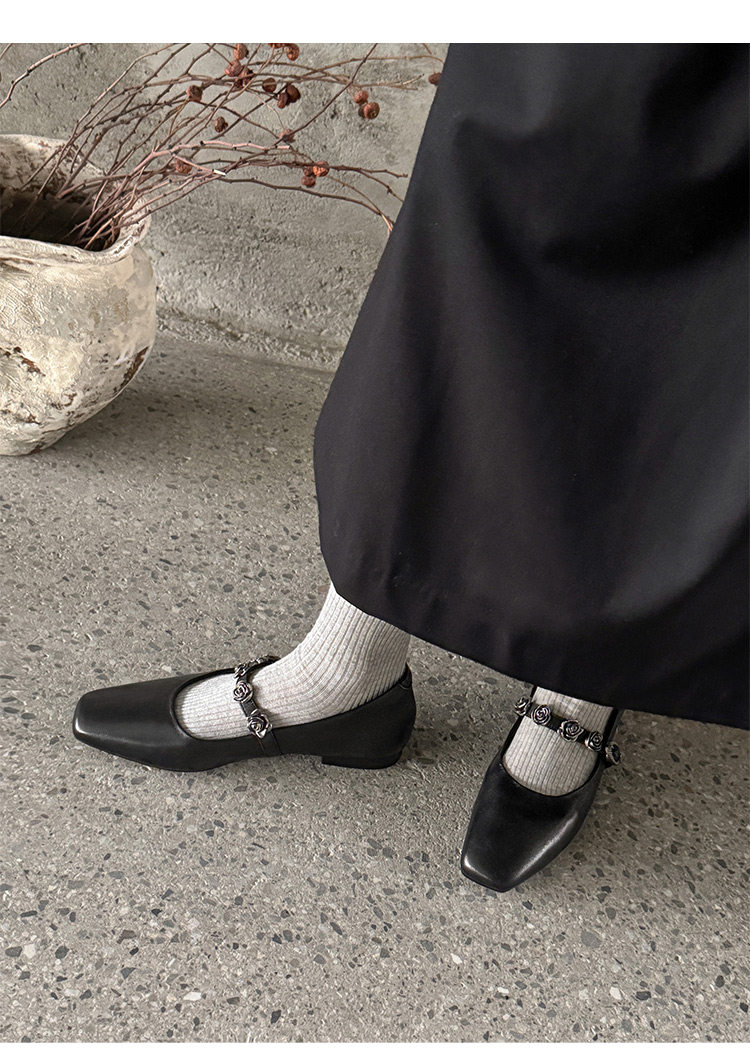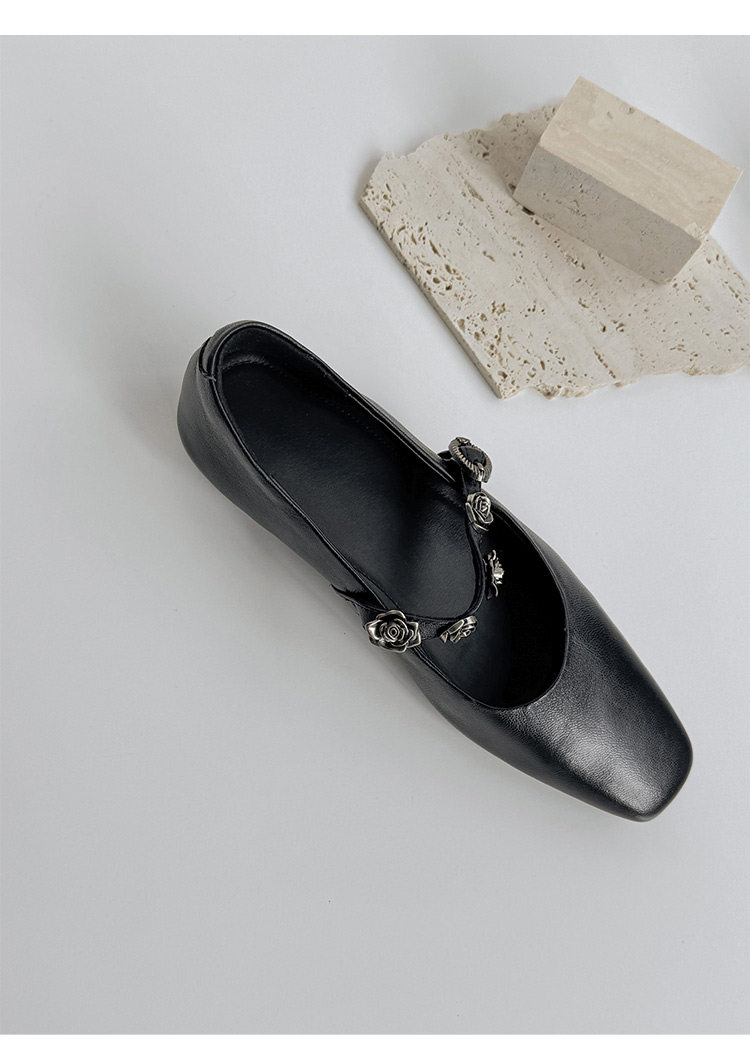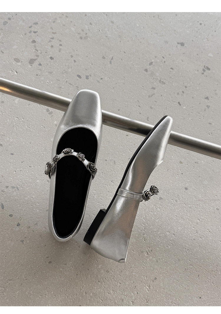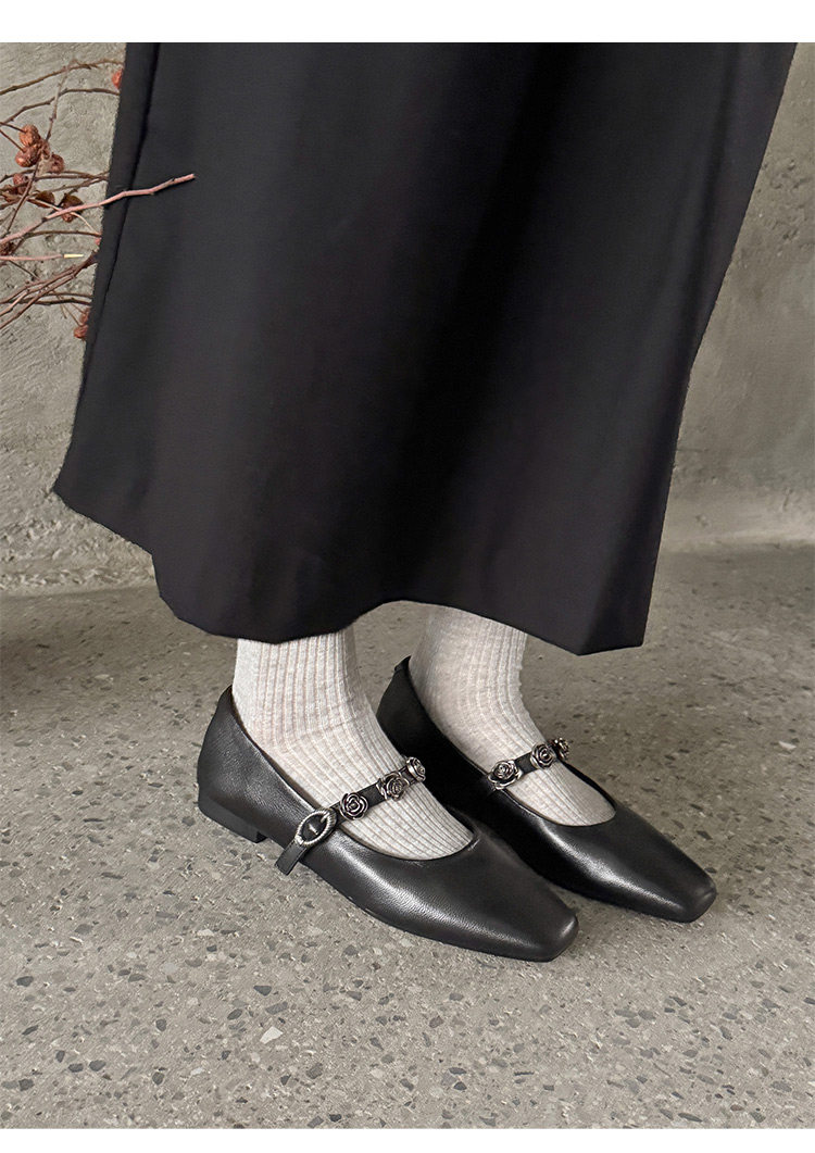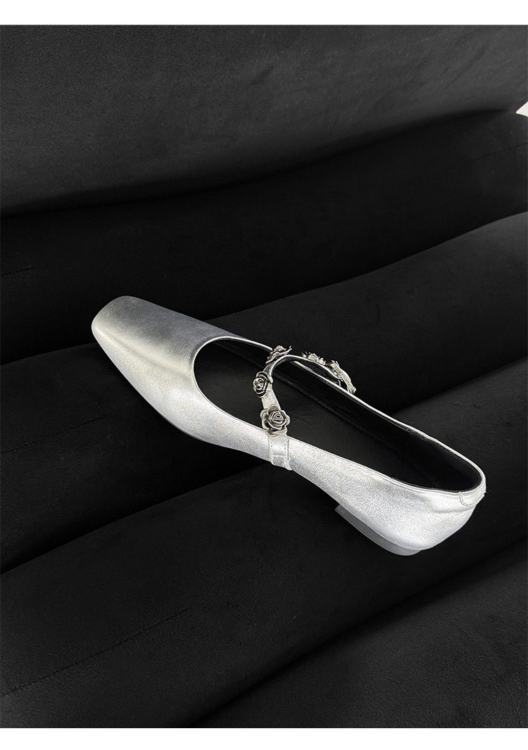 Genuine Leather Square Toe Camellia Buckle Mary Jane Shoes for Women Silver Shallow Mouth Women's Shoes Comfortable and Versatile Flats Shoes