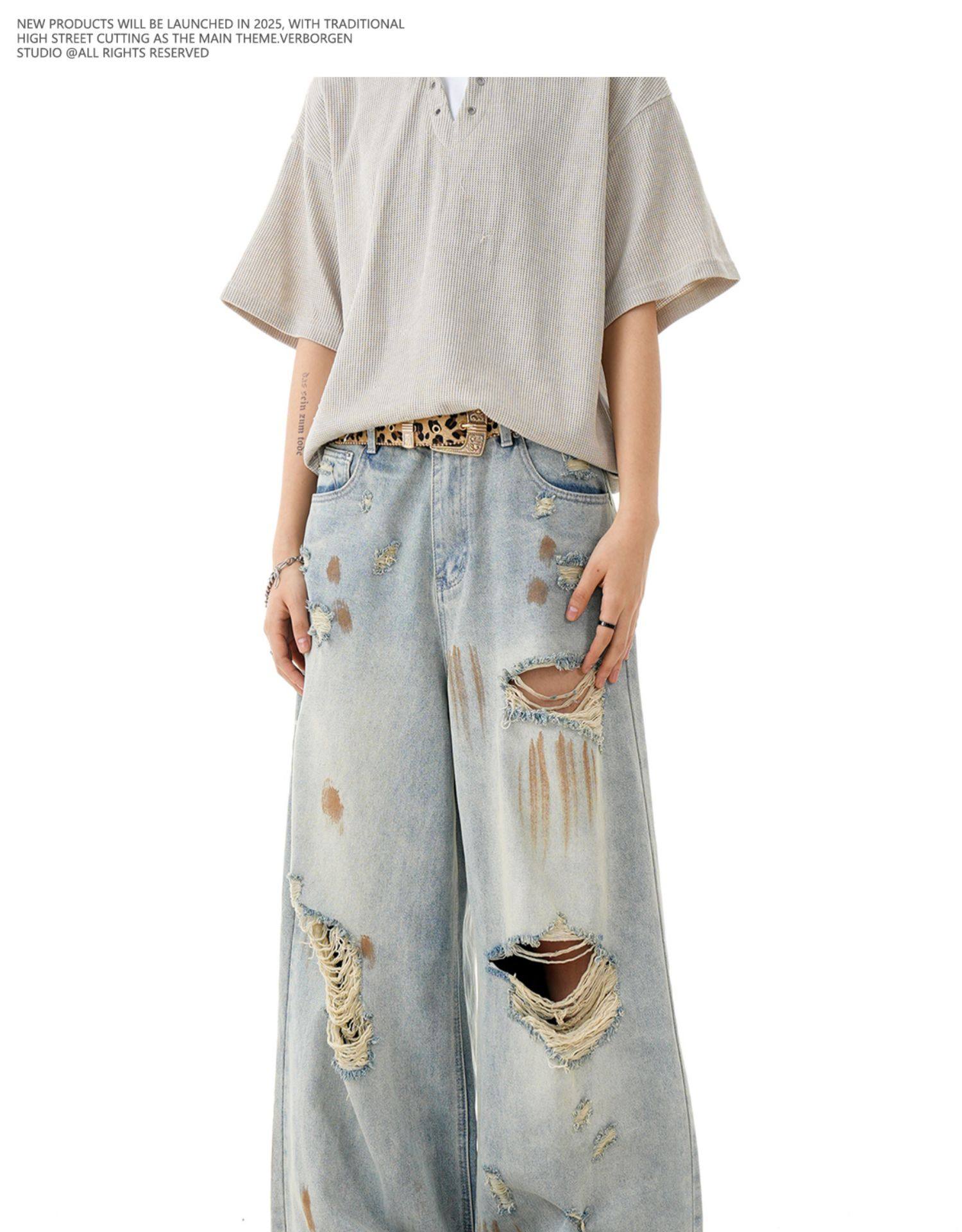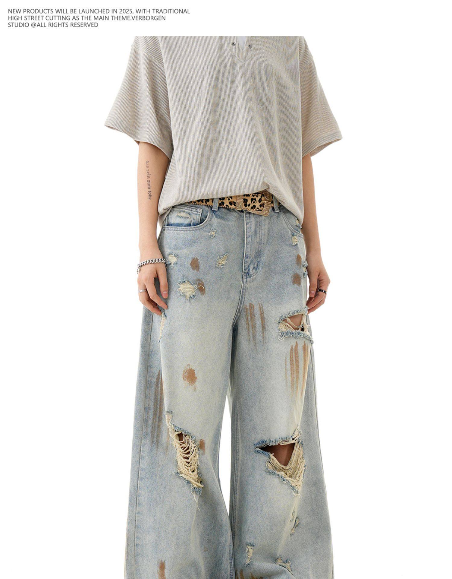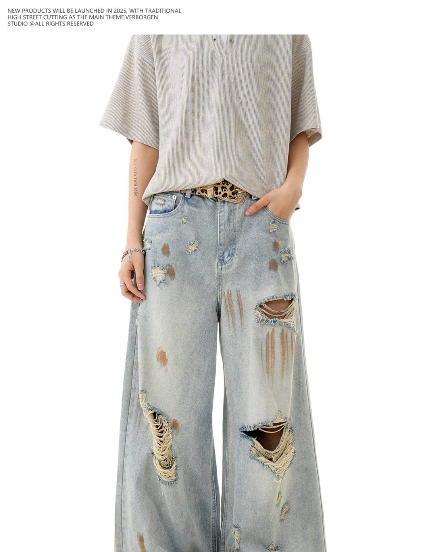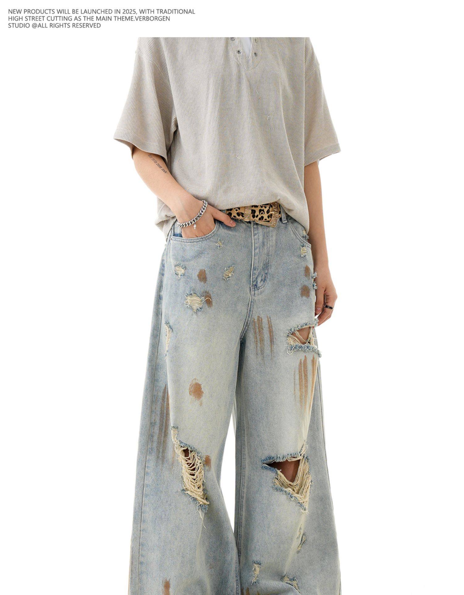 Verborgen American Retro Blue Ripped Distressed Jeans for Men, High Street Trendy Brand, Niche Design Long Pants
