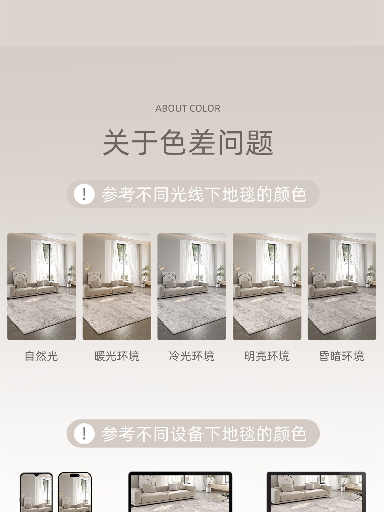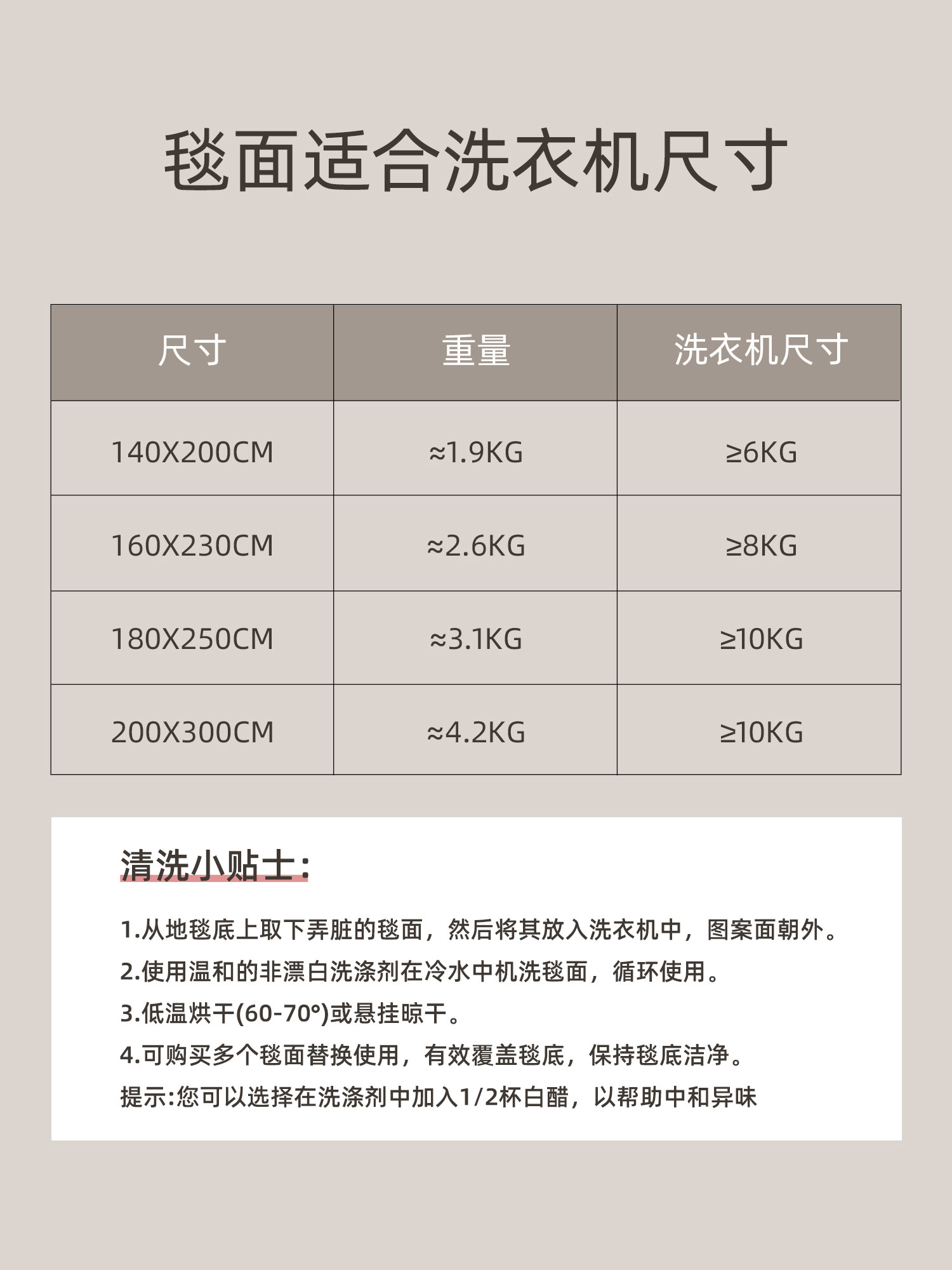 Carpet Size 140×200cm (Carpet Surface + 10mm Buffer Bottom),160×230cm (Carpet Surface + 10mm Buffer Bottom),180×250cm (Carpet Surface + 10mm Buffer Bottom),200×300cm (Carpet Surface + 10mm Buffer Bottom)