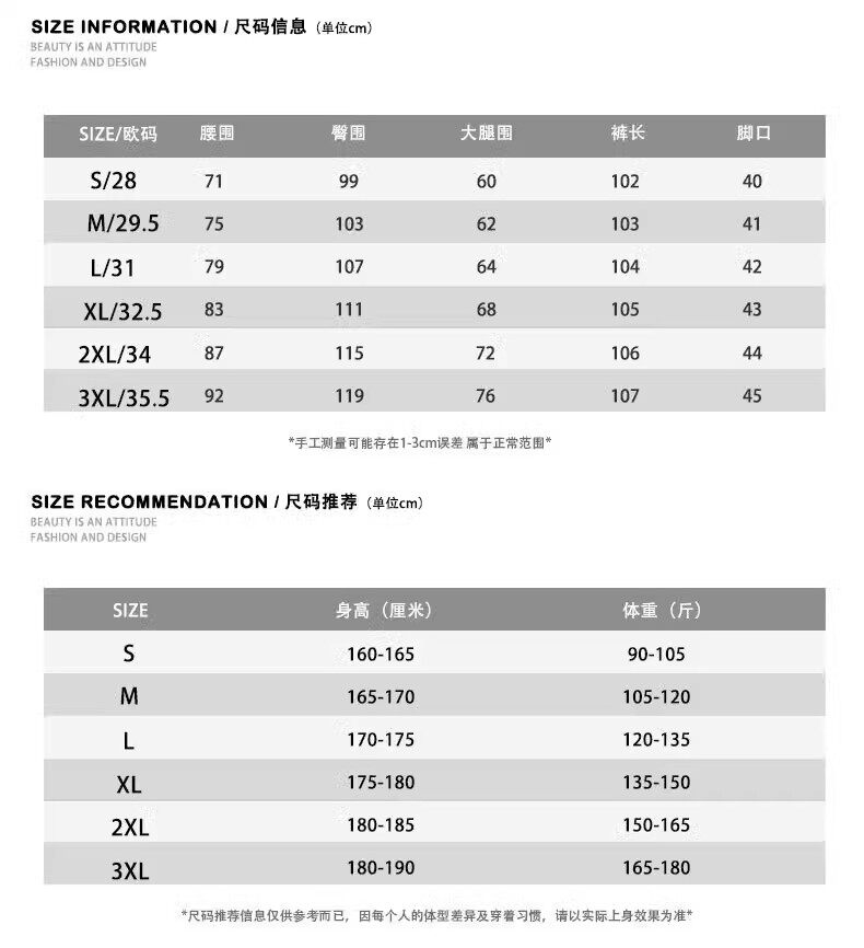 Outseam (cm) 99 cm 101.5 cm 104 cm 106.5 cm 109 cm