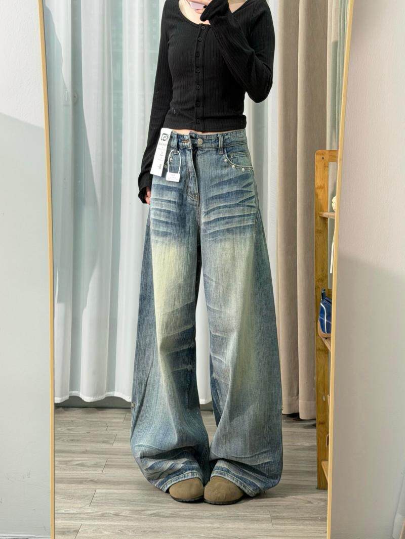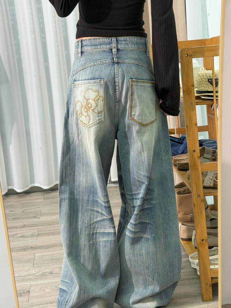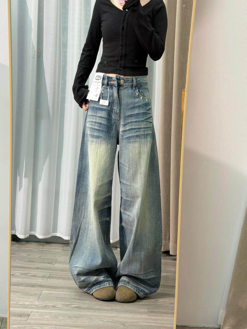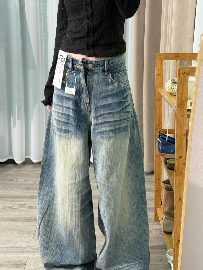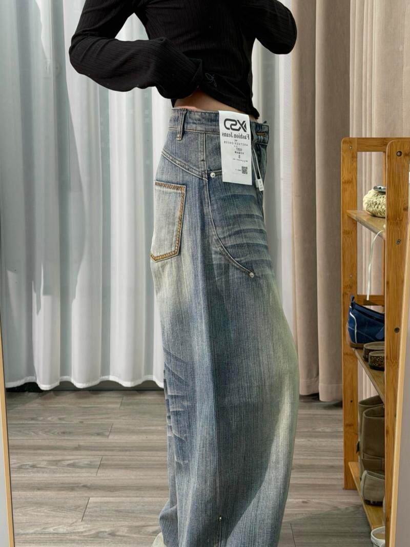 Washed crease scimitar jeans west coast american style high street vibe loose slimming straight wide leg pants for men