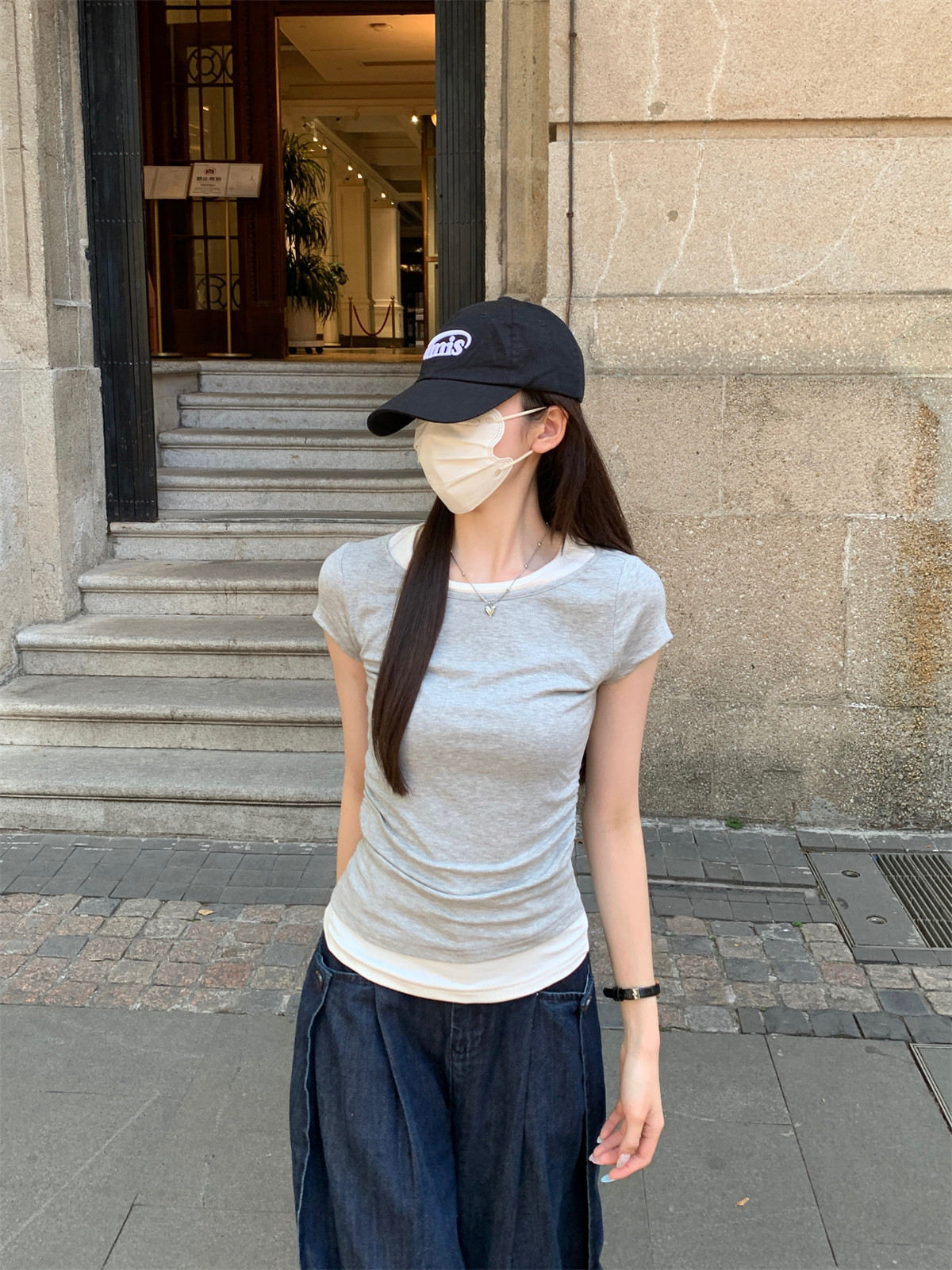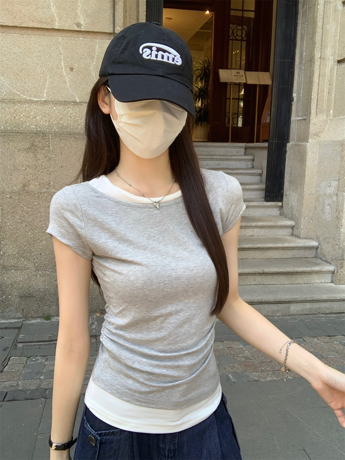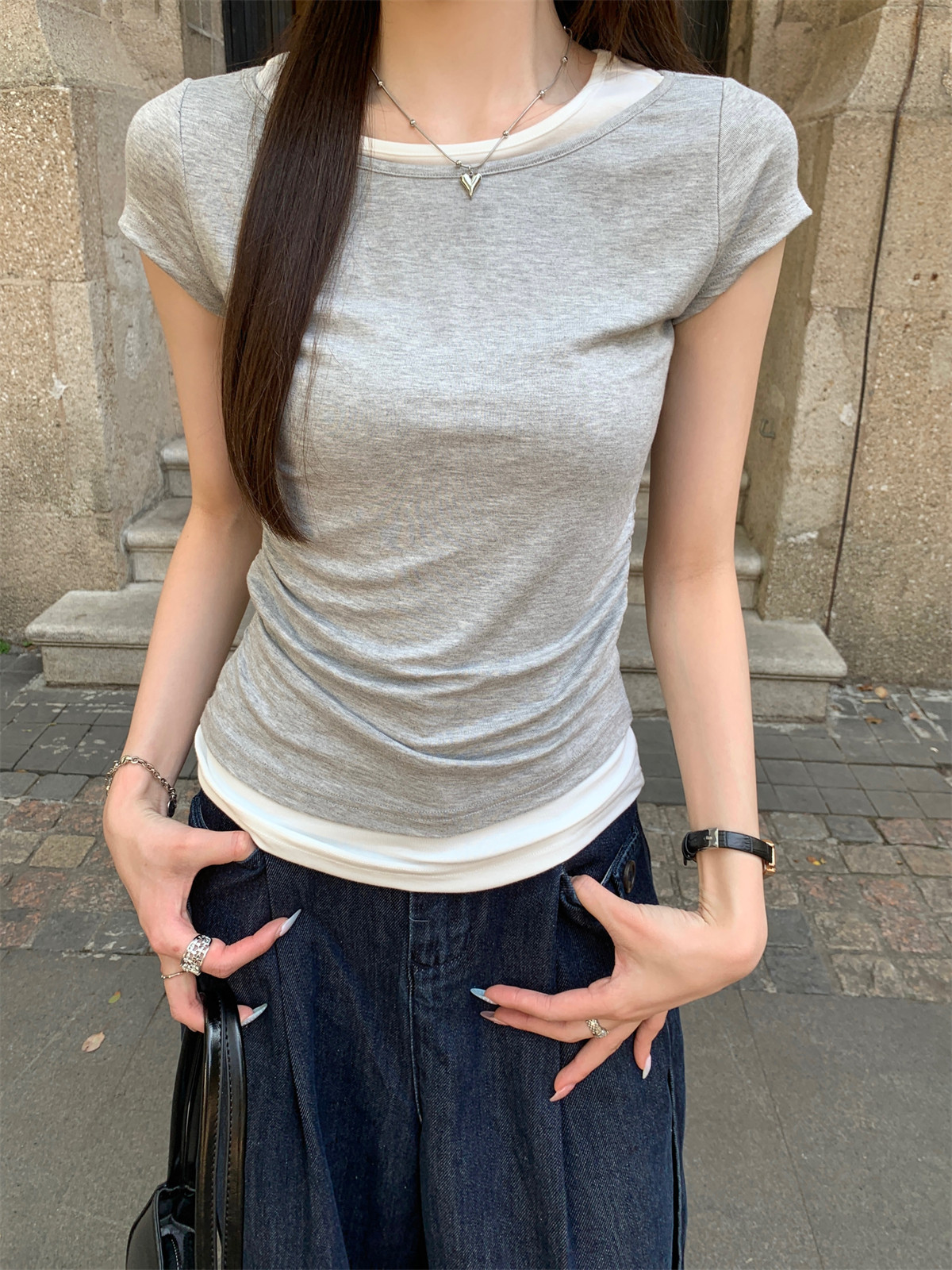 Suseyiku summer Korean style contrasting round neck pleated design modal short-sleeved T-shirt top