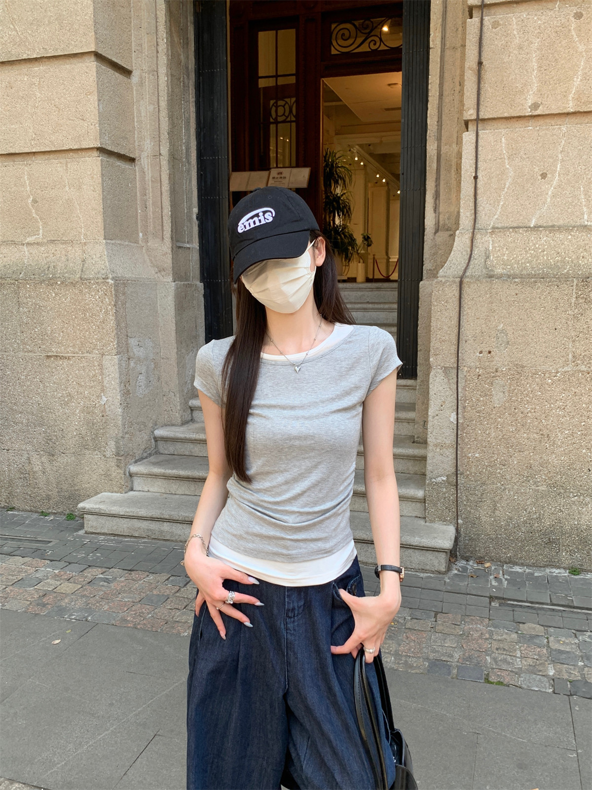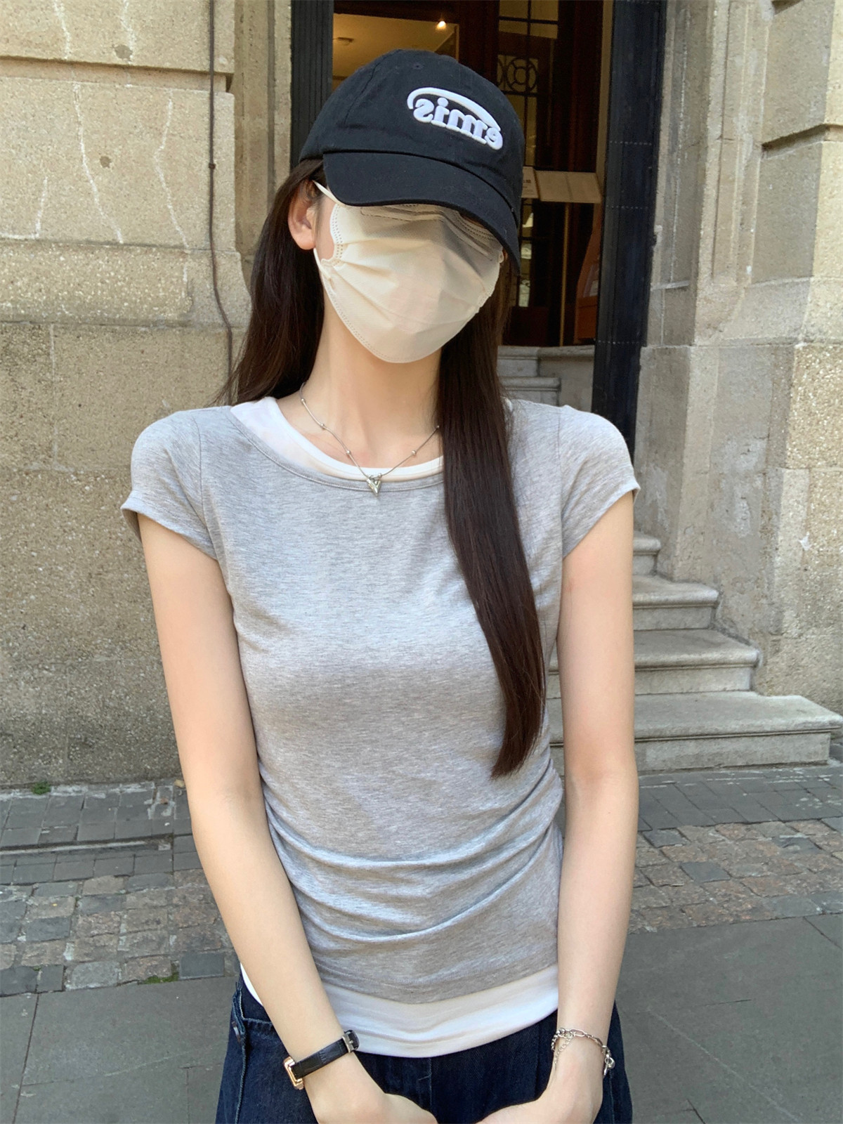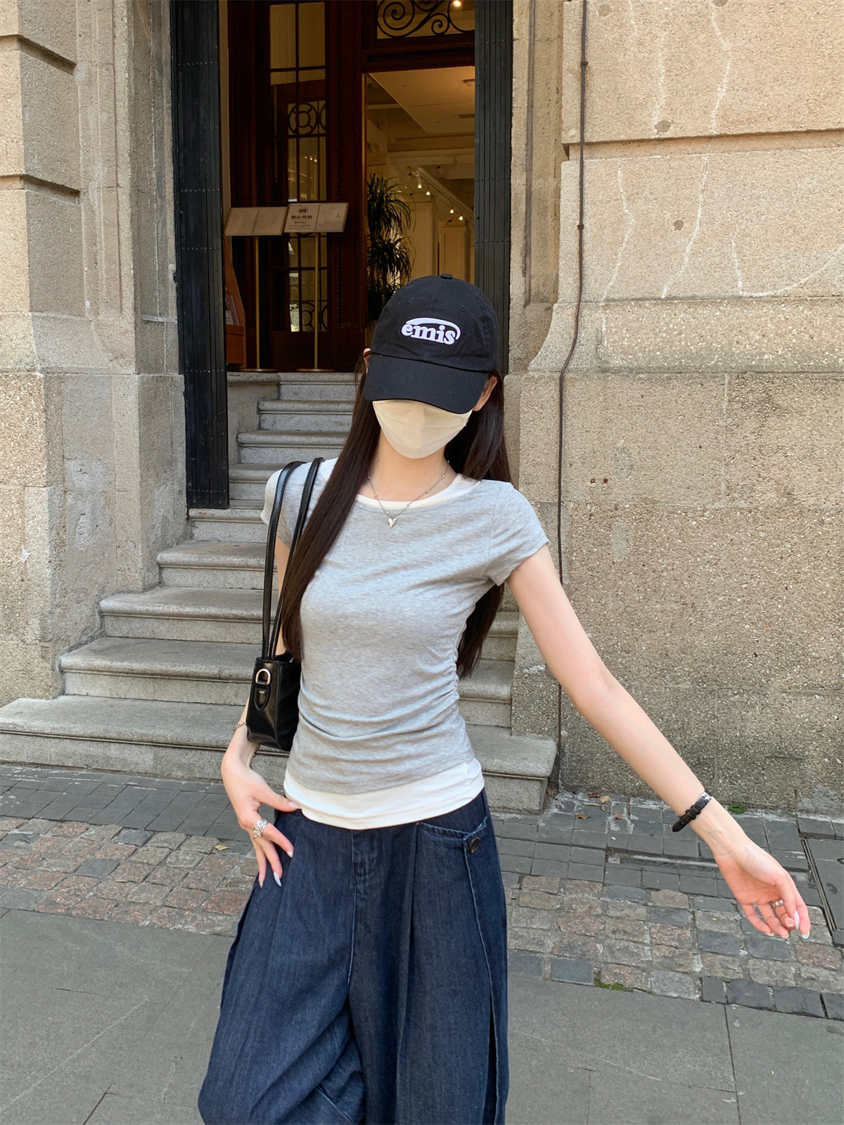 Suseyiku summer Korean style contrasting round neck pleated design modal short-sleeved T-shirt top