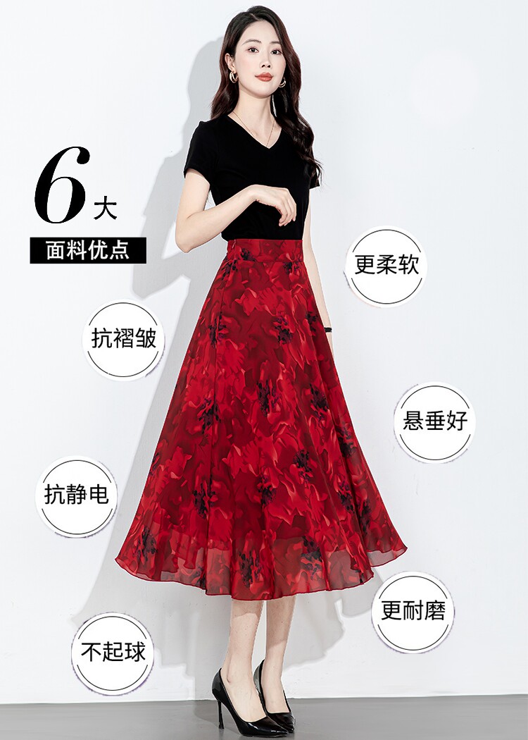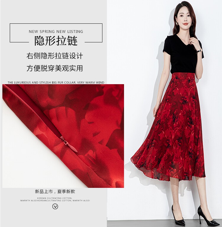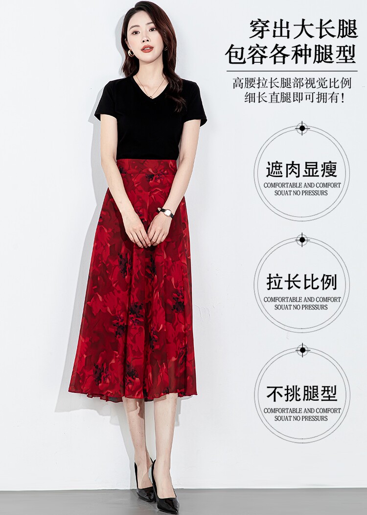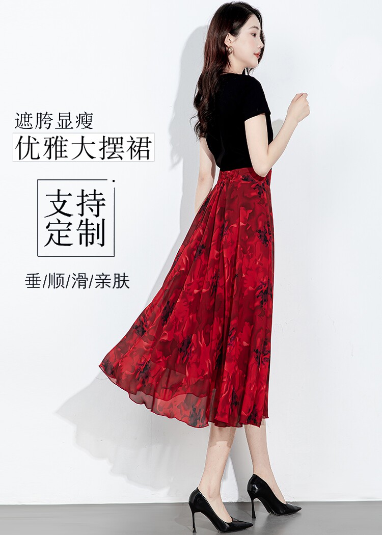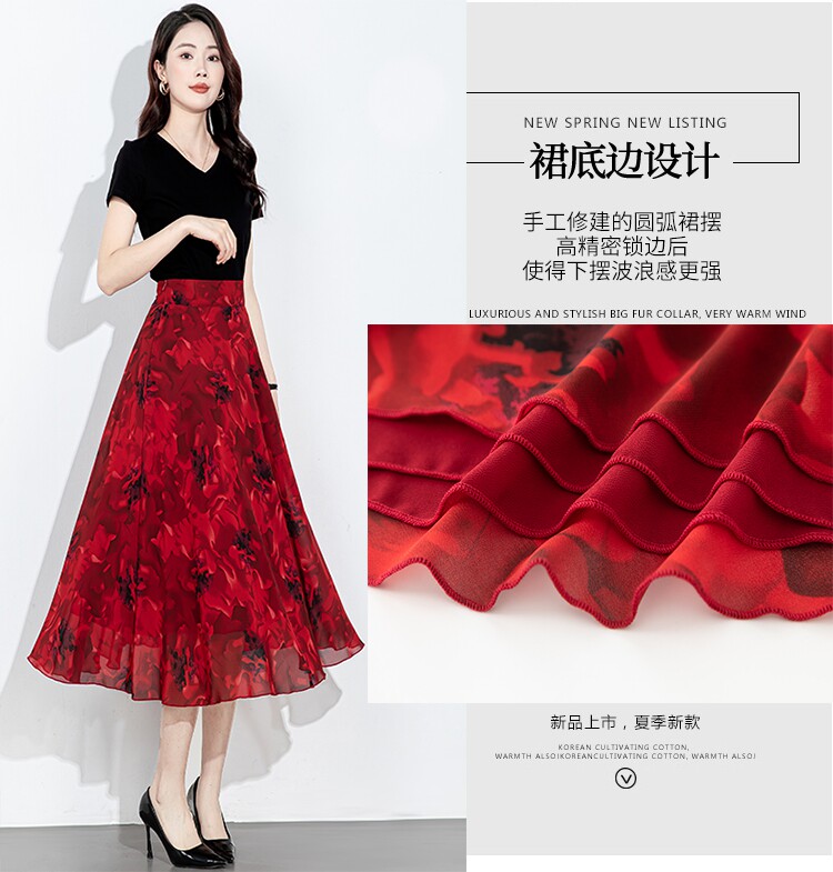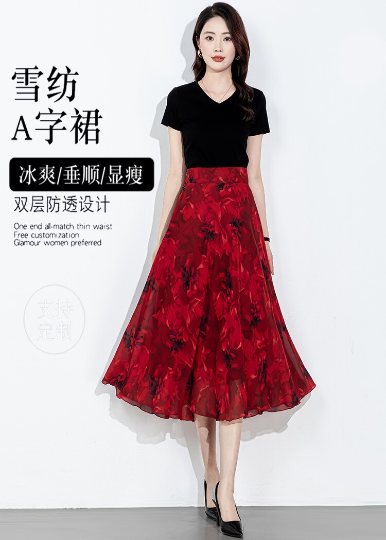 2025 New Summer Chiffon Red Ink Print Skirt for Women, High-Waisted Slim Midi Skirt, Dance Flared Skirt