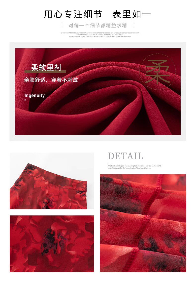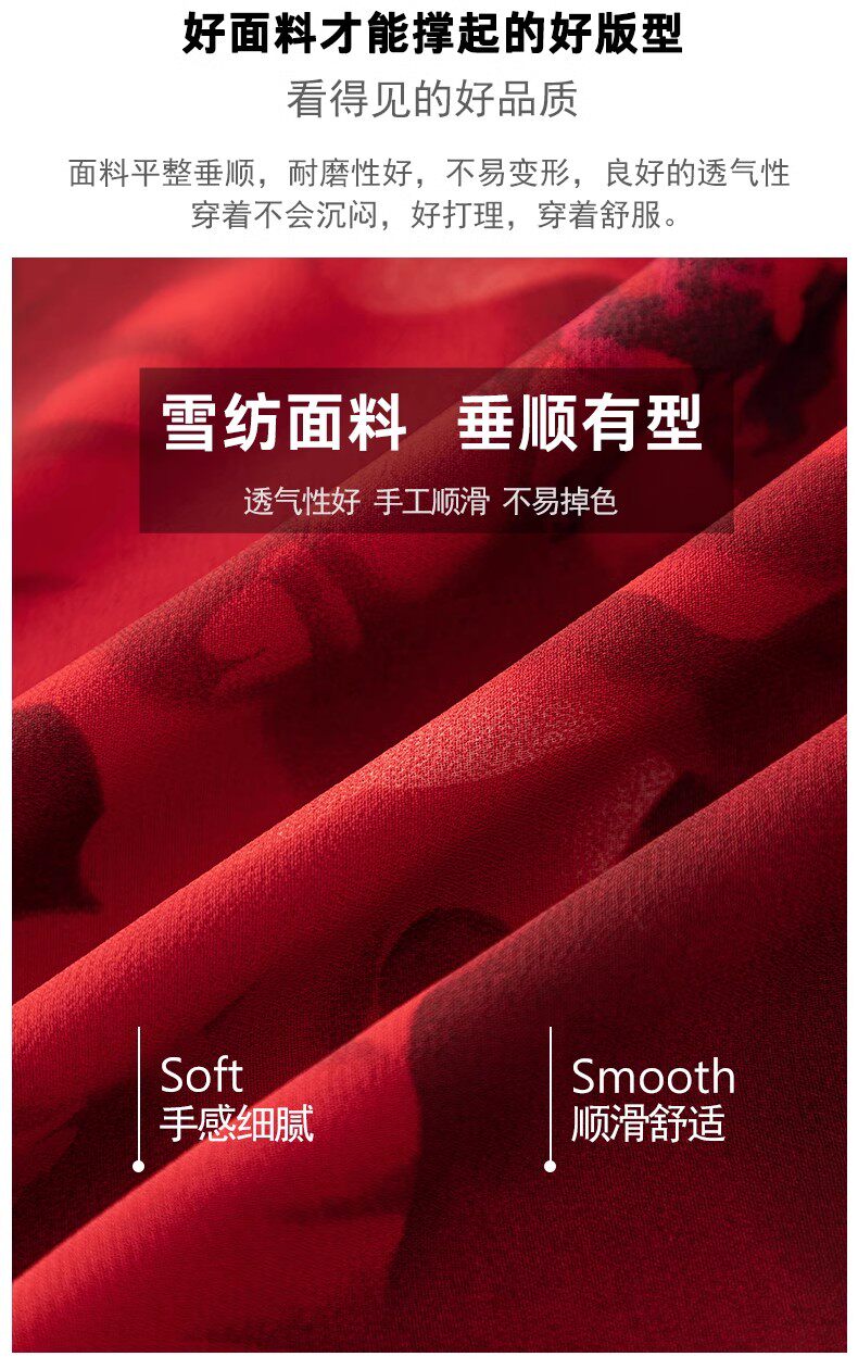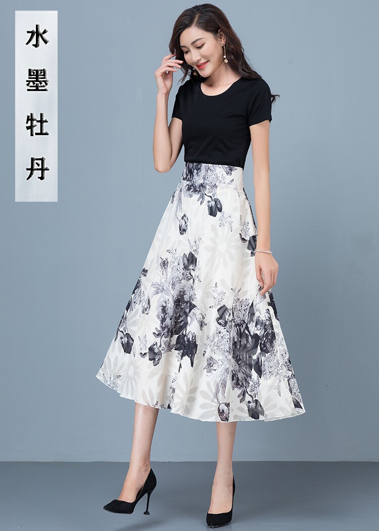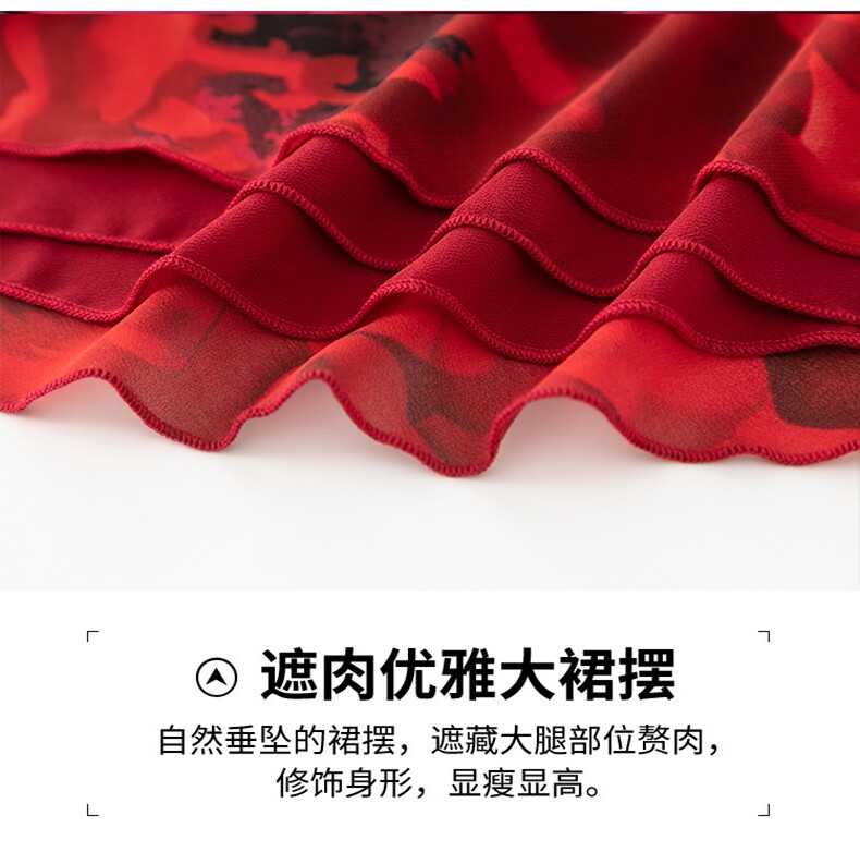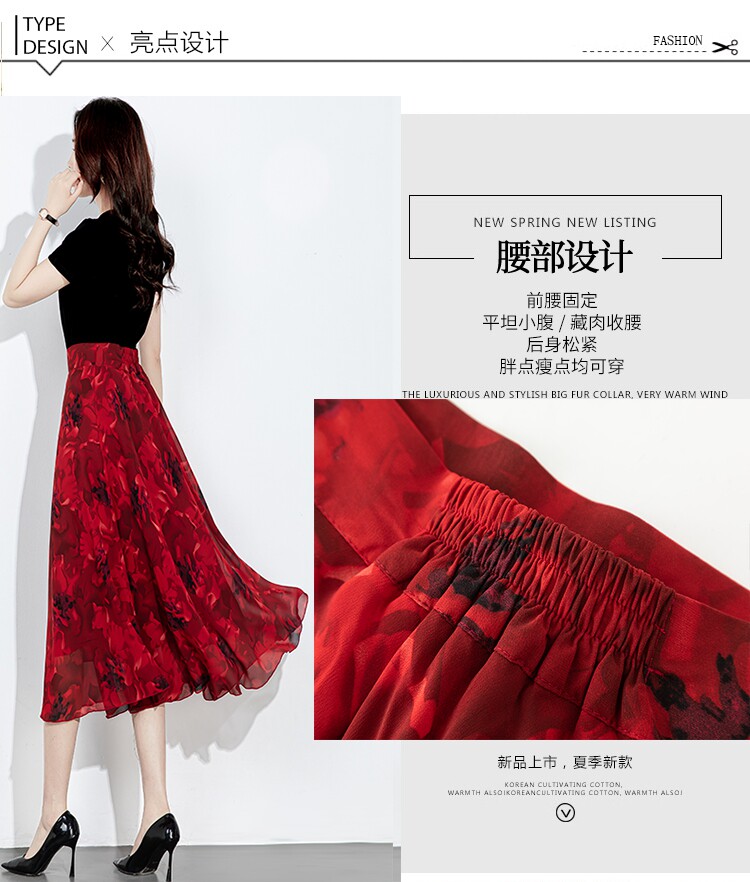 2025 New Summer Chiffon Red Ink Print Skirt for Women, High-Waisted Slim Midi Skirt, Dance Flared Skirt