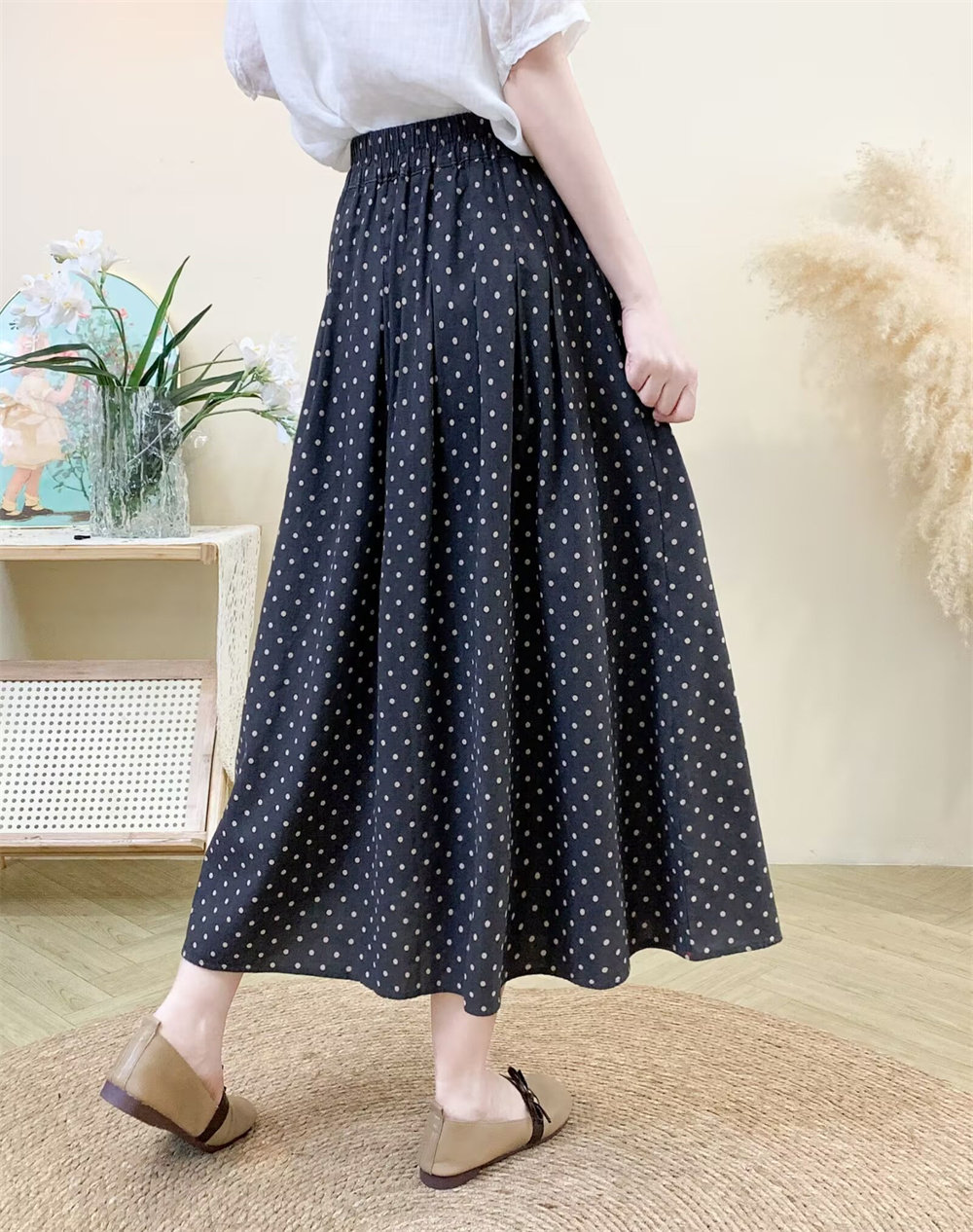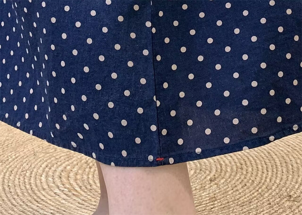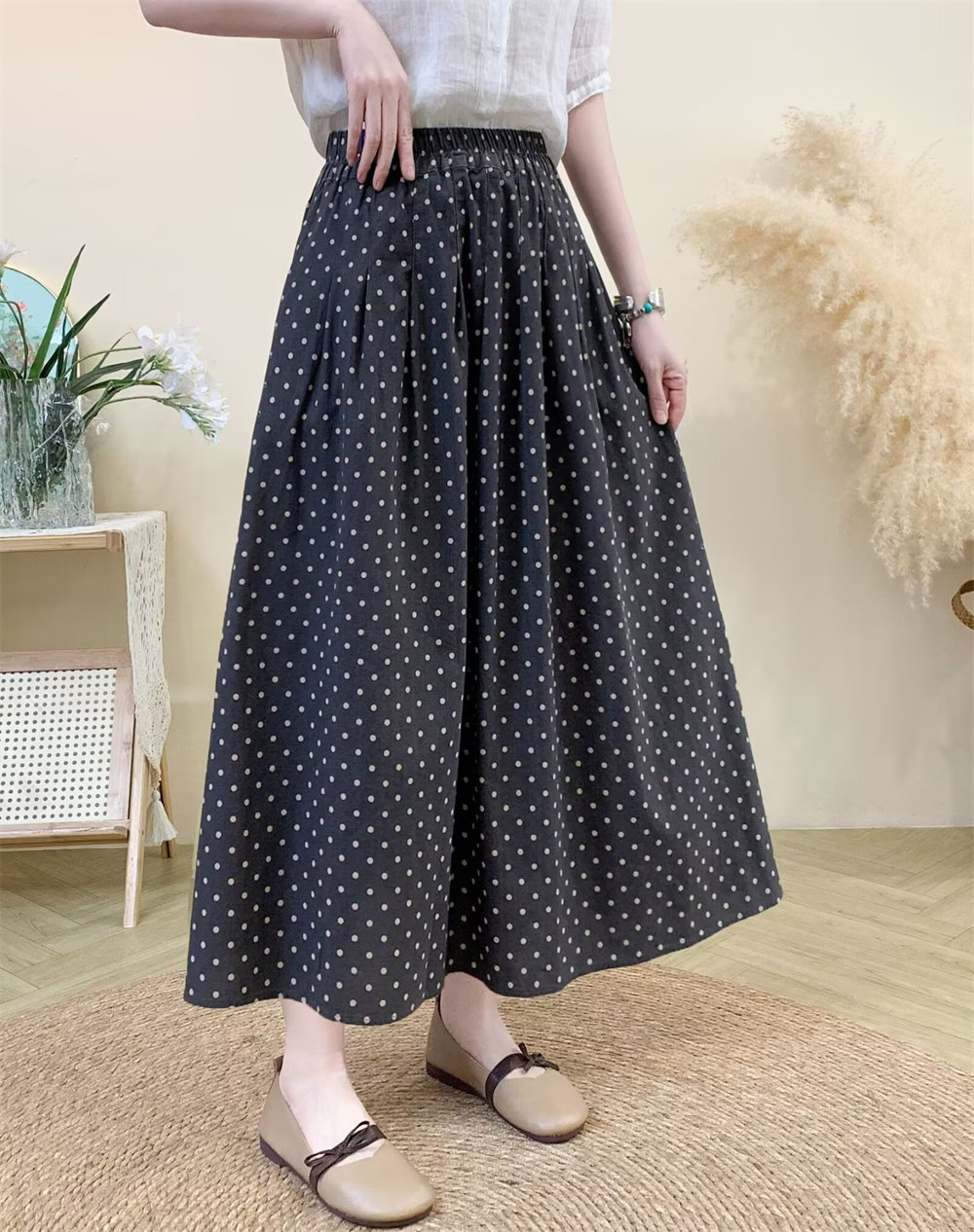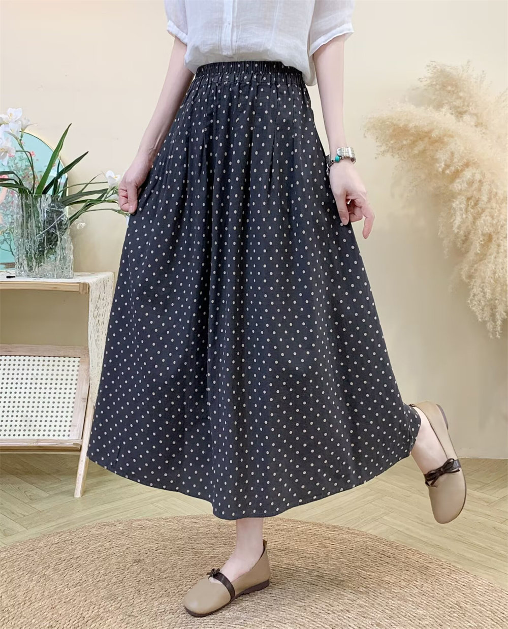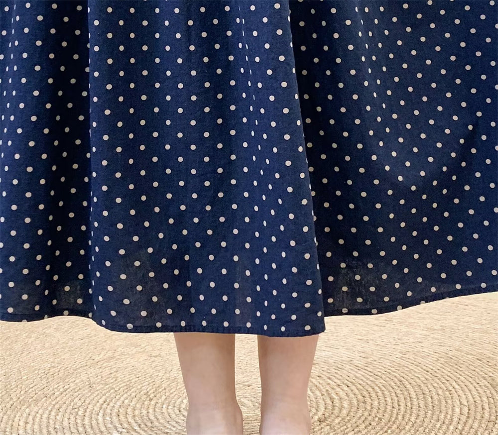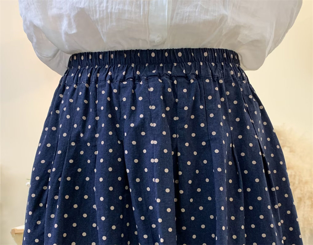 Original Artistic Cotton and Linen Polka Dot Skirt for Women, Drapey and Versatile, Cotton A-Line Skirt, Mid-Length, Petite Long Skirt