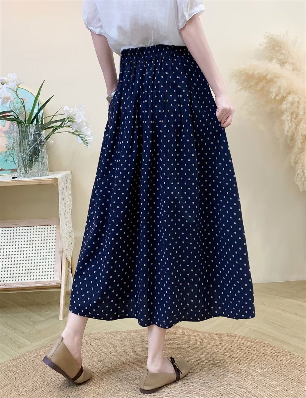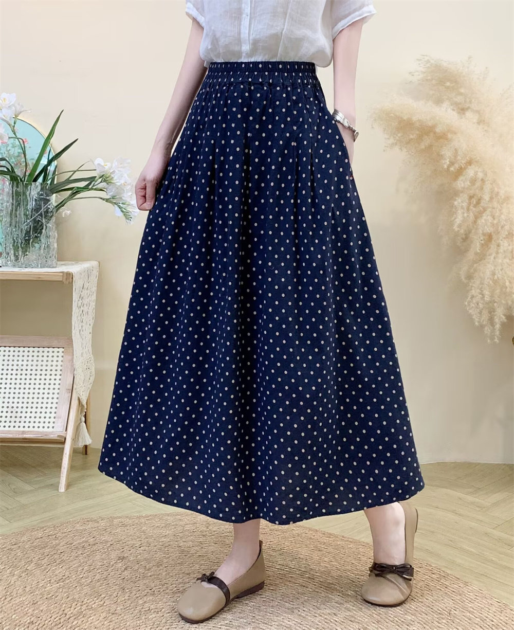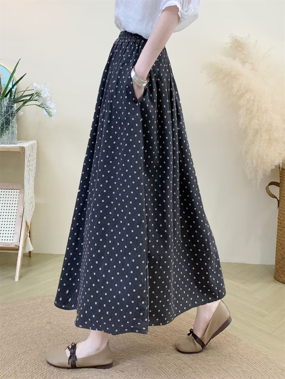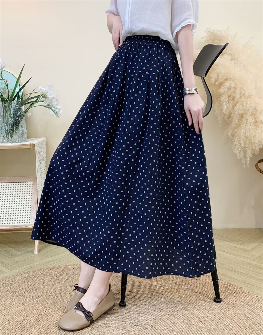 Original Artistic Cotton and Linen Polka Dot Skirt for Women, Drapey and Versatile, Cotton A-Line Skirt, Mid-Length, Petite Long Skirt