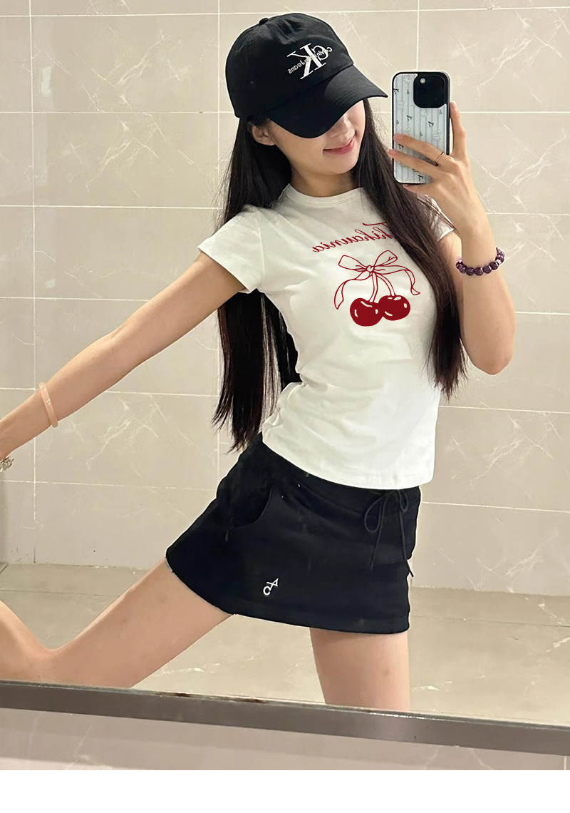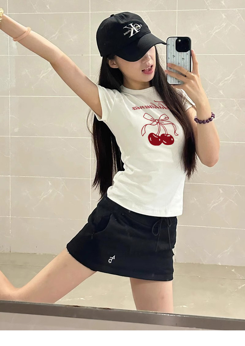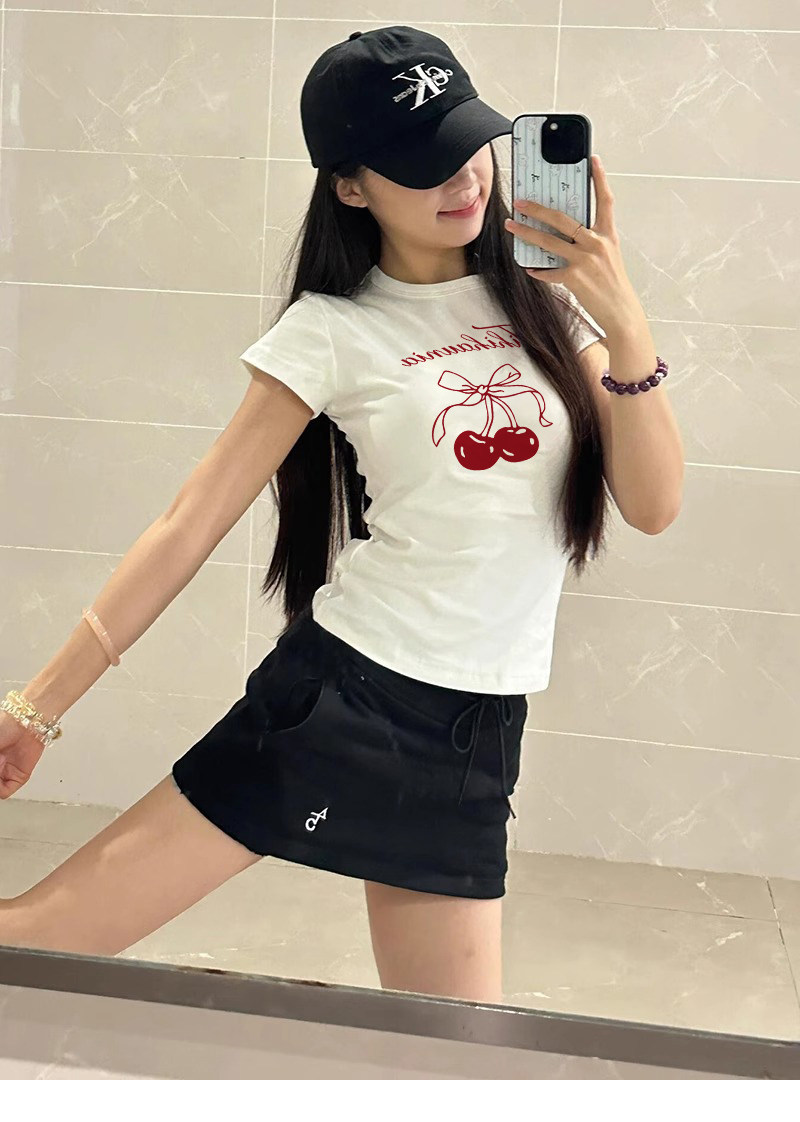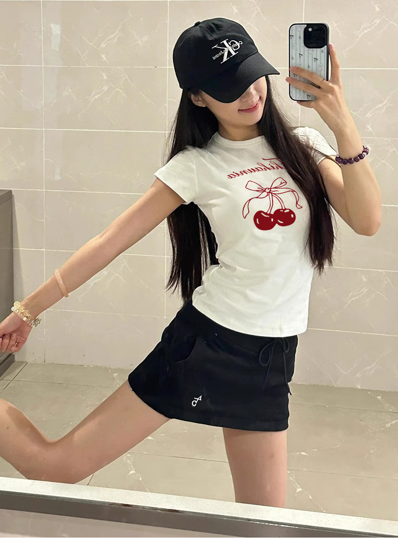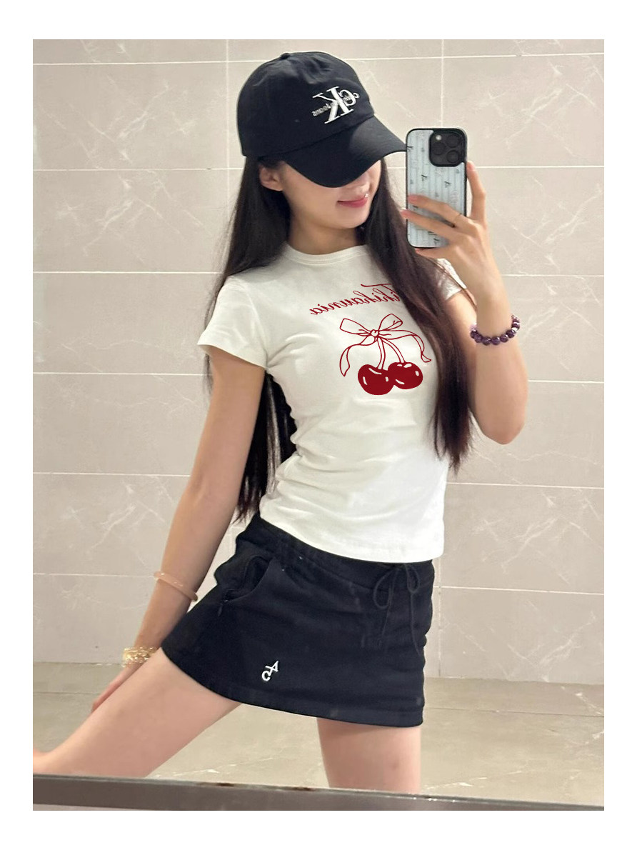 Spicy Girl Short-Sleeved T-Shirt with Cherry Print for Women, Summer 2026 New Slim-Fit Unique Niche Base Top