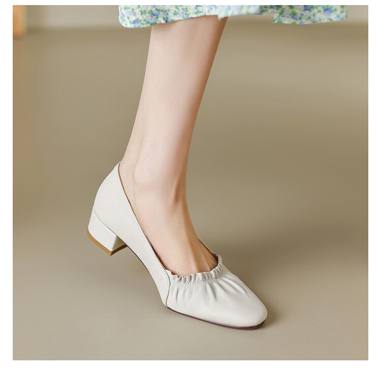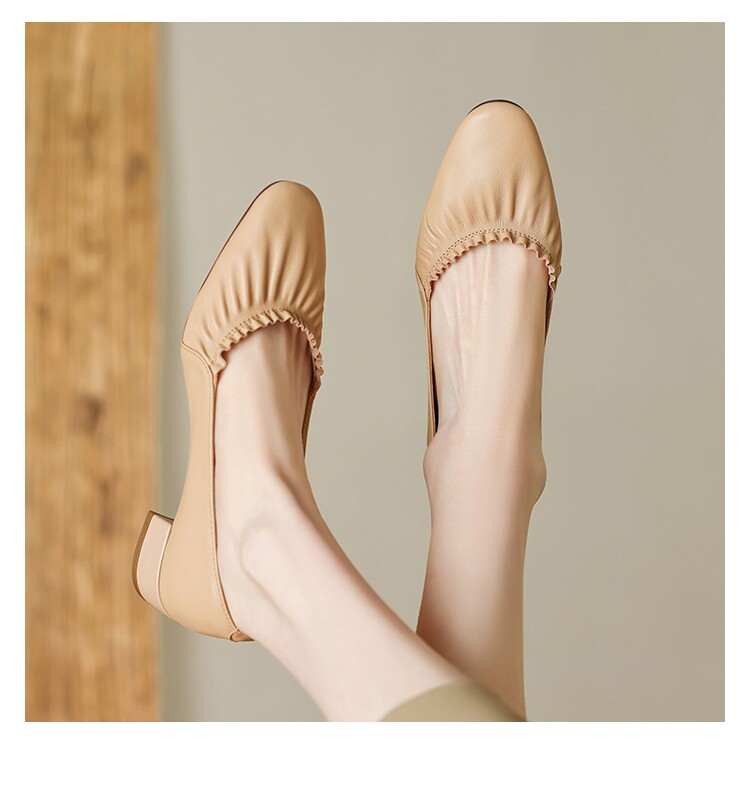 Italy Corso Venezia~ Genuine Leather Round-Toe Pleated Shallow Mouth Single Shoes for Women, New Spring Style, Versatile Thick Mid-Heel Shoes