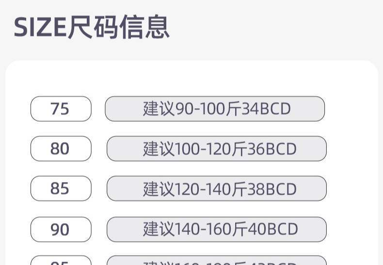 Size 34/75BCD,36/80BCD,38/85BCD,40/90BCD,42/95BCD,44/100BCD
