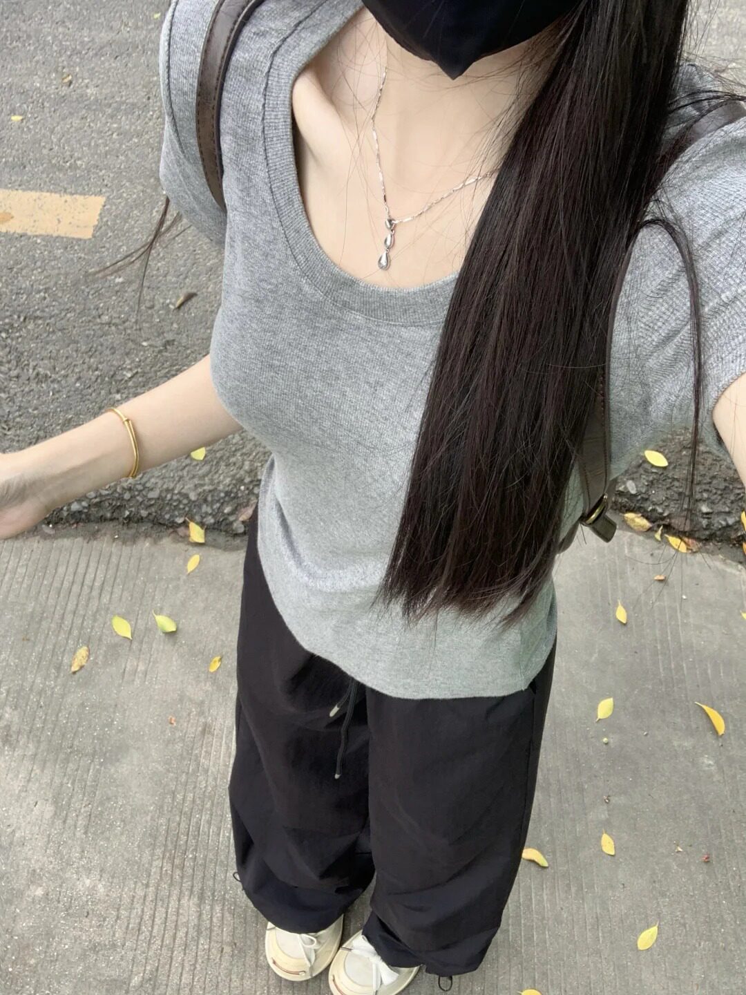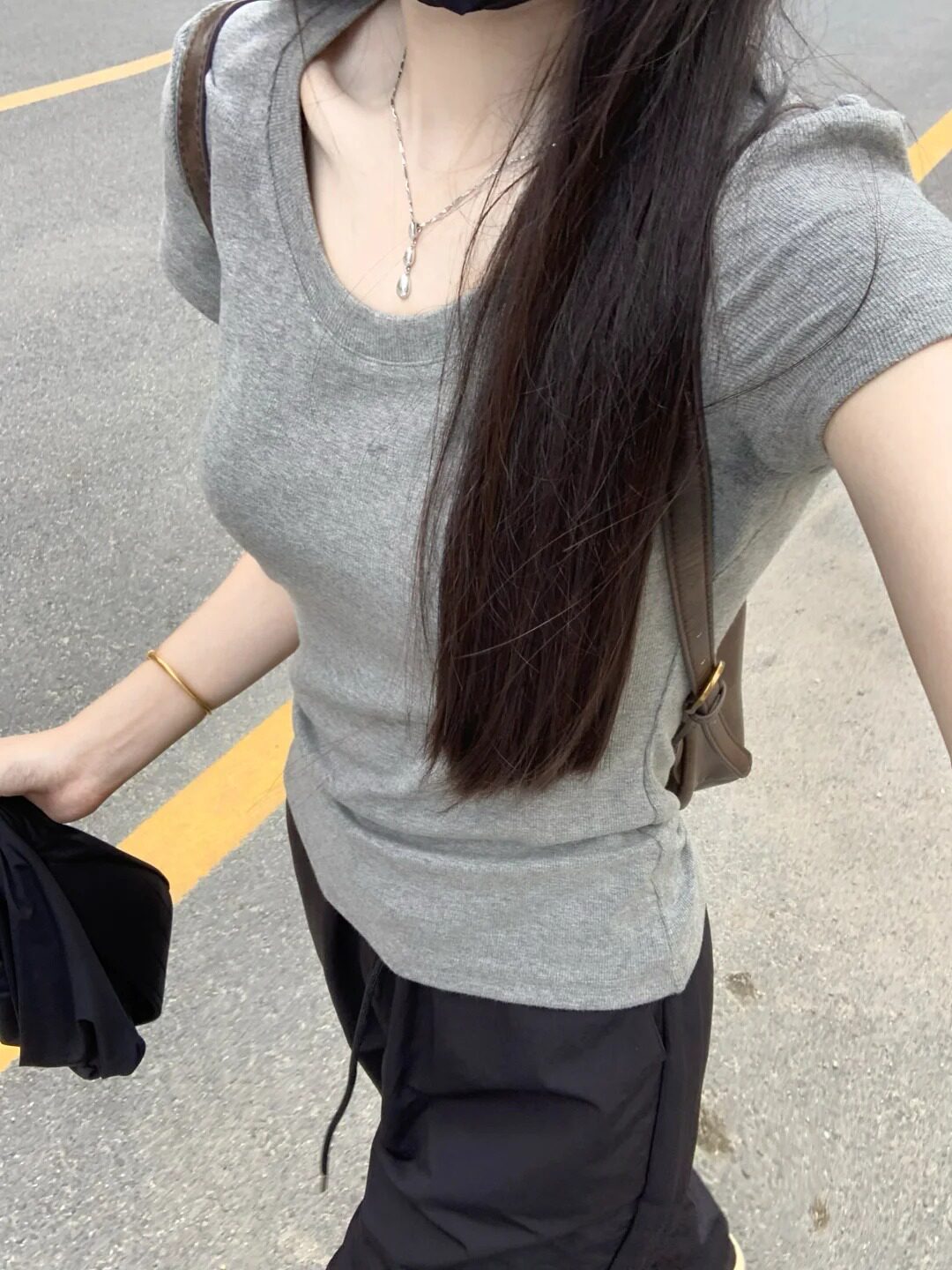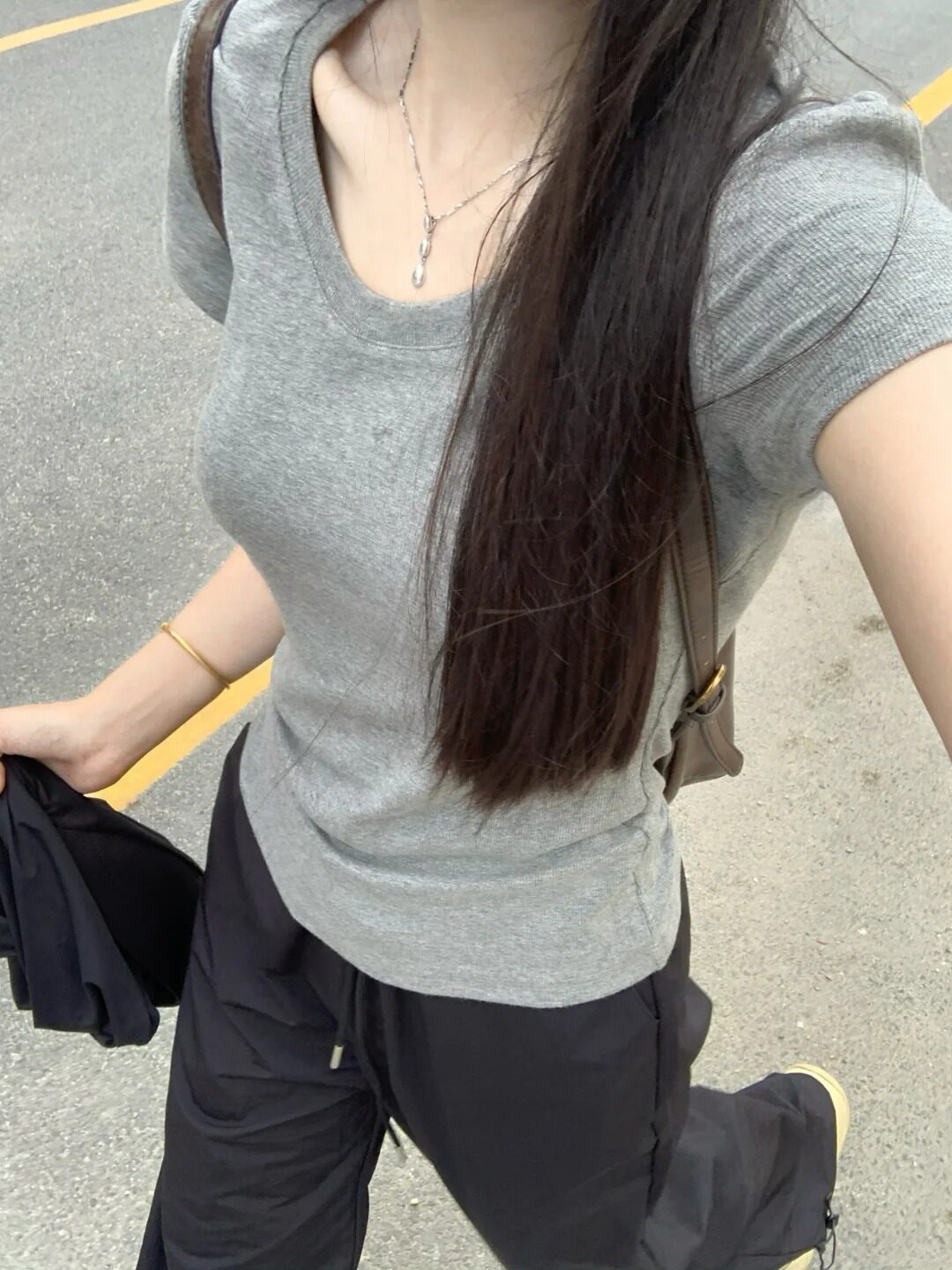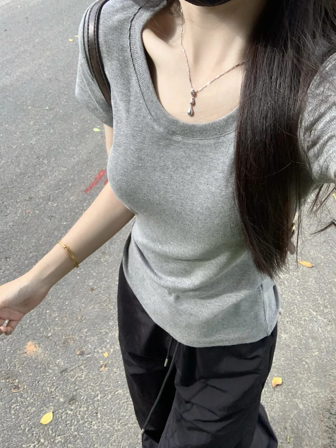 Korean-Style U-Neck Slim-Fit Short-Sleeve Top for Women, Summer Solid Color Slim-Fit Hot Girl Style Elegant Regular Shoulder T-Shirt Base Shirt