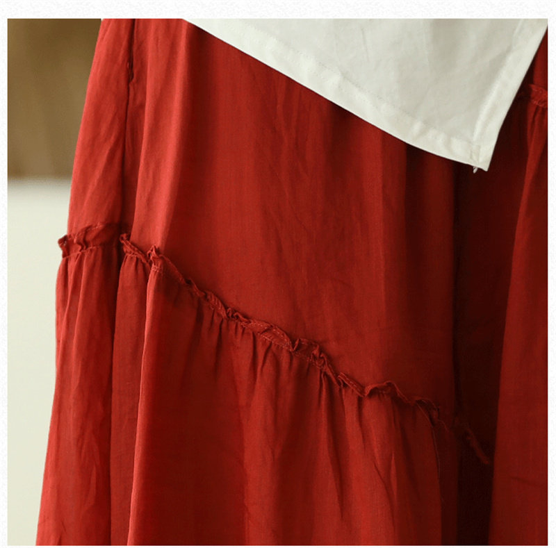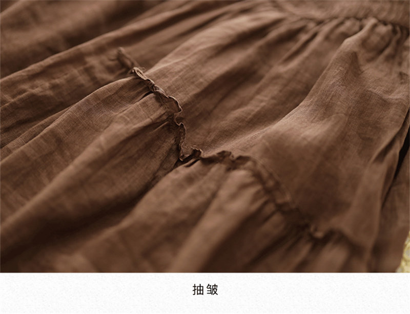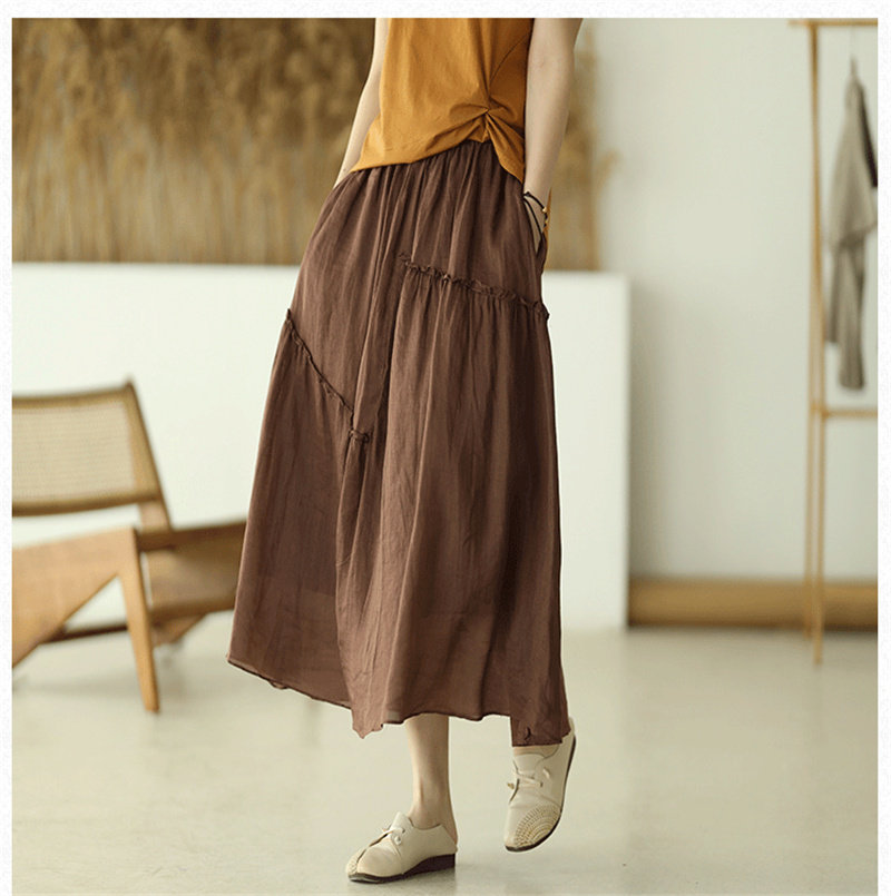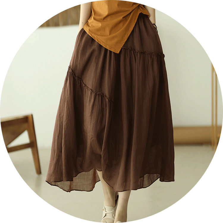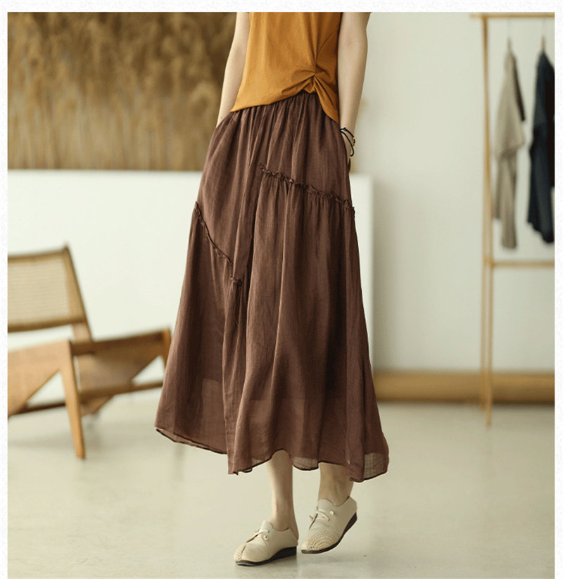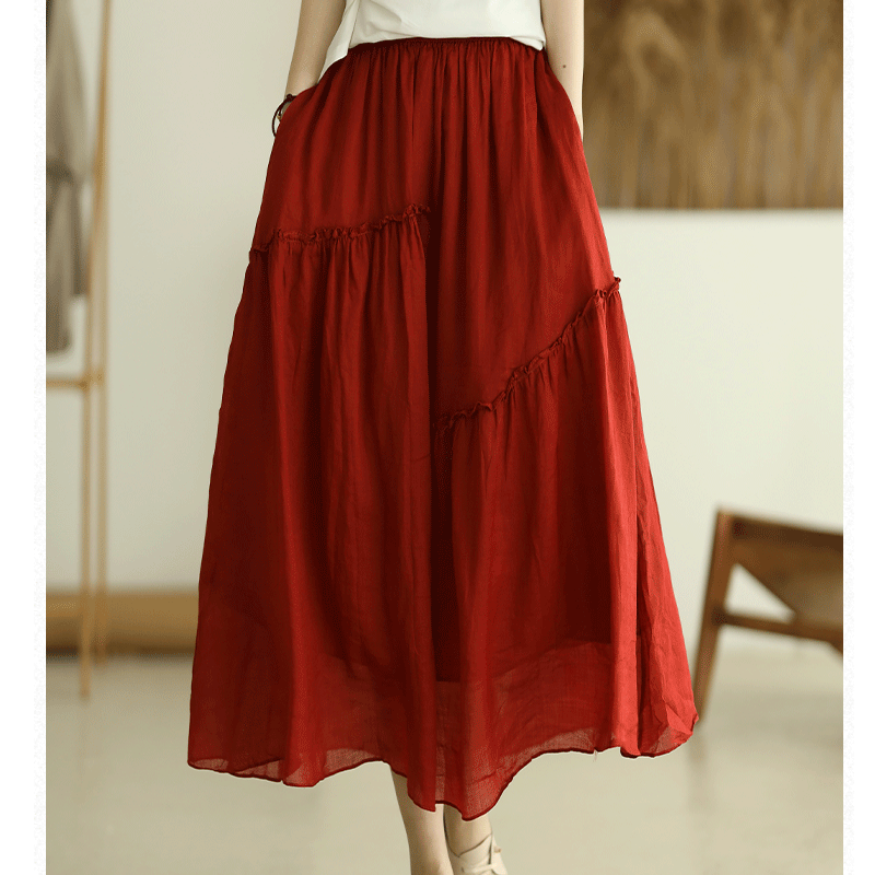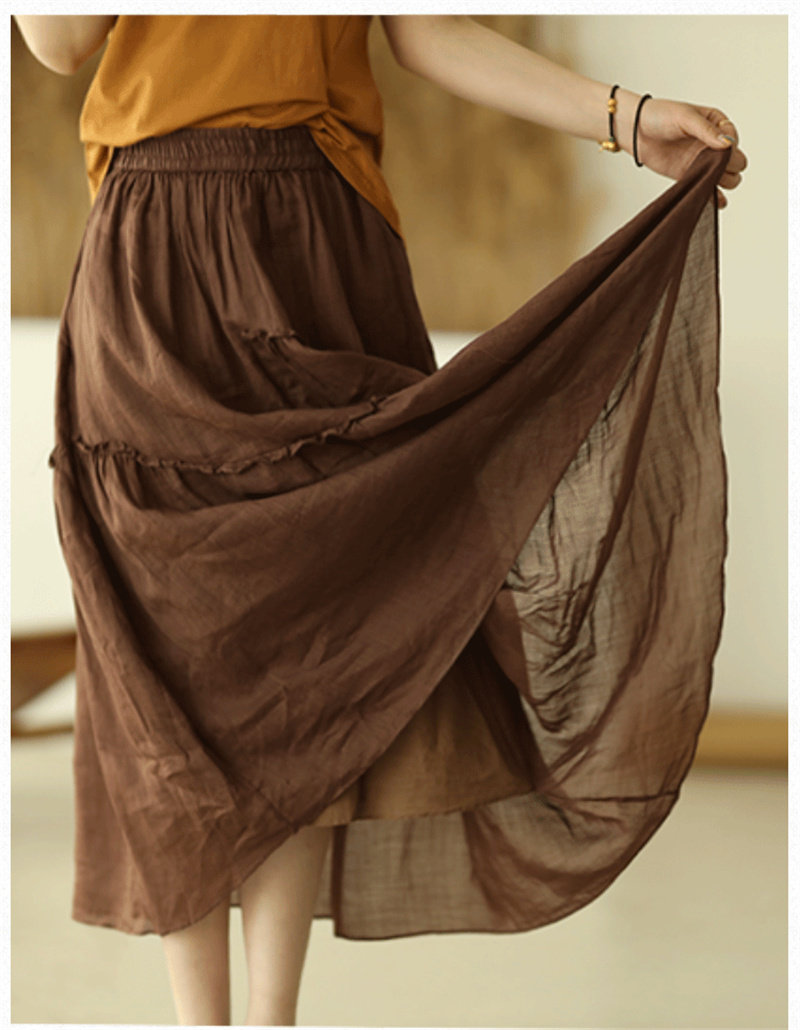 Solid Color Ramie Skirt for Women Summer Literary and Versatile Lace Fairy Elegant Double Layer Loose A-Line Long Skirt for Small People