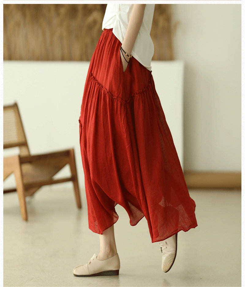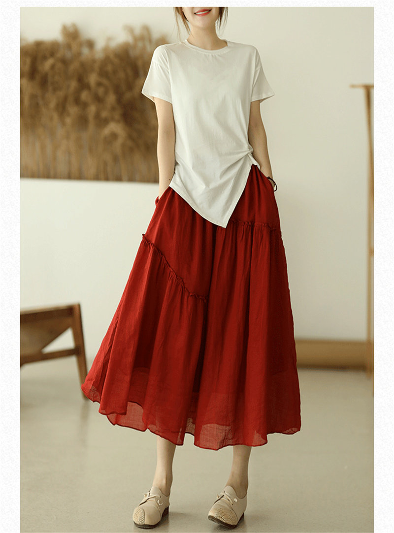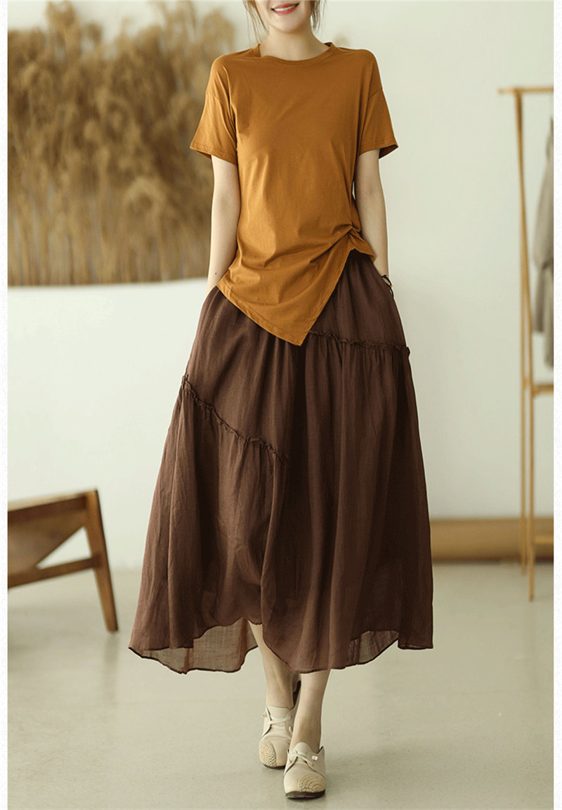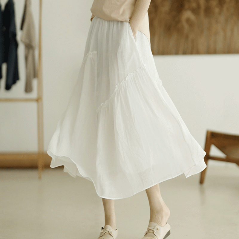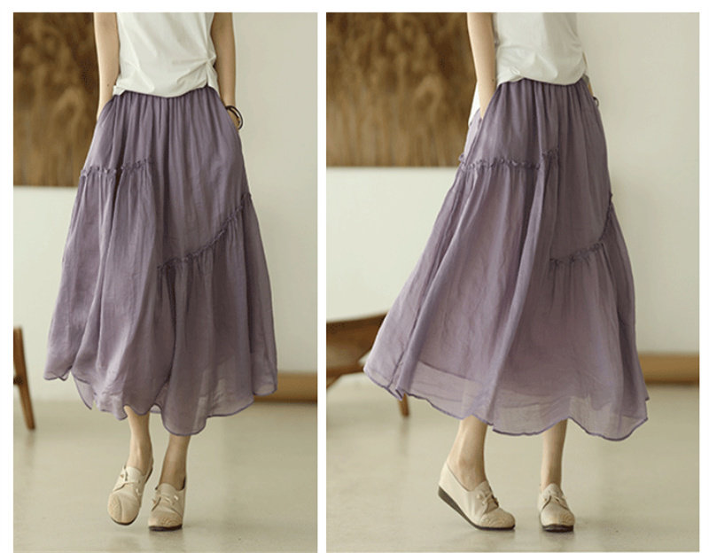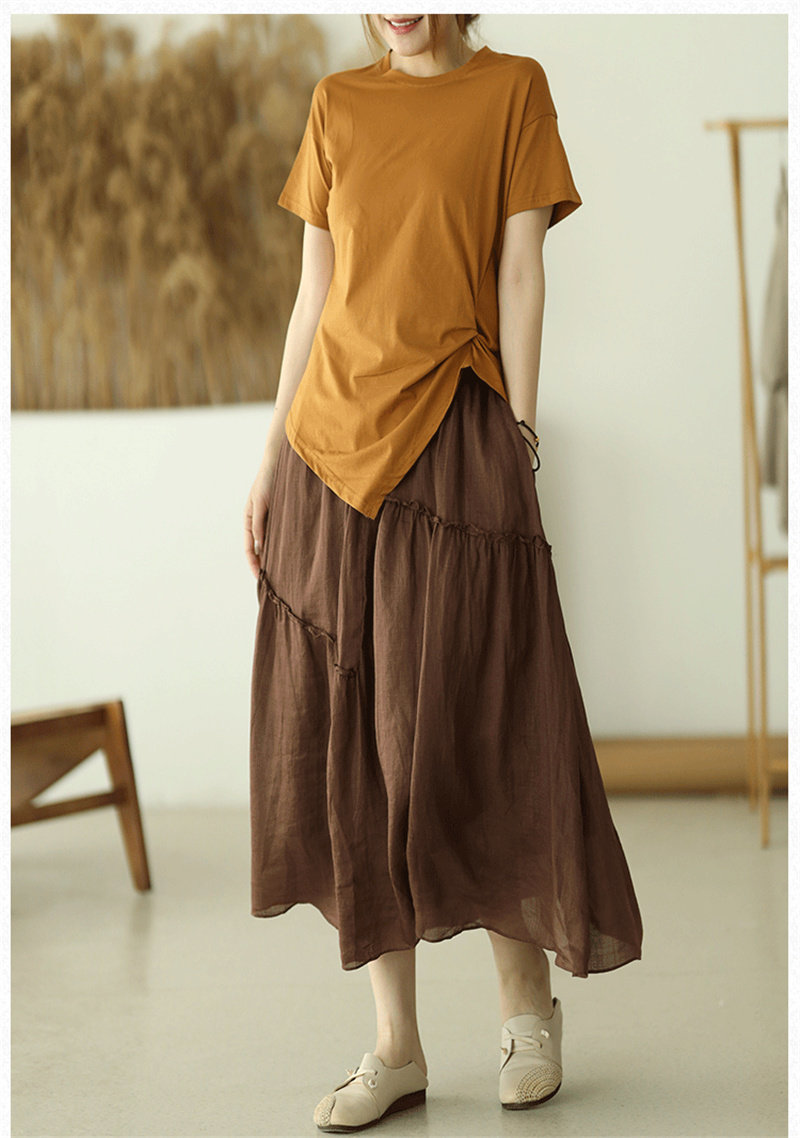 Solid Color Ramie Skirt for Women Summer Literary and Versatile Lace Fairy Elegant Double Layer Loose A-Line Long Skirt for Small People